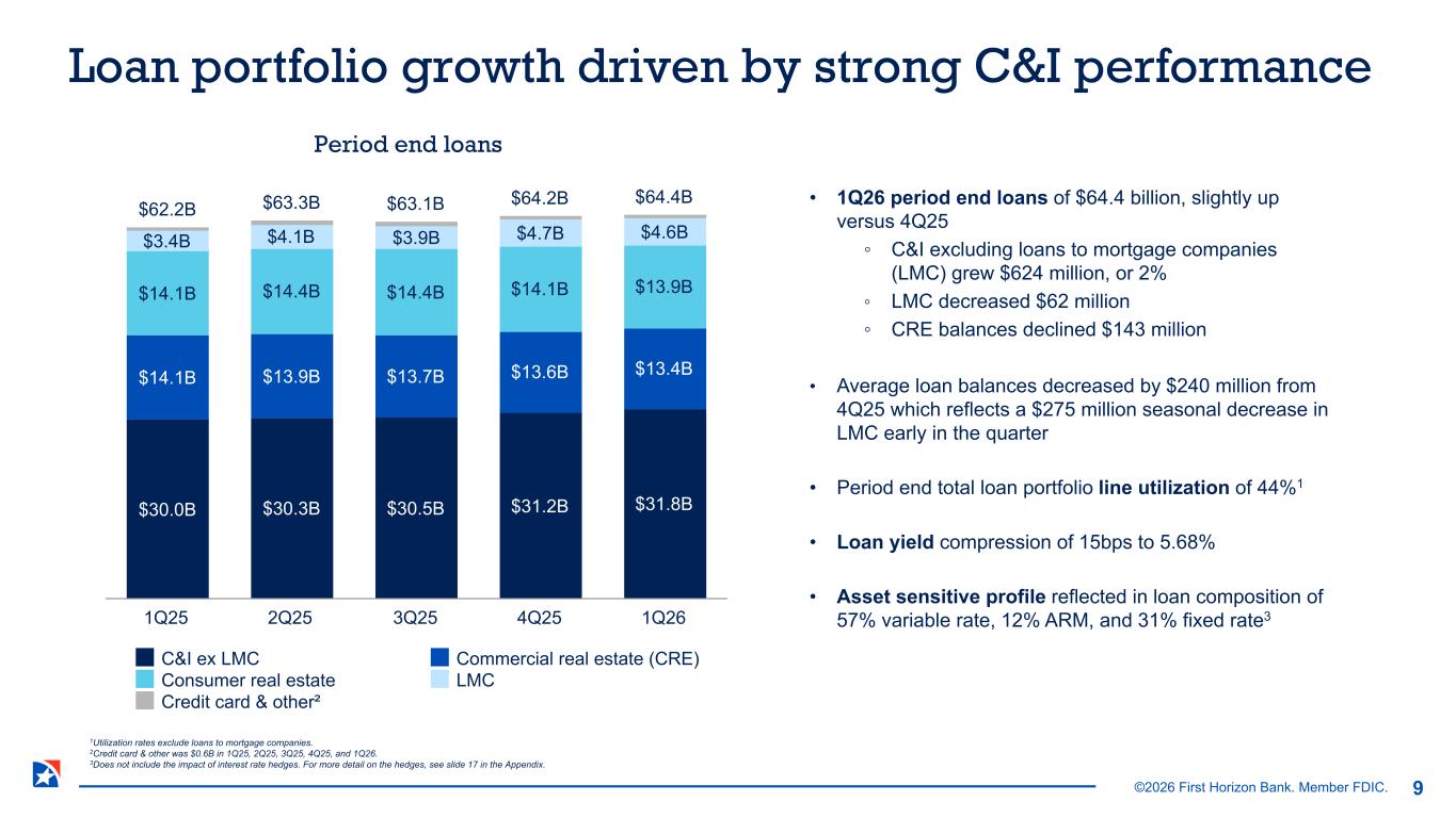 ©2026 First Horizon Bank. Member FDIC. Period end loans • 1Q26 period end loans of $64.4 billion, slightly up versus 4Q25 ◦ C&I excluding loans to mortgage companies (LMC) grew $624 million, or 2% ◦ LMC decreased $62 million ◦ CRE balances declined $143 million • Average loan balances decreased by $240 million from 4Q25 which reflects a $275 million seasonal decrease in LMC early in the quarter • Period end total loan portfolio line utilization of 44%1 • Loan yield compression of 15bps to 5.68% • Asset sensitive profile reflected in loan composition of 57% variable rate, 12% ARM, and 31% fixed rate3 $62.2B $63.3B $63.1B $64.2B $64.4B $30.0B $30.3B $30.5B $31.2B $31.8B $14.1B $13.9B $13.7B $13.6B $13.4B $14.1B $14.4B $14.4B $14.1B $13.9B $3.4B $4.1B $3.9B $4.7B $4.6B C&I ex LMC Commercial real estate (CRE) Consumer real estate LMC Credit card & other² 1Q25 2Q25 3Q25 4Q25 1Q26 Loan portfolio growth driven by strong C&I performance 1Utilization rates exclude loans to mortgage companies. 2Credit card & other was $0.6B in 1Q25, 2Q25, 3Q25, 4Q25, and 1Q26. 3Does not include the impact of interest rate hedges. For more detail on the hedges, see slide 17 in the Appendix. 9