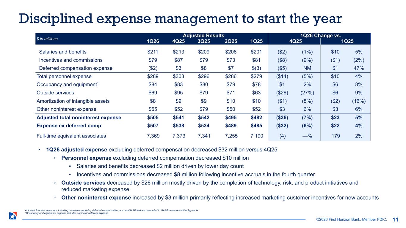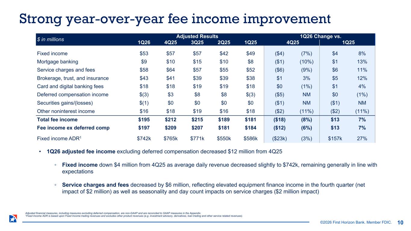 ©2026 First Horizon Bank. Member FDIC. • 1Q26 adjusted fee income excluding deferred compensation decreased $12 million from 4Q25 ◦ Fixed income down $4 million from 4Q25 as average daily revenue decreased slightly to $742k, remaining generally in line with expectations ◦ Service charges and fees decreased by $6 million, reflecting elevated equipment finance income in the fourth quarter (net impact of $2 million) as well as seasonality and day count impacts on service charges ($2 million impact) $ in millions Adjusted Results 1Q26 Change vs. 1Q26 4Q25 3Q25 2Q25 1Q25 4Q25 1Q25 Fixed income $53 $57 $57 $42 $49 ($4) (7%) $4 8% Mortgage banking $9 $10 $15 $10 $8 ($1) (10%) $1 13% Service charges and fees $58 $64 $57 $55 $52 ($6) (9%) $6 11% Brokerage, trust, and insurance $43 $41 $39 $39 $38 $1 3% $5 12% Card and digital banking fees $18 $18 $19 $19 $18 $0 (1%) $1 4% Deferred compensation income $(3) $3 $8 $8 $(3) ($5) NM $0 (1%) Securities gains/(losses) $(1) $0 $0 $0 $0 ($1) NM ($1) NM Other noninterest income $16 $18 $19 $16 $18 ($2) (11%) ($2) (11%) Total fee income $195 $212 $215 $189 $181 ($18) (8%) $13 7% Fee income ex deferred comp $197 $209 $207 $181 $184 ($12) (6%) $13 7% Fixed income ADR1 $742k $765k $771k $550k $586k ($23k) (3%) $157k 27% Strong year-over-year fee income improvement 10 Adjusted financial measures, including measures excluding deferred compensation, are non-GAAP and are reconciled to GAAP measures in the Appendix. 1Fixed Income ADR is based upon Fixed Income trading revenues and excludes other product revenues (e.g. investment advisory, derivatives, loan trading and other service related revenues).