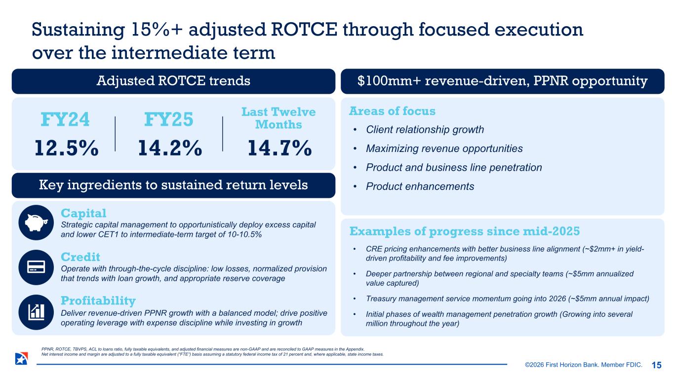 ©2026 First Horizon Bank. Member FDIC. PPNR, ROTCE, TBVPS, ACL to loans ratio, fully taxable equivalents, and adjusted financial measures are non-GAAP and are reconciled to GAAP measures in the Appendix. Net interest income and margin are adjusted to a fully taxable equivalent (“FTE”) basis assuming a statutory federal income tax of 21 percent and, where applicable, state income taxes. Key ingredients to sustained return levels Adjusted ROTCE trends FY24 12.5% FY25 14.2% Last Twelve Months 14.7% Capital Credit Profitability Strategic capital management to opportunistically deploy excess capital and lower CET1 to intermediate-term target of 10-10.5% Operate with through-the-cycle discipline: low losses, normalized provision that trends with loan growth, and appropriate reserve coverage Deliver revenue-driven PPNR growth with a balanced model; drive positive operating leverage with expense discipline while investing in growth $100mm+ revenue-driven, PPNR opportunity Areas of focus Examples of progress since mid-2025 • Client relationship growth • Maximizing revenue opportunities • Product and business line penetration • Product enhancements • CRE pricing enhancements with better business line alignment (~$2mm+ in yield- driven profitability and fee improvements) • Deeper partnership between regional and specialty teams (~$5mm annualized value captured) • Treasury management service momentum going into 2026 (~$5mm annual impact) • Initial phases of wealth management penetration growth (Growing into several million throughout the year) Sustaining 15%+ adjusted ROTCE through focused execution over the intermediate term 15