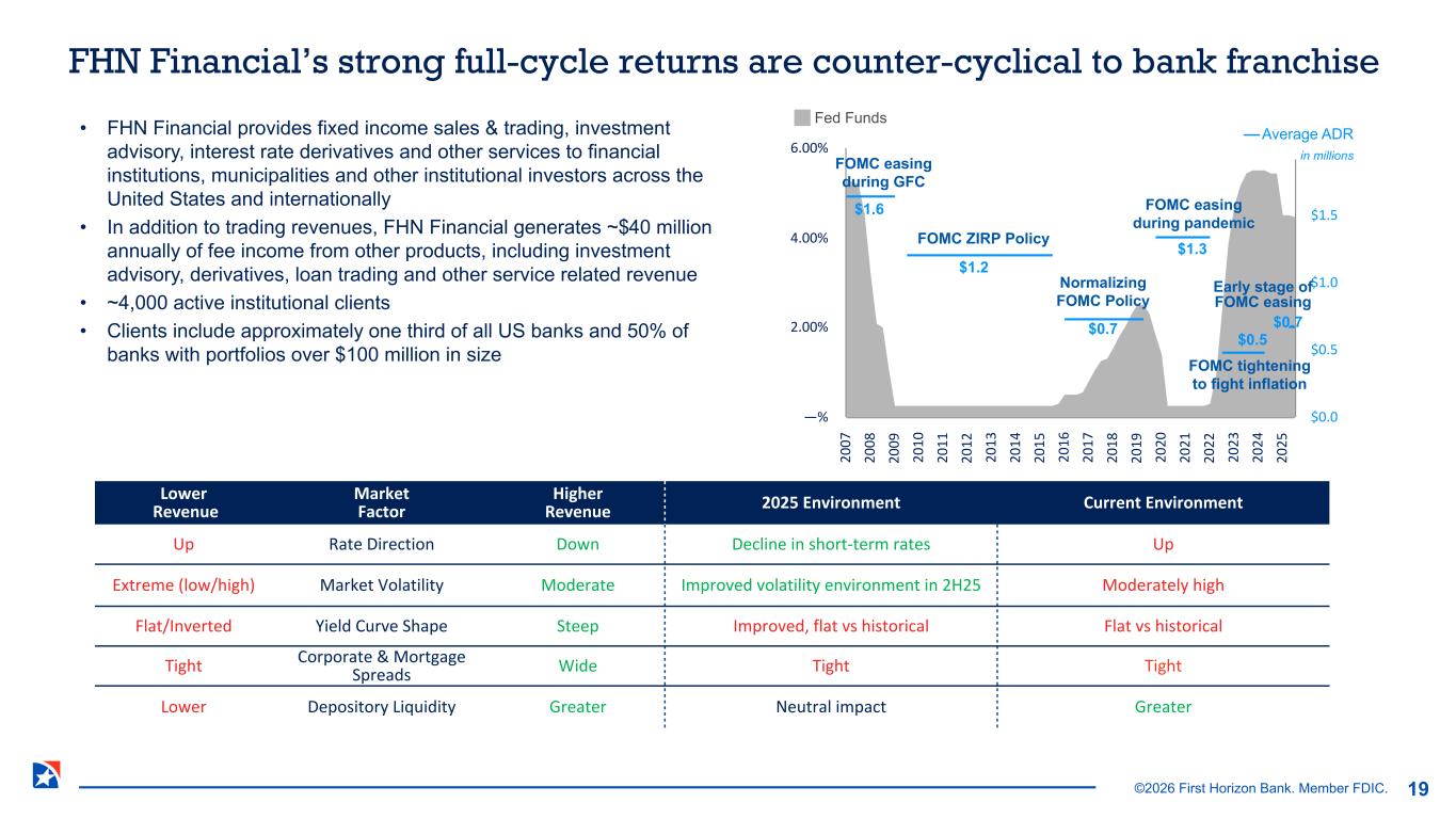 ©2026 First Horizon Bank. Member FDIC. 20 07 20 08 20 09 20 10 20 11 20 12 20 13 20 14 20 15 20 16 20 17 20 18 20 19 20 20 20 21 20 22 20 23 20 24 20 25 —% 2.00% 4.00% 6.00% $0.0 $0.5 $1.0 $1.5 $2.0 Lower Revenue Market Factor Higher Revenue 2025 Environment Current Environment Up Rate Direction Down Decline in short-term rates Up Extreme (low/high) Market Volatility Moderate Improved volatility environment in 2H25 Moderately high Flat/Inverted Yield Curve Shape Steep Improved, flat vs historical Flat vs historical Tight Corporate & Mortgage Spreads Wide Tight Tight Lower Depository Liquidity Greater Neutral impact Greater • FHN Financial provides fixed income sales & trading, investment advisory, interest rate derivatives and other services to financial institutions, municipalities and other institutional investors across the United States and internationally • In addition to trading revenues, FHN Financial generates ~$40 million annually of fee income from other products, including investment advisory, derivatives, loan trading and other service related revenue • ~4,000 active institutional clients • Clients include approximately one third of all US banks and 50% of banks with portfolios over $100 million in size FOMC easing during GFC FOMC ZIRP Policy Normalizing FOMC Policy FOMC easing during pandemic FOMC tightening to fight inflation Fed Funds Average ADR in millions $1.6 $1.2 $0.7 $1.3 $0.5 Early stage of FOMC easing $0.7 FHN Financial’s strong full-cycle returns are counter-cyclical to bank franchise 19
