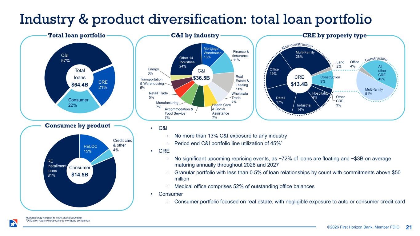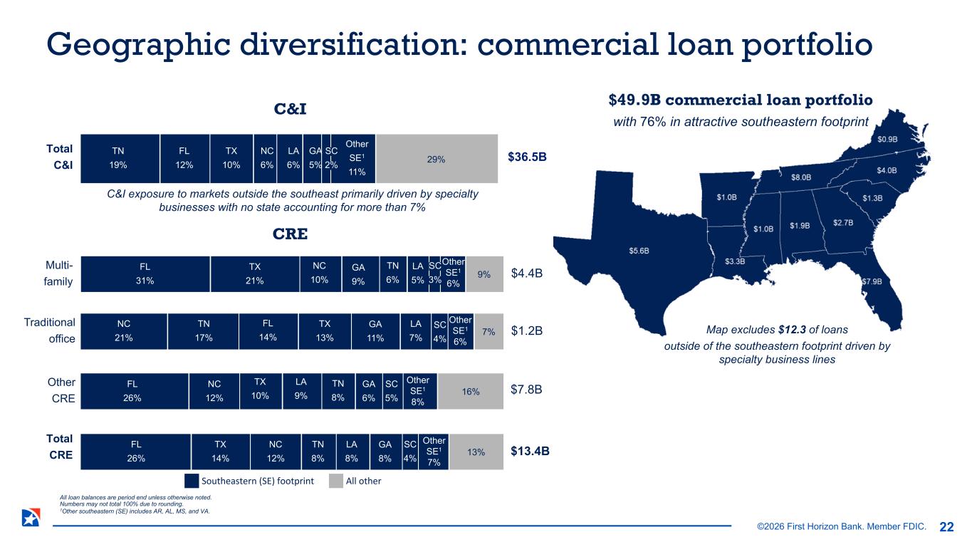 ©2026 First Horizon Bank. Member FDIC. Other 14 Industries 24% Mortgage Warehouse 13% Finance & Insurance 11% Real Estate & Leasing 11% Wholesale Trade 7% Health Care & Social Assistance 7% Accommodation & Food Service 7% Manufacturing 7% Retail Trade 5% Transportation & Warehousing 5% Energy 3% Multi-family 51% Office 4% All other CRE 45% Total loan portfolio RE installment loans 81% HELOC 15% Credit card & other 4% Total loans $64.4B Consumer $14.5B C&I $36.5B Consumer by product CRE $13.4B • C&I ◦ No more than 13% C&I exposure to any industry ◦ Period end C&I portfolio line utilization of 45%1 • CRE ◦ No significant upcoming repricing events, as ~72% of loans are floating and ~$3B on average maturing annually throughout 2026 and 2027 ◦ Granular portfolio with less than 0.5% of loan relationships by count with commitments above $50 million ◦ Medical office comprises 52% of outstanding office balances • Consumer ◦ Consumer portfolio focused on real estate, with negligible exposure to auto or consumer credit card C&I by industry Land 2% Construction 9% Other CRE 3% Hospitality 8% Industrial 14% Retail 17% Office 19% Multi-Family 28% CRE by property type CRE $13.4B C&I 57% CRE 21% Consumer 22% Industry & product diversification: total loan portfolio Numbers may not total to 100% due to rounding. 1Utilization rates exclude loans to mortgage companies. 21