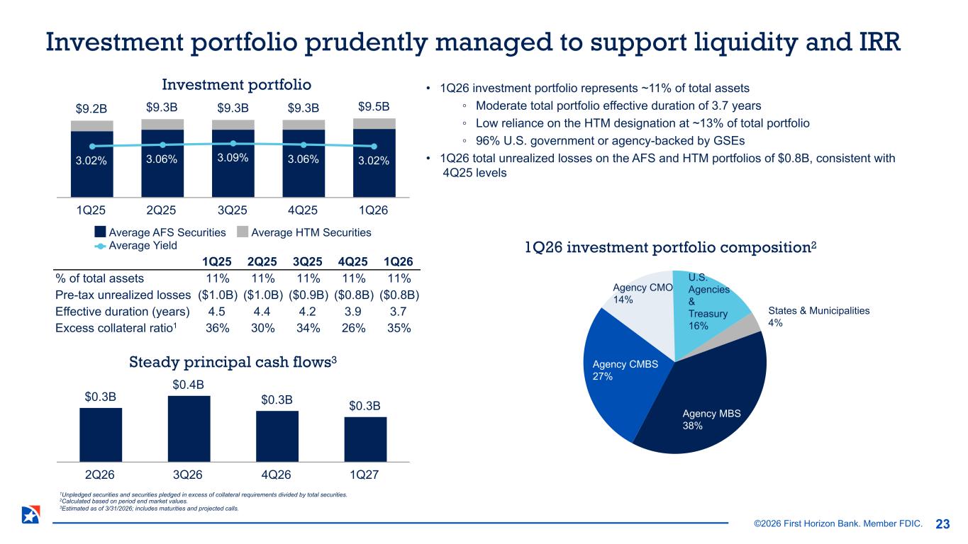 ©2026 First Horizon Bank. Member FDIC. 1Q26 investment portfolio composition2 Steady principal cash flows3 Investment portfolio $0.3B $0.4B $0.3B $0.3B 2Q26 3Q26 4Q26 1Q27 Agency MBS 38% Agency CMBS 27% Agency CMO 14% U.S. Agencies & Treasury 16% States & Municipalities 4% $9.2B $9.3B $9.3B $9.3B $9.5B 3.02% 3.06% 3.09% 3.06% 3.02% Average AFS Securities Average HTM Securities Average Yield 1Q25 2Q25 3Q25 4Q25 1Q26 • 1Q26 investment portfolio represents ~11% of total assets ◦ Moderate total portfolio effective duration of 3.7 years ◦ Low reliance on the HTM designation at ~13% of total portfolio ◦ 96% U.S. government or agency-backed by GSEs • 1Q26 total unrealized losses on the AFS and HTM portfolios of $0.8B, consistent with 4Q25 levels 1Q25 2Q25 3Q25 4Q25 1Q26 % of total assets 11% 11% 11% 11% 11% Pre-tax unrealized losses ($1.0B) ($1.0B) ($0.9B) ($0.8B) ($0.8B) Effective duration (years) 4.5 4.4 4.2 3.9 3.7 Excess collateral ratio1 36% 30% 34% 26% 35% Investment portfolio prudently managed to support liquidity and IRR 23 1Unpledged securities and securities pledged in excess of collateral requirements divided by total securities. 2Calculated based on period end market values. 3Estimated as of 3/31/2026; includes maturities and projected calls.