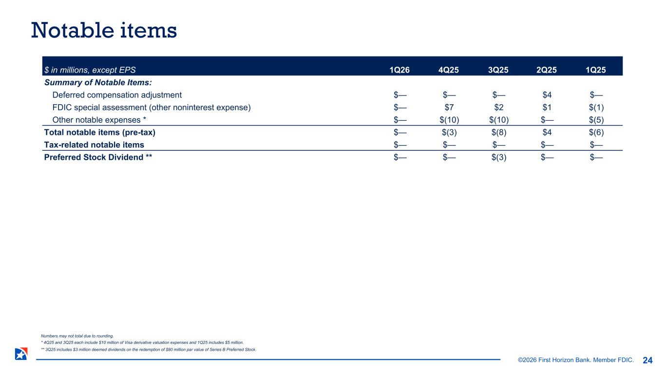 ©2026 First Horizon Bank. Member FDIC. $ in millions, except EPS 1Q26 4Q25 3Q25 2Q25 1Q25 Summary of Notable Items: Deferred compensation adjustment $— $— $— $4 $— FDIC special assessment (other noninterest expense) $— $7 $2 $1 $(1) Other notable expenses * $— $(10) $(10) $— $(5) Total notable items (pre-tax) $— $(3) $(8) $4 $(6) Tax-related notable items $— $— $— $— $— Preferred Stock Dividend ** $— $— $(3) $— $— Notable items 24 Numbers may not total due to rounding. * 4Q25 and 3Q25 each include $10 million of Visa derivative valuation expenses and 1Q25 includes $5 million. ** 3Q25 includes $3 million deemed dividends on the redemption of $80 million par value of Series B Preferred Stock.