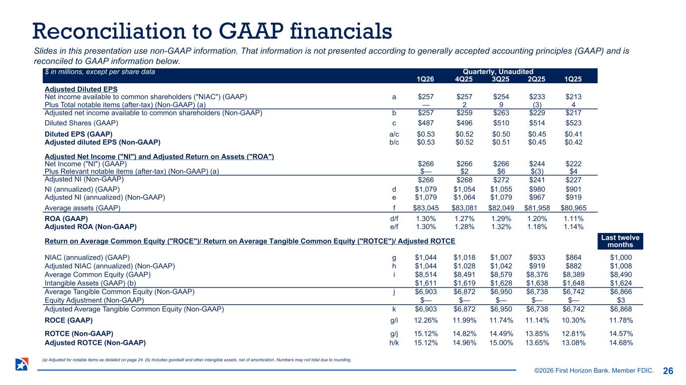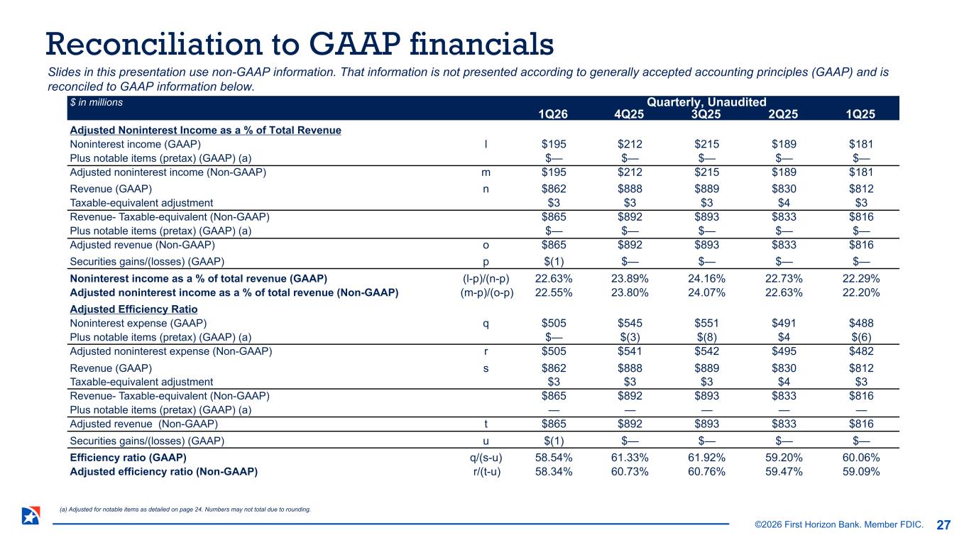 ©2026 First Horizon Bank. Member FDIC. $ in millions, except per share data Quarterly, Unaudited 1Q26 4Q25 3Q25 2Q25 1Q25 Adjusted Diluted EPS Net income available to common shareholders ("NIAC") (GAAP) a $257 $257 $254 $233 $213 Plus Total notable items (after-tax) (Non-GAAP) (a) — 2 9 (3) 4 Adjusted net income available to common shareholders (Non-GAAP) b $257 $259 $263 $229 $217 Diluted Shares (GAAP) c $487 $496 $510 $514 $523 Diluted EPS (GAAP) a/c $0.53 $0.52 $0.50 $0.45 $0.41 Adjusted diluted EPS (Non-GAAP) b/c $0.53 $0.52 $0.51 $0.45 $0.42 Adjusted Net Income ("NI") and Adjusted Return on Assets ("ROA") Net Income ("NI") (GAAP) $266 $266 $266 $244 $222 Plus Relevant notable items (after-tax) (Non-GAAP) (a) $— $2 $6 $(3) $4 Adjusted NI (Non-GAAP) $266 $268 $272 $241 $227 NI (annualized) (GAAP) d $1,079 $1,054 $1,055 $980 $901 Adjusted NI (annualized) (Non-GAAP) e $1,079 $1,064 $1,079 $967 $919 Average assets (GAAP) f $83,045 $83,081 $82,049 $81,958 $80,965 ROA (GAAP) d/f 1.30% 1.27% 1.29% 1.20% 1.11% Adjusted ROA (Non-GAAP) e/f 1.30% 1.28% 1.32% 1.18% 1.14% Return on Average Common Equity ("ROCE")/ Return on Average Tangible Common Equity ("ROTCE")/ Adjusted ROTCE Last twelve months NIAC (annualized) (GAAP) g $1,044 $1,018 $1,007 $933 $864 $1,000 Adjusted NIAC (annualized) (Non-GAAP) h $1,044 $1,028 $1,042 $919 $882 $1,008 Average Common Equity (GAAP) i $8,514 $8,491 $8,579 $8,376 $8,389 $8,490 Intangible Assets (GAAP) (b) $1,611 $1,619 $1,628 $1,638 $1,648 $1,624 Average Tangible Common Equity (Non-GAAP) j $6,903 $6,872 $6,950 $6,738 $6,742 $6,866 Equity Adjustment (Non-GAAP) $— $— $— $— $— $3 Adjusted Average Tangible Common Equity (Non-GAAP) k $6,903 $6,872 $6,950 $6,738 $6,742 $6,868 ROCE (GAAP) g/i 12.26% 11.99% 11.74% 11.14% 10.30% 11.78% ROTCE (Non-GAAP) g/j 15.12% 14.82% 14.49% 13.85% 12.81% 14.57% Adjusted ROTCE (Non-GAAP) h/k 15.12% 14.96% 15.00% 13.65% 13.08% 14.68% Slides in this presentation use non-GAAP information. That information is not presented according to generally accepted accounting principles (GAAP) and is reconciled to GAAP information below. Reconciliation to GAAP financials 26 (a) Adjusted for notable items as detailed on page 24. (b) Includes goodwill and other intangible assets, net of amortization. Numbers may not total due to rounding.