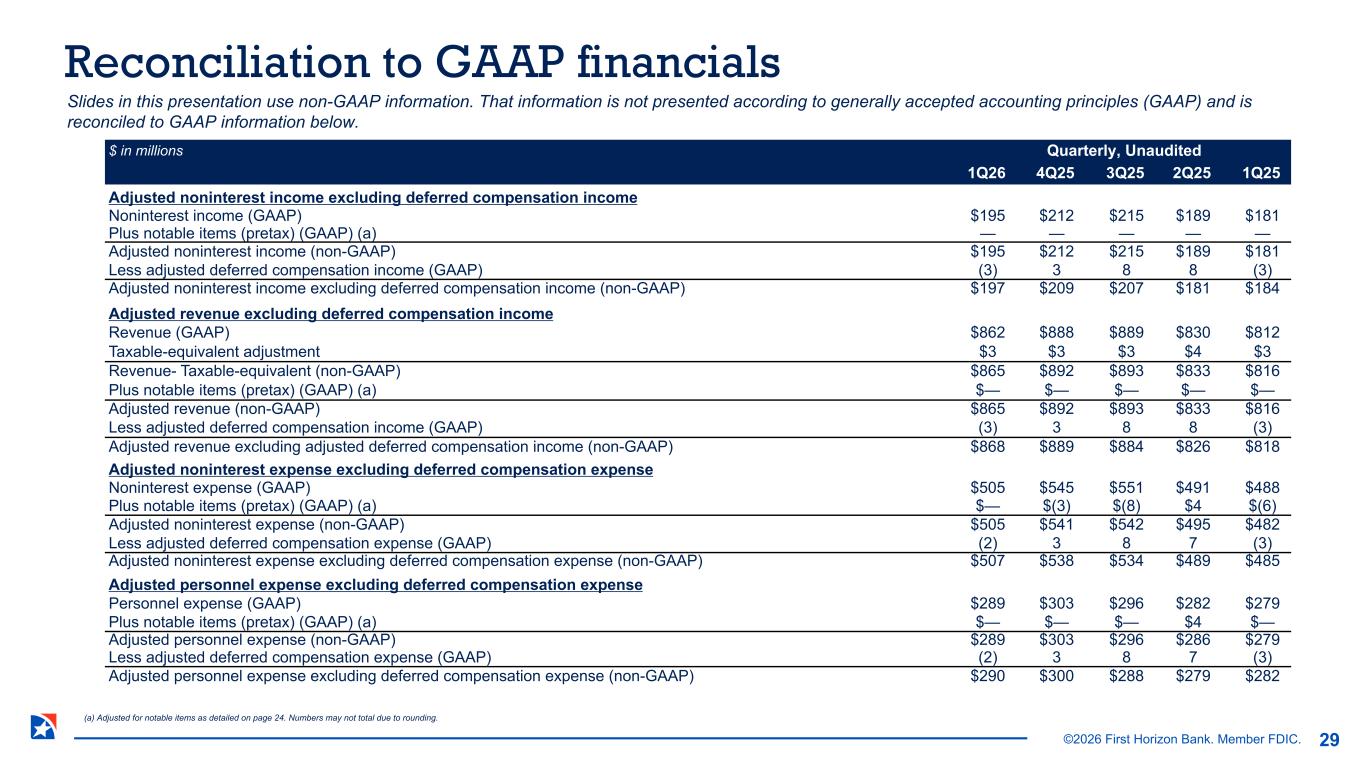 ©2026 First Horizon Bank. Member FDIC. $ in millions Quarterly, Unaudited 1Q26 4Q25 3Q25 2Q25 1Q25 Adjusted noninterest income excluding deferred compensation income Noninterest income (GAAP) $195 $212 $215 $189 $181 Plus notable items (pretax) (GAAP) (a) — — — — — Adjusted noninterest income (non-GAAP) $195 $212 $215 $189 $181 Less adjusted deferred compensation income (GAAP) (3) 3 8 8 (3) Adjusted noninterest income excluding deferred compensation income (non-GAAP) $197 $209 $207 $181 $184 Adjusted revenue excluding deferred compensation income Revenue (GAAP) $862 $888 $889 $830 $812 Taxable-equivalent adjustment $3 $3 $3 $4 $3 Revenue- Taxable-equivalent (non-GAAP) $865 $892 $893 $833 $816 Plus notable items (pretax) (GAAP) (a) $— $— $— $— $— Adjusted revenue (non-GAAP) $865 $892 $893 $833 $816 Less adjusted deferred compensation income (GAAP) (3) 3 8 8 (3) Adjusted revenue excluding adjusted deferred compensation income (non-GAAP) $868 $889 $884 $826 $818 Adjusted noninterest expense excluding deferred compensation expense Noninterest expense (GAAP) $505 $545 $551 $491 $488 Plus notable items (pretax) (GAAP) (a) $— $(3) $(8) $4 $(6) Adjusted noninterest expense (non-GAAP) $505 $541 $542 $495 $482 Less adjusted deferred compensation expense (GAAP) (2) 3 8 7 (3) Adjusted noninterest expense excluding deferred compensation expense (non-GAAP) $507 $538 $534 $489 $485 Adjusted personnel expense excluding deferred compensation expense Personnel expense (GAAP) $289 $303 $296 $282 $279 Plus notable items (pretax) (GAAP) (a) $— $— $— $4 $— Adjusted personnel expense (non-GAAP) $289 $303 $296 $286 $279 Less adjusted deferred compensation expense (GAAP) (2) 3 8 7 (3) Adjusted personnel expense excluding deferred compensation expense (non-GAAP) $290 $300 $288 $279 $282 Slides in this presentation use non-GAAP information. That information is not presented according to generally accepted accounting principles (GAAP) and is reconciled to GAAP information below. Reconciliation to GAAP financials (a) Adjusted for notable items as detailed on page 24. Numbers may not total due to rounding. 29