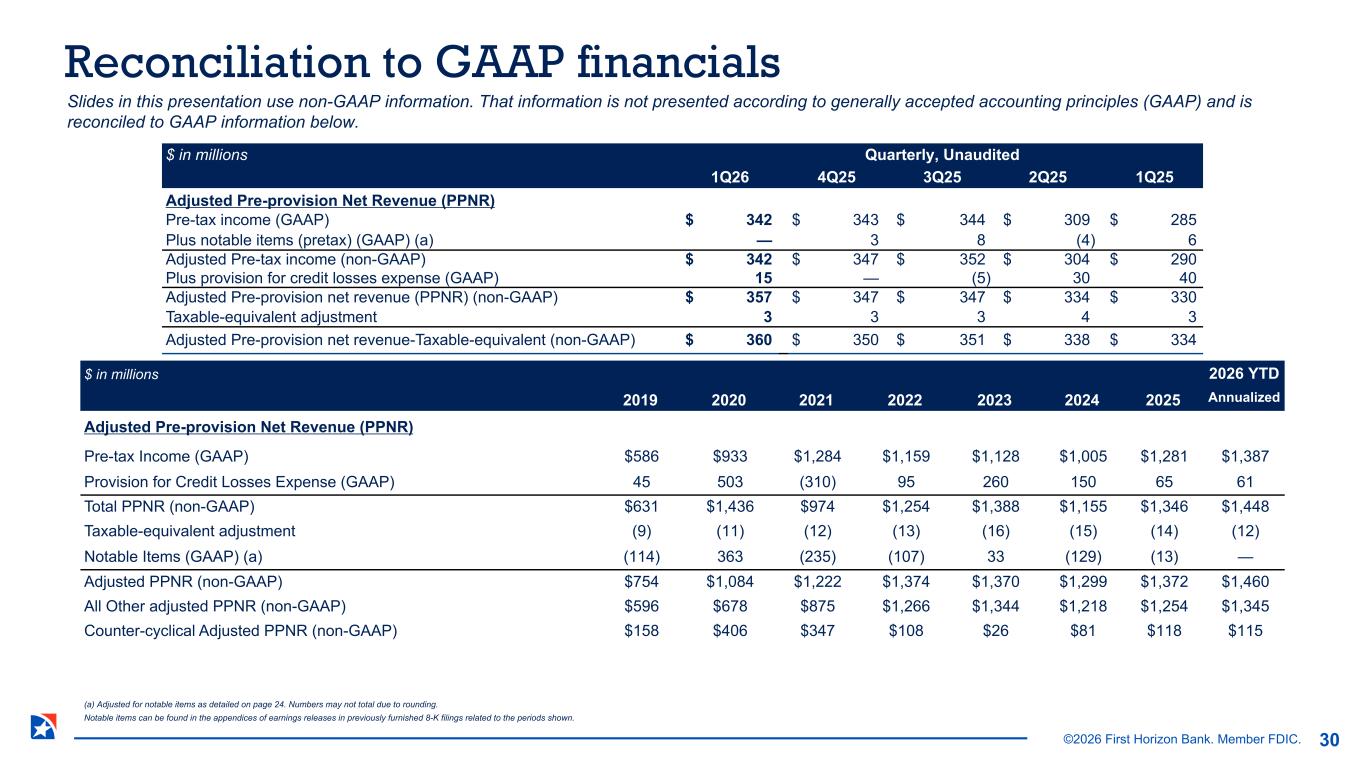 ©2026 First Horizon Bank. Member FDIC. $ in millions Quarterly, Unaudited 1Q26 4Q25 3Q25 2Q25 1Q25 Adjusted Pre-provision Net Revenue (PPNR) Pre-tax income (GAAP) $ 342 $ 343 $ 344 $ 309 $ 285 Plus notable items (pretax) (GAAP) (a) — 3 8 (4) 6 Adjusted Pre-tax income (non-GAAP) $ 342 $ 347 $ 352 $ 304 $ 290 Plus provision for credit losses expense (GAAP) 15 — (5) 30 40 Adjusted Pre-provision net revenue (PPNR) (non-GAAP) $ 357 $ 347 $ 347 $ 334 $ 330 Taxable-equivalent adjustment 3 3 3 4 3 Adjusted Pre-provision net revenue-Taxable-equivalent (non-GAAP) $ 360 $ 350 $ 351 $ 338 $ 334 $ in millions 2024 2025 2026 YTD 2019 2020 2021 2022 2023 Annualized Adjusted Pre-provision Net Revenue (PPNR) Pre-tax Income (GAAP) $586 $933 $1,284 $1,159 $1,128 $1,005 $1,281 $1,387 Provision for Credit Losses Expense (GAAP) 45 503 (310) 95 260 150 65 61 Total PPNR (non-GAAP) $631 $1,436 $974 $1,254 $1,388 $1,155 $1,346 $1,448 Taxable-equivalent adjustment (9) (11) (12) (13) (16) (15) (14) (12) Notable Items (GAAP) (a) (114) 363 (235) (107) 33 (129) (13) — Adjusted PPNR (non-GAAP) $754 $1,084 $1,222 $1,374 $1,370 $1,299 $1,372 $1,460 All Other adjusted PPNR (non-GAAP) $596 $678 $875 $1,266 $1,344 $1,218 $1,254 $1,345 Counter-cyclical Adjusted PPNR (non-GAAP) $158 $406 $347 $108 $26 $81 $118 $115 Slides in this presentation use non-GAAP information. That information is not presented according to generally accepted accounting principles (GAAP) and is reconciled to GAAP information below. Reconciliation to GAAP financials (a) Adjusted for notable items as detailed on page 24. Numbers may not total due to rounding. Notable items can be found in the appendices of earnings releases in previously furnished 8-K filings related to the periods shown. 30