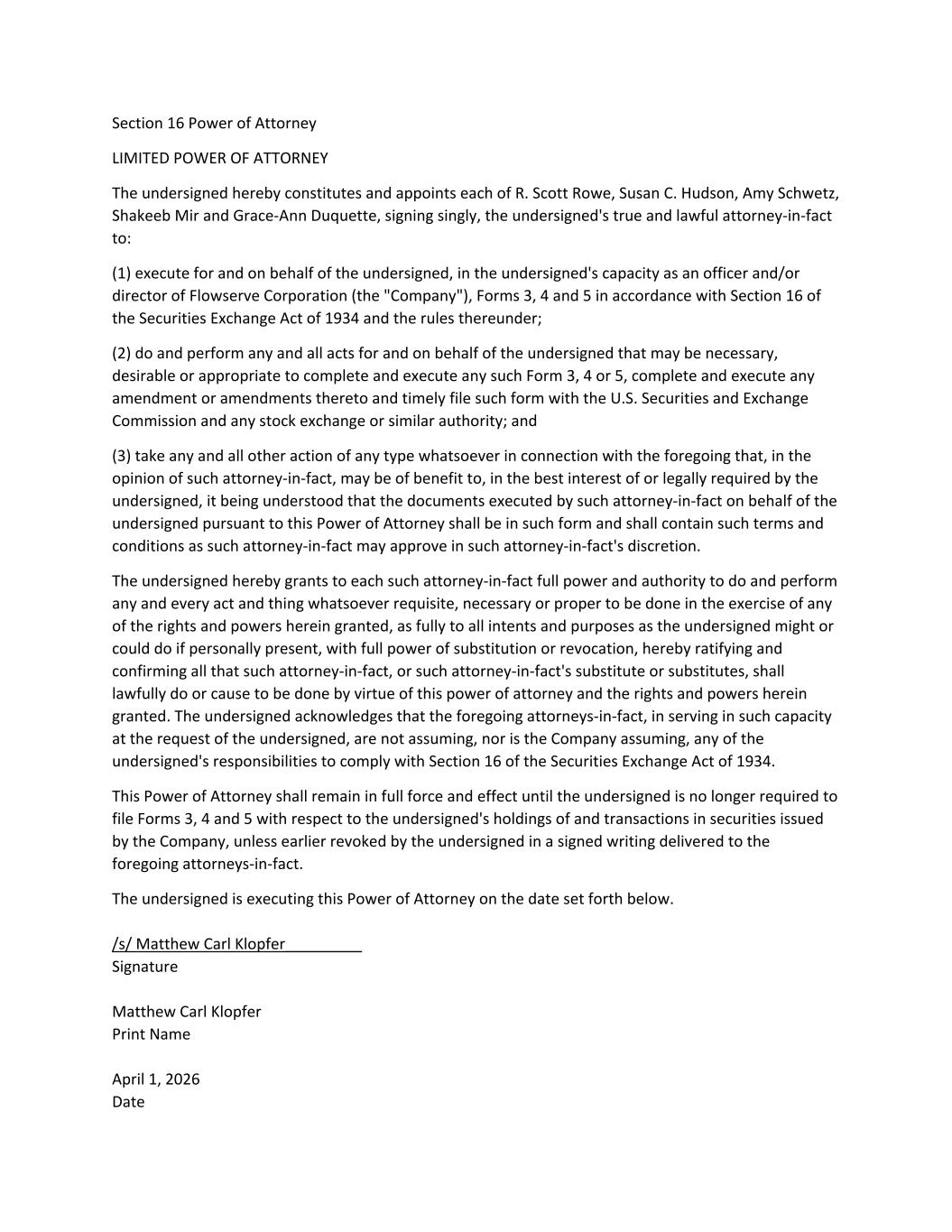 Section 16 Power of Attorney LIMITED POWER OF ATTORNEY The undersigned hereby constitutes and appoints each of R. Scott Rowe, Susan C. Hudson, Amy Schwetz, Shakeeb Mir and Grace-Ann Duquette, signing singly, the undersigned's true and lawful attorney-in-fact to: (1) execute for and on behalf of the undersigned, in the undersigned's capacity as an officer and/or director of Flowserve Corporation (the "Company"), Forms 3, 4 and 5 in accordance with Section 16 of the Securities Exchange Act of 1934 and the rules thereunder; (2) do and perform any and all acts for and on behalf of the undersigned that may be necessary, desirable or appropriate to complete and execute any such Form 3, 4 or 5, complete and execute any amendment or amendments thereto and timely file such form with the U.S. Securities and Exchange Commission and any stock exchange or similar authority; and (3) take any and all other action of any type whatsoever in connection with the foregoing that, in the opinion of such attorney-in-fact, may be of benefit to, in the best interest of or legally required by the undersigned, it being understood that the documents executed by such attorney-in-fact on behalf of the undersigned pursuant to this Power of Attorney shall be in such form and shall contain such terms and conditions as such attorney-in-fact may approve in such attorney-in-fact's discretion. The undersigned hereby grants to each such attorney-in-fact full power and authority to do and perform any and every act and thing whatsoever requisite, necessary or proper to be done in the exercise of any of the rights and powers herein granted, as fully to all intents and purposes as the undersigned might or could do if personally present, with full power of substitution or revocation, hereby ratifying and confirming all that such attorney-in-fact, or such attorney-in-fact's substitute or substitutes, shall lawfully do or cause to be done by virtue of this power of attorney and the rights and powers herein granted. The undersigned acknowledges that the foregoing attorneys-in-fact, in serving in such capacity at the request of the undersigned, are not assuming, nor is the Company assuming, any of the undersigned's responsibilities to comply with Section 16 of the Securities Exchange Act of 1934. This Power of Attorney shall remain in full force and effect until the undersigned is no longer required to file Forms 3, 4 and 5 with respect to the undersigned's holdings of and transactions in securities issued by the Company, unless earlier revoked by the undersigned in a signed writing delivered to the foregoing attorneys-in-fact. The undersigned is executing this Power of Attorney on the date set forth below. /s/ Matthew Carl Klopfer_________ Signature Matthew Carl Klopfer Print Name April 1, 2026 Date