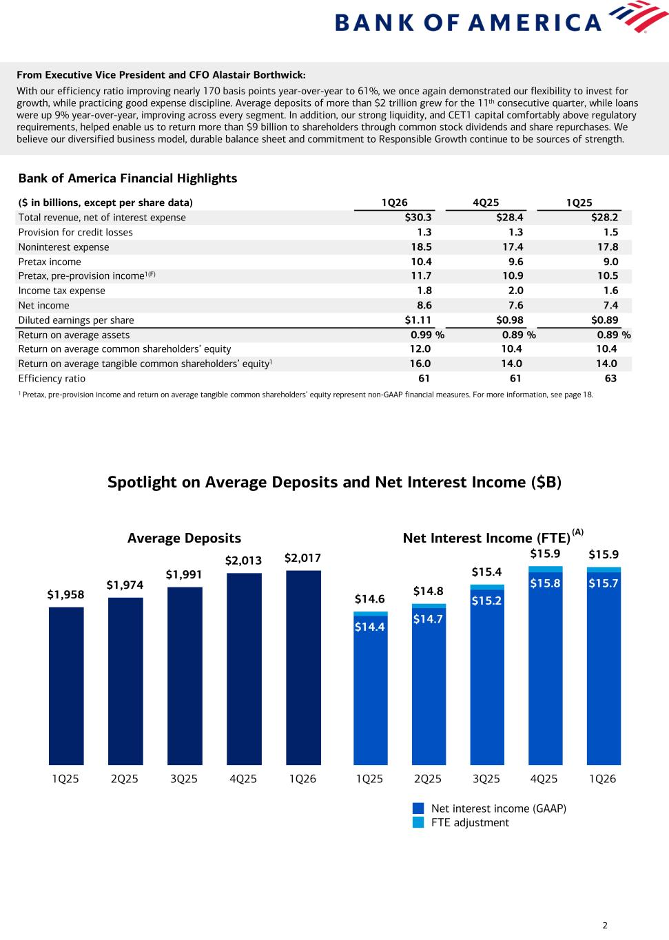 2 From Executive Vice President and CFO Alastair Borthwick: With our efficiency ratio improving nearly 170 basis points year-over-year to 61%, we once again demonstrated our flexibility to invest for growth, while practicing good expense discipline. Average deposits of more than $2 trillion grew for the 11th consecutive quarter, while loans were up 9% year-over-year, improving across every segment. In addition, our strong liquidity, and CET1 capital comfortably above regulatory requirements, helped enable us to return more than $9 billion to shareholders through common stock dividends and share repurchases. We believe our diversified business model, durable balance sheet and commitment to Responsible Growth continue to be sources of strength. Bank of America Financial Highlights ($ in billions, except per share data) 1Q26 4Q25 1Q25 Total revenue, net of interest expense $30.3 $28.4 $28.2 Provision for credit losses 1.3 1.3 1.5 Noninterest expense 18.5 17.4 17.8 Pretax income 10.4 9.6 9.0 Pretax, pre-provision income1(F) 11.7 10.9 10.5 Income tax expense 1.8 2.0 1.6 Net income 8.6 7.6 7.4 Diluted earnings per share $1.11 $0.98 $0.89 Return on average assets 0.99 % 0.89 % 0.89 % Return on average common shareholders’ equity 12.0 10.4 10.4 Return on average tangible common shareholders’ equity1 16.0 14.0 14.0 Efficiency ratio 61 61 63 1 Pretax, pre-provision income and return on average tangible common shareholders’ equity represent non-GAAP financial measures. For more information, see page 18. Net Interest Income (FTE) $14.6 $14.8 $15.4 $15.9 $15.9 $14.4 $14.7 $15.2 $15.8 $15.7 Net interest income (GAAP) FTE adjustment 1Q25 2Q25 3Q25 4Q25 1Q26 Average Deposits $1,958 $1,974 $1,991 $2,013 $2,017 1Q25 2Q25 3Q25 4Q25 1Q26 Spotlight on Average Deposits and Net Interest Income ($B) (A)