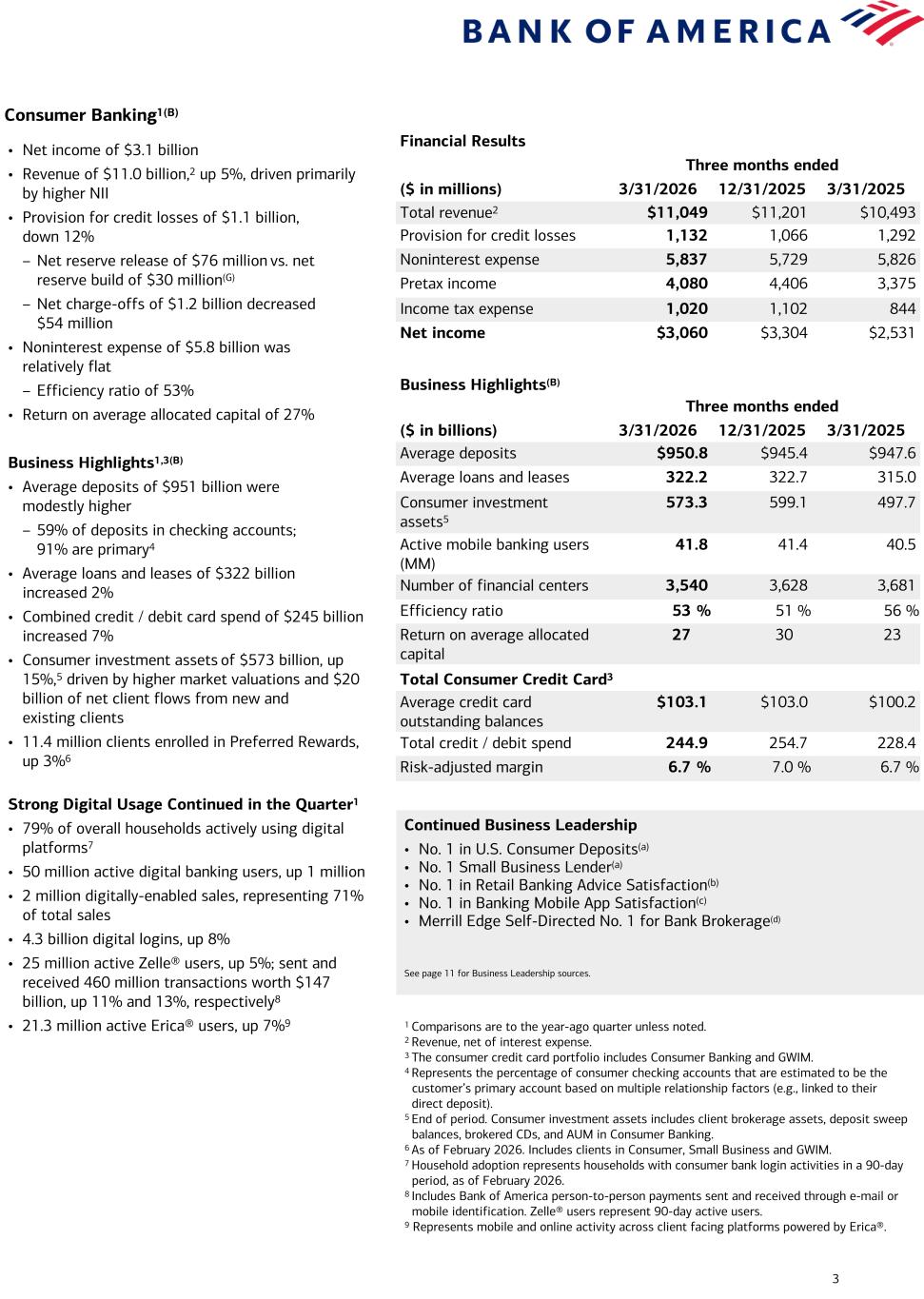 3 Consumer Banking1(B) Financial Results Three months ended ($ in millions) 3/31/2026 12/31/2025 3/31/2025 Total revenue2 $11,049 $11,201 $10,493 Provision for credit losses 1,132 1,066 1,292 Noninterest expense 5,837 5,729 5,826 Pretax income 4,080 4,406 3,375 Income tax expense 1,020 1,102 844 Net income $3,060 $3,304 $2,531 Business Highlights(B) Three months ended ($ in billions) 3/31/2026 12/31/2025 3/31/2025 Average deposits $950.8 $945.4 $947.6 Average loans and leases 322.2 322.7 315.0 Consumer investment assets5 573.3 599.1 497.7 Active mobile banking users (MM) 41.8 41.4 40.5 Number of financial centers 3,540 3,628 3,681 Efficiency ratio 53 % 51 % 56 % Return on average allocated capital 27 30 23 Total Consumer Credit Card3 Average credit card outstanding balances $103.1 $103.0 $100.2 Total credit / debit spend 244.9 254.7 228.4 Risk-adjusted margin 6.7 % 7.0 % 6.7 % • Net income of $3.1 billion • Revenue of $11.0 billion,2 up 5%, driven primarily by higher NII • Provision for credit losses of $1.1 billion, down 12% – Net reserve release of $76 million vs. net reserve build of $30 million(G) – Net charge-offs of $1.2 billion decreased $54 million • Noninterest expense of $5.8 billion was relatively flat – Efficiency ratio of 53% • Return on average allocated capital of 27% Business Highlights1,3(B) • Average deposits of $951 billion were modestly higher – 59% of deposits in checking accounts; 91% are primary4 • Average loans and leases of $322 billion increased 2% • Combined credit / debit card spend of $245 billion increased 7% • Consumer investment assets of $573 billion, up 15%,5 driven by higher market valuations and $20 billion of net client flows from new and existing clients • 11.4 million clients enrolled in Preferred Rewards, up 3%6 Strong Digital Usage Continued in the Quarter1 • 79% of overall households actively using digital platforms7 • 50 million active digital banking users, up 1 million • 2 million digitally-enabled sales, representing 71% of total sales • 4.3 billion digital logins, up 8% • 25 million active Zelle® users, up 5%; sent and received 460 million transactions worth $147 billion, up 11% and 13%, respectively8 • 21.3 million active Erica® users, up 7%9 Continued Business Leadership • No. 1 in U.S. Consumer Deposits(a) • No. 1 Small Business Lender(a) • No. 1 in Retail Banking Advice Satisfaction(b) • No. 1 in Banking Mobile App Satisfaction(c) • Merrill Edge Self-Directed No. 1 for Bank Brokerage(d) See page 11 for Business Leadership sources. 1 Comparisons are to the year-ago quarter unless noted. 2 Revenue, net of interest expense. 3 The consumer credit card portfolio includes Consumer Banking and GWIM. 4 Represents the percentage of consumer checking accounts that are estimated to be the customer’s primary account based on multiple relationship factors (e.g., linked to their direct deposit). 5 End of period. Consumer investment assets includes client brokerage assets, deposit sweep balances, brokered CDs, and AUM in Consumer Banking. 6 As of February 2026. Includes clients in Consumer, Small Business and GWIM. 7 Household adoption represents households with consumer bank login activities in a 90-day period, as of February 2026. 8 Includes Bank of America person-to-person payments sent and received through e-mail or mobile identification. Zelle® users represent 90-day active users. 9 Represents mobile and online activity across client facing platforms powered by Erica®.