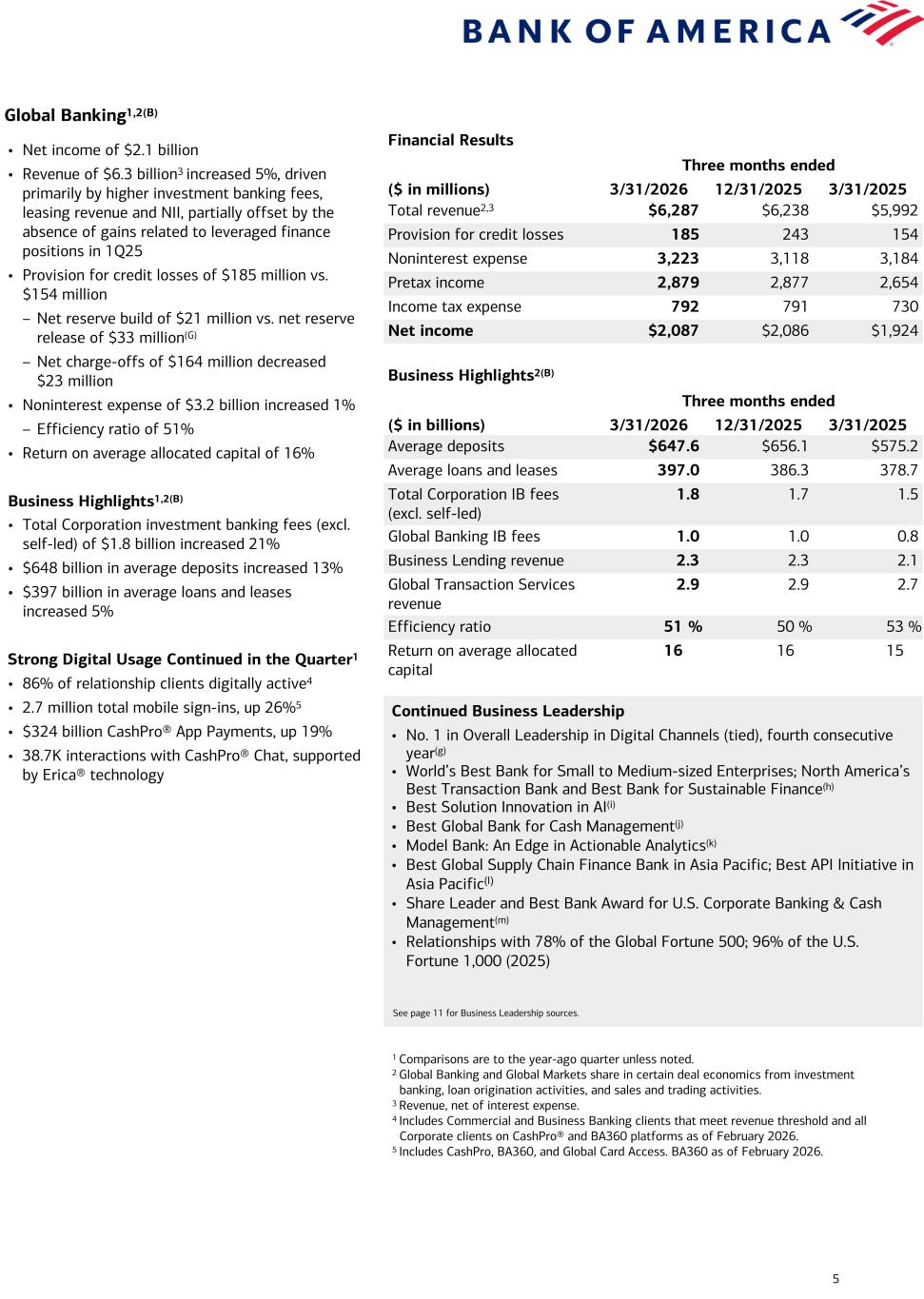 4 Global Wealth and Investment Management1(B) Financial Results Three months ended ($ in millions) 3/31/2026 12/31/2025 3/31/2025 Total revenue2 $6,712 $6,618 $6,016 Provision (benefit) for credit losses 2 (3) 14 Noninterest expense 4,938 4,747 4,659 Pretax income 1,772 1,874 1,343 Income tax expense 443 469 336 Net income $1,329 $1,405 $1,007 Business Highlights(B) Three months ended ($ in billions) 3/31/2026 12/31/2025 3/31/2025 Average deposits $286.6 $279.5 $286.4 Average loans and leases 262.2 257.0 232.3 Total client balances (EOP) 4,572.4 4,751.4 4,157.2 AUM flows 20.4 20.2 24.0 Pretax margin 26 % 28 % 22 % Return on average allocated capital 24 28 21 Continued Business Leadership • Merrill earned most recognitions on Forbes' 2026 Best-in-State Wealth Management Teams list, including 32 teams ranked No. 1 • 23 Merrill advisors on Forbes' 2026 Top 100 Women Wealth Advisors • >300 Merrill advisors on Barron's 2026 Top 1,500 Financial Advisors • 24 Merrill advisors on Financial Planning's 2026 Top 40 Brokers Under 40 • No. 1 in Managed Personal Trust AUM(a) • Best Private Bank in North America for High Net Worth(e) • No. 1 Global Nonprofit OCIO Provider(f) See page 11 for Business Leadership sources. • Net income of $1.3 billion • Revenue of $6.7 billion,2 up 12%. The increase was driven primarily by higher asset management fees, up 15% to $4.2 billion, reflecting higher market valuations and strong AUM flows • Noninterest expense of $4.9 billion increased 6%, driven primarily by revenue-related incentives – Pretax margin of 26% • Return on average allocated capital of 24% Business Highlights1(B) • $4.6 trillion in client balances, up 10%, driven by higher market valuations and positive net client flows – AUM flows of $20 billion; $78 billion since 1Q25 • Average deposits of $287 billion increased modestly • Average loans and leases of $262 billion increased 13% Merrill Wealth Management Highlights Client Engagement • $3.8 trillion in client balances(B) • $1.7 trillion in AUM balances(B) • ~3.3K net new $500K+ households added in 1Q26 • 59K digital appointments scheduled in the quarter Strong Digital Usage Continued in the Quarter • 88% of Merrill households digitally active3 – 67% of Merrill households are active on mobile – 85% of households enrolled in eDelivery4 • 76% of eligible checks deposited through automated channels5 • 82% of eligible brokerage and bank accounts opened through digital onboarding Bank of America Private Bank Highlights Client Engagement • $757 billion in client balances(B) • $451 billion in AUM balances(B) • ~280 net new relationships added in 1Q26 with $3MM+ clients Strong Digital Usage Continued in the Quarter • 94% of relationships digitally active6 – 77% of core relationships are active on mobile – 53% of eligible relationships enrolled in eDelivery4 • 78% of eligible checks deposited through automated channels5 • 50% of eligible investment, trust and banking accounts opened through digital onboarding Note: OCIO stands for outsourced chief investment office. 1 Comparisons are to the year-ago quarter unless noted. 2 Revenue, net of interest expense. 3 Percentage of digitally active Merrill primary households across the enterprise ($250K+ in investable assets within the enterprise) as of March 2026. Excludes Stock Plan and Banking- only households. 4 Includes Merrill Digital Households across the enterprise (excluding Stock Plan, Banking-only households, Retirement-only and 529-only) and Private Bank relationships that receive statements digitally, as of February 2026 for Private Bank and as of March 2026 for Merrill. 5 Includes mobile check deposits, remote deposit operations, and automated teller machine transactions, as of February 2026 for Private Bank and as of March 2026 for Merrill. 6 Percentage of digitally active Private Bank core relationships across the enterprise ($3MM+ in total balances) as of February 2026. Includes third-party activities and excludes Irrevocable Trust-only relationships, Institutional Philanthropic relationships, and exiting relationships.