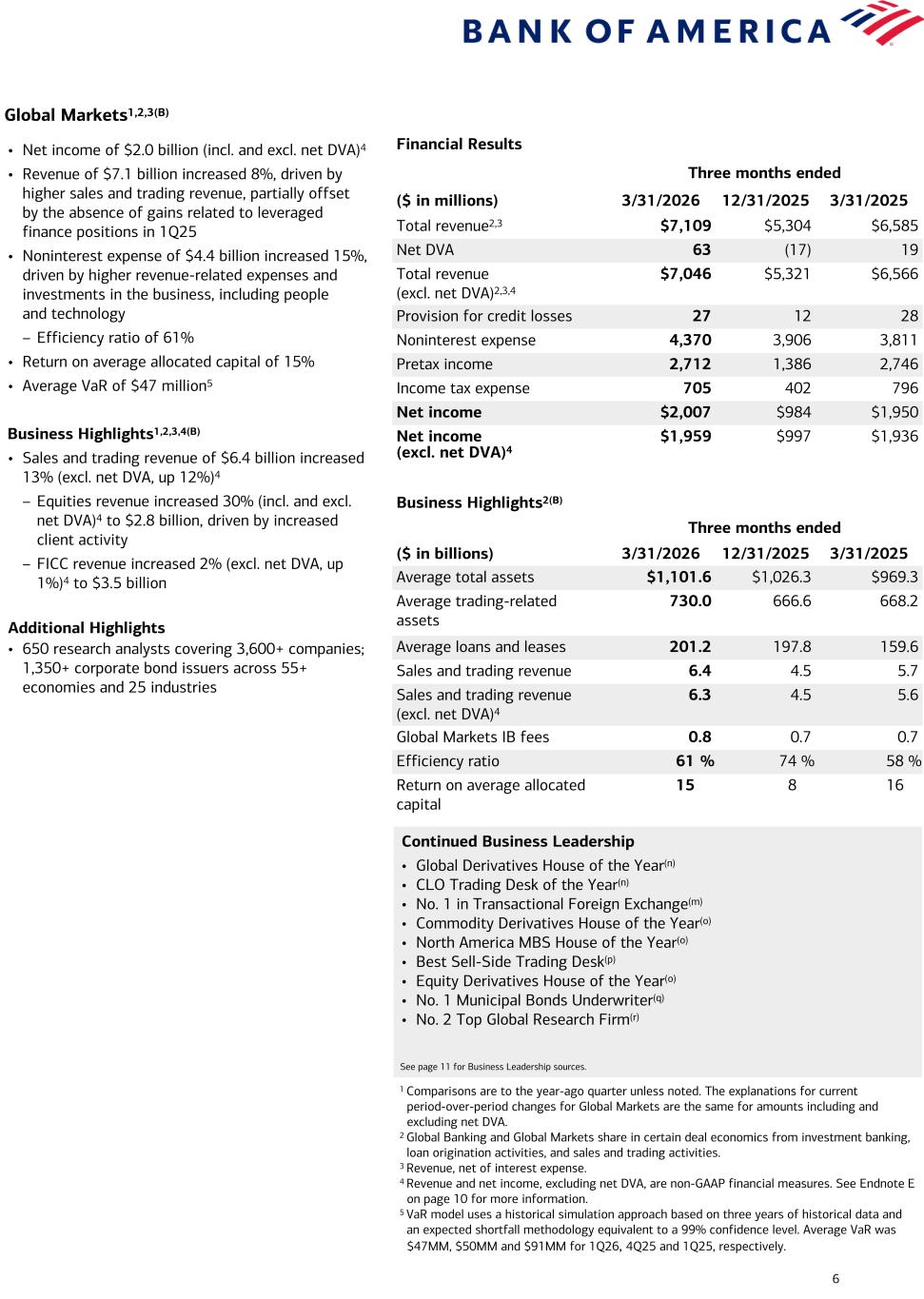 6 Global Markets1,2,3(B) Financial Results Three months ended ($ in millions) 3/31/2026 12/31/2025 3/31/2025 Total revenue2,3 $7,109 $5,304 $6,585 Net DVA 63 (17) 19 Total revenue (excl. net DVA)2,3,4 $7,046 $5,321 $6,566 Provision for credit losses 27 12 28 Noninterest expense 4,370 3,906 3,811 Pretax income 2,712 1,386 2,746 Income tax expense 705 402 796 Net income $2,007 $984 $1,950 Net income (excl. net DVA)4 $1,959 $997 $1,936 Business Highlights2(B) Three months ended ($ in billions) 3/31/2026 12/31/2025 3/31/2025 Average total assets $1,101.6 $1,026.3 $969.3 Average trading-related assets 730.0 666.6 668.2 Average loans and leases 201.2 197.8 159.6 Sales and trading revenue 6.4 4.5 5.7 Sales and trading revenue (excl. net DVA)4 6.3 4.5 5.6 Global Markets IB fees 0.8 0.7 0.7 Efficiency ratio 61 % 74 % 58 % Return on average allocated capital 15 8 16 • Net income of $2.0 billion (incl. and excl. net DVA)4 • Revenue of $7.1 billion increased 8%, driven by higher sales and trading revenue, partially offset by the absence of gains related to leveraged finance positions in 1Q25 • Noninterest expense of $4.4 billion increased 15%, driven by higher revenue-related expenses and investments in the business, including people and technology – Efficiency ratio of 61% • Return on average allocated capital of 15% • Average VaR of $47 million5 Business Highlights1,2,3,4(B) • Sales and trading revenue of $6.4 billion increased 13% (excl. net DVA, up 12%)4 – Equities revenue increased 30% (incl. and excl. net DVA)4 to $2.8 billion, driven by increased client activity – FICC revenue increased 2% (excl. net DVA, up 1%)4 to $3.5 billion Additional Highlights • 650 research analysts covering 3,600+ companies; 1,350+ corporate bond issuers across 55+ economies and 25 industries Continued Business Leadership • Global Derivatives House of the Year(n) • CLO Trading Desk of the Year(n) • No. 1 in Transactional Foreign Exchange(m) • Commodity Derivatives House of the Year(o) • North America MBS House of the Year(o) • Best Sell-Side Trading Desk(p) • Equity Derivatives House of the Year(o) • No. 1 Municipal Bonds Underwriter(q) • No. 2 Top Global Research Firm(r) See page 11 for Business Leadership sources. 1 Comparisons are to the year-ago quarter unless noted. The explanations for current period-over-period changes for Global Markets are the same for amounts including and excluding net DVA. 2 Global Banking and Global Markets share in certain deal economics from investment banking, loan origination activities, and sales and trading activities. 3 Revenue, net of interest expense. 4 Revenue and net income, excluding net DVA, are non-GAAP financial measures. See Endnote E on page 10 for more information. 5 VaR model uses a historical simulation approach based on three years of historical data and an expected shortfall methodology equivalent to a 99% confidence level. Average VaR was $47MM, $50MM and $91MM for 1Q26, 4Q25 and 1Q25, respectively.