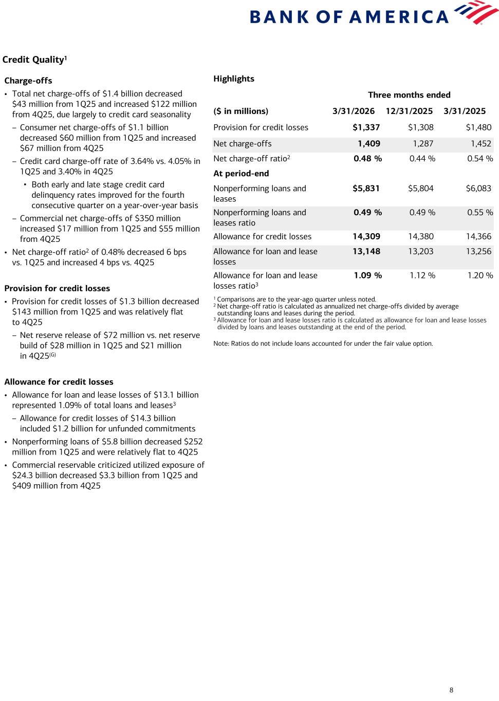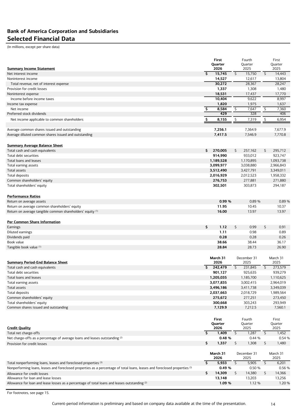 Current-period information is preliminary and based on company data available at the time of the presentation. 14 Bank of America Corporation and Subsidiaries Selected Financial Data (In millions, except per share data) First Quarter 2026 Fourth Quarter 2025 First Quarter 2025Summary Income Statement Net interest income $ 15,745 $ 15,750 $ 14,443 Noninterest income 14,527 12,617 13,804 Total revenue, net of interest expense 30,272 28,367 28,247 Provision for credit losses 1,337 1,308 1,480 Noninterest expense 18,531 17,437 17,770 Income before income taxes 10,404 9,622 8,997 Income tax expense 1,820 1,975 1,637 Net income $ 8,584 $ 7,647 $ 7,360 Preferred stock dividends 429 328 406 Net income applicable to common shareholders $ 8,155 $ 7,319 $ 6,954 Average common shares issued and outstanding 7,256.1 7,364.9 7,677.9 Average diluted common shares issued and outstanding 7,417.5 7,546.9 7,770.8 Summary Average Balance Sheet Total cash and cash equivalents $ 270,005 $ 257,162 $ 295,712 Total debt securities 914,990 933,012 923,747 Total loans and leases 1,189,528 1,170,895 1,093,738 Total earning assets 3,099,977 3,038,880 2,966,843 Total assets 3,512,490 3,427,791 3,349,011 Total deposits 2,016,929 2,012,523 1,958,332 Common shareholders’ equity 276,753 277,881 271,880 Total shareholders’ equity 302,501 303,873 294,187 Performance Ratios Return on average assets 0.99 % 0.89 % 0.89 % Return on average common shareholders’ equity 11.95 10.45 10.37 Return on average tangible common shareholders’ equity (1) 16.00 13.97 13.97 Per Common Share Information Earnings $ 1.12 $ 0.99 $ 0.91 Diluted earnings 1.11 0.98 0.89 Dividends paid 0.28 0.28 0.26 Book value 38.66 38.44 36.17 Tangible book value (1) 28.84 28.73 26.90 Summary Period-End Balance Sheet March 31 2026 December 31 2025 March 31 2025 Total cash and cash equivalents $ 242,479 $ 231,845 $ 273,579 Total debt securities 901,127 925,635 939,279 Total loans and leases 1,205,035 1,185,700 1,110,625 Total earning assets 3,077,835 3,002,415 2,964,019 Total assets 3,496,186 3,411,738 3,349,039 Total deposits 2,037,663 2,018,729 1,989,564 Common shareholders’ equity 275,672 277,251 273,450 Total shareholders’ equity 300,668 303,243 293,949 Common shares issued and outstanding 7,129.9 7,212.5 7,560.1 First Quarter 2026 Fourth Quarter 2025 First Quarter 2025Credit Quality Total net charge-offs $ 1,409 $ 1,287 $ 1,452 Net charge-offs as a percentage of average loans and leases outstanding (2) 0.48 % 0.44 % 0.54 % Provision for credit losses $ 1,337 $ 1,308 $ 1,480 March 31 2026 December 31 2025 March 31 2025 Total nonperforming loans, leases and foreclosed properties (3) $ 5,933 $ 5,905 $ 6,201 Nonperforming loans, leases and foreclosed properties as a percentage of total loans, leases and foreclosed properties (3) 0.49 % 0.50 % 0.56 % Allowance for credit losses $ 14,309 $ 14,380 $ 14,366 Allowance for loan and lease losses 13,148 13,203 13,256 Allowance for loan and lease losses as a percentage of total loans and leases outstanding (2) 1.09 % 1.12 % 1.20 % For footnotes, see page 15.