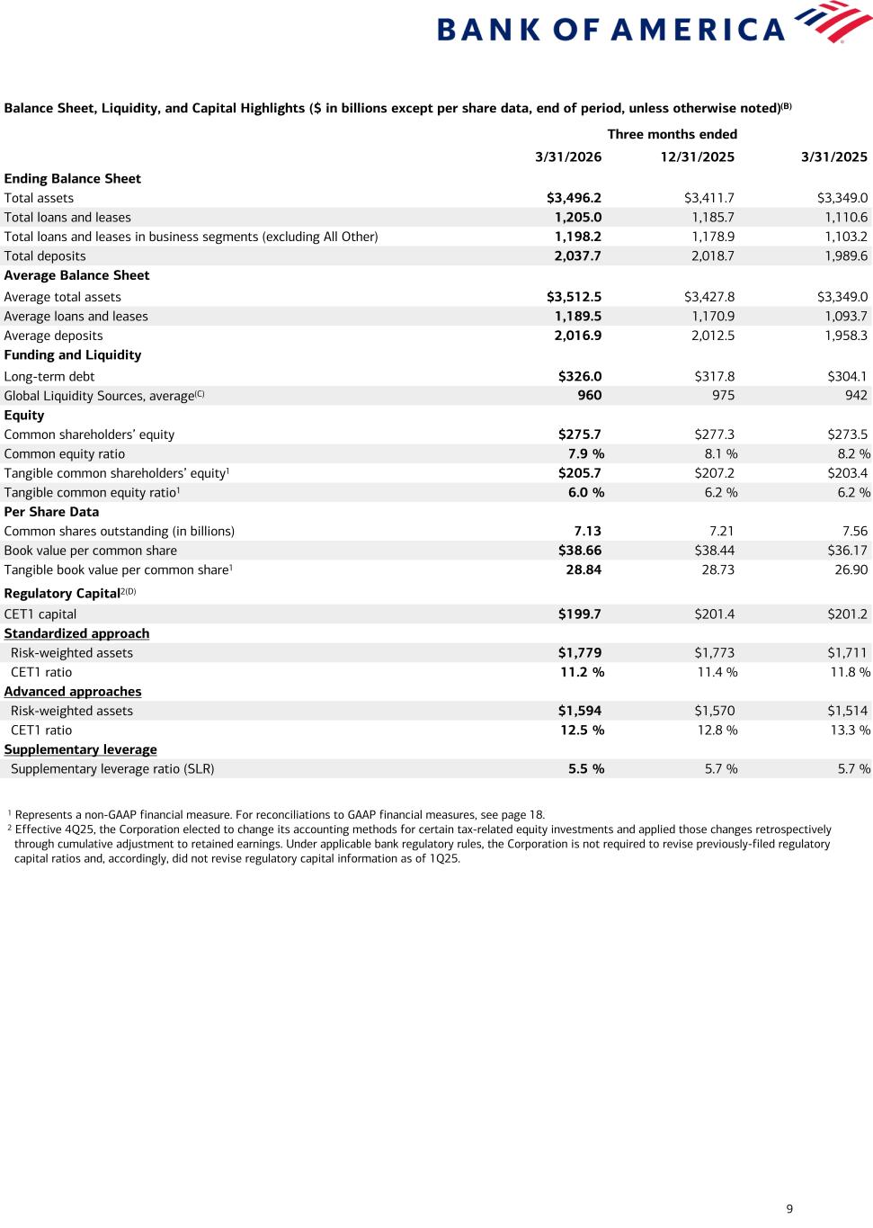 Current-period information is preliminary and based on company data available at the time of the presentation. 15 Bank of America Corporation and Subsidiaries Selected Financial Data (continued) (Dollars in millions) Capital Management March 31 2026 December 31 2025 March 31 2025 Regulatory capital metrics (4)(5): Common equity tier 1 capital $ 199,695 $ 201,410 $ 201,177 Common equity tier 1 capital ratio - Standardized approach 11.2 % 11.4 % 11.8 % Common equity tier 1 capital ratio - Advanced approaches 12.5 12.8 13.3 Total capital ratio - Standardized approach 14.5 14.7 15.0 Total capital ratio - Advanced approaches 15.5 15.9 16.2 Tier 1 leverage ratio 6.5 6.8 6.8 Supplementary leverage ratio 5.5 5.7 5.7 Total ending equity to total ending assets ratio 8.6 8.9 8.8 Common equity ratio 7.9 8.1 8.2 Tangible equity ratio (6) 6.7 7.0 6.8 Tangible common equity ratio (6) 6.0 6.2 6.2 (1) Return on average tangible common shareholders’ equity and tangible book value per share of common stock are non-GAAP financial measures. We believe the use of ratios that utilize tangible equity provides additional useful information because they present measures of those assets that can generate income. Tangible book value per common share provides additional useful information about the level of tangible assets in relation to outstanding shares of common stock. See Reconciliations to GAAP Financial Measures on page 18. (2) Ratios do not include loans accounted for under the fair value option. Charge-off ratios are annualized for the quarterly presentation. (3) Balances do not include past due consumer credit card loans, consumer loans secured by real estate where repayments are insured by the Federal Housing Administration and individually insured long-term stand-by agreements (fully-insured home loans), and in general, other consumer and commercial loans not secured by real estate, and nonperforming loans held-for-sale or accounted for under the fair value option. (4) Effective in the fourth quarter of 2025, the Corporation elected to change its accounting methods for certain tax-related equity investments and applied those changes retrospectively through cumulative adjustment to retained earnings. Under applicable bank regulatory rules, the Corporation is not required to revise previously-filed regulatory capital ratios and, accordingly, did not revise regulatory capital information as of March 31, 2025. (5) Regulatory capital ratios at March 31, 2026 are preliminary. Bank of America Corporation reports regulatory capital ratios under both the Standardized and Advanced approaches. Capital adequacy is evaluated against the lower of the Standardized or Advanced approaches compared to their respective regulatory capital ratio requirements. The Corporation’s binding ratio was the Total capital ratio under the Standardized approach at March 31, 2026 and December 31, 2025, and the Tier 1 capital ratio under the Standardized approach at March 31, 2025. (6) Tangible equity ratio equals period-end tangible shareholders’ equity divided by period-end tangible assets. Tangible common equity ratio equals period-end tangible common shareholders’ equity divided by period- end tangible assets. Tangible shareholders’ equity and tangible assets are non-GAAP financial measures. We believe the use of ratios that utilize tangible equity provides additional useful information because they present measures of those assets that can generate income. See Reconciliations to GAAP Financial Measures on page 18.