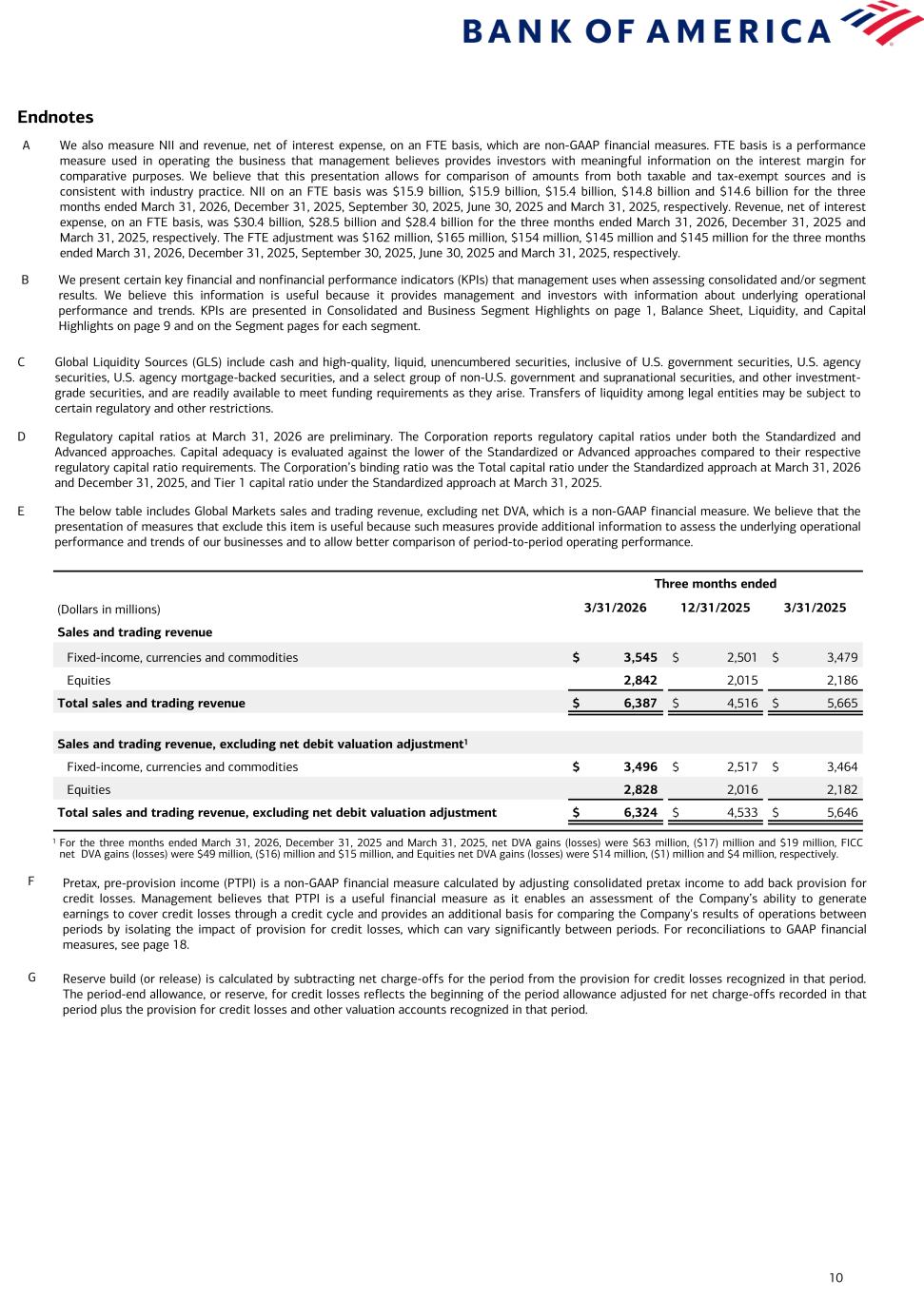 10 Endnotes A We also measure NII and revenue, net of interest expense, on an FTE basis, which are non-GAAP financial measures. FTE basis is a performance measure used in operating the business that management believes provides investors with meaningful information on the interest margin for comparative purposes. We believe that this presentation allows for comparison of amounts from both taxable and tax-exempt sources and is consistent with industry practice. NII on an FTE basis was $15.9 billion, $15.9 billion, $15.4 billion, $14.8 billion and $14.6 billion for the three months ended March 31, 2026, December 31, 2025, September 30, 2025, June 30, 2025 and March 31, 2025, respectively. Revenue, net of interest expense, on an FTE basis, was $30.4 billion, $28.5 billion and $28.4 billion for the three months ended March 31, 2026, December 31, 2025 and March 31, 2025, respectively. The FTE adjustment was $162 million, $165 million, $154 million, $145 million and $145 million for the three months ended March 31, 2026, December 31, 2025, September 30, 2025, June 30, 2025 and March 31, 2025, respectively. B We present certain key financial and nonfinancial performance indicators (KPIs) that management uses when assessing consolidated and/or segment results. We believe this information is useful because it provides management and investors with information about underlying operational performance and trends. KPIs are presented in Consolidated and Business Segment Highlights on page 1, Balance Sheet, Liquidity, and Capital Highlights on page 9 and on the Segment pages for each segment. C Global Liquidity Sources (GLS) include cash and high-quality, liquid, unencumbered securities, inclusive of U.S. government securities, U.S. agency securities, U.S. agency mortgage-backed securities, and a select group of non-U.S. government and supranational securities, and other investment- grade securities, and are readily available to meet funding requirements as they arise. Transfers of liquidity among legal entities may be subject to certain regulatory and other restrictions. D Regulatory capital ratios at March 31, 2026 are preliminary. The Corporation reports regulatory capital ratios under both the Standardized and Advanced approaches. Capital adequacy is evaluated against the lower of the Standardized or Advanced approaches compared to their respective regulatory capital ratio requirements. The Corporation’s binding ratio was the Total capital ratio under the Standardized approach at March 31, 2026 and December 31, 2025, and Tier 1 capital ratio under the Standardized approach at March 31, 2025. E The below table includes Global Markets sales and trading revenue, excluding net DVA, which is a non-GAAP financial measure. We believe that the presentation of measures that exclude this item is useful because such measures provide additional information to assess the underlying operational performance and trends of our businesses and to allow better comparison of period-to-period operating performance. Three months ended (Dollars in millions) 3/31/2026 12/31/2025 3/31/2025 Sales and trading revenue Fixed-income, currencies and commodities $ 3,545 $ 2,501 $ 3,479 Equities 2,842 2,015 2,186 Total sales and trading revenue $ 6,387 $ 4,516 $ 5,665 Sales and trading revenue, excluding net debit valuation adjustment1 Fixed-income, currencies and commodities $ 3,496 $ 2,517 $ 3,464 Equities 2,828 2,016 2,182 Total sales and trading revenue, excluding net debit valuation adjustment $ 6,324 $ 4,533 $ 5,646 F Pretax, pre-provision income (PTPI) is a non-GAAP financial measure calculated by adjusting consolidated pretax income to add back provision for credit losses. Management believes that PTPI is a useful financial measure as it enables an assessment of the Company’s ability to generate earnings to cover credit losses through a credit cycle and provides an additional basis for comparing the Company's results of operations between periods by isolating the impact of provision for credit losses, which can vary significantly between periods. For reconciliations to GAAP financial measures, see page 18. G Reserve build (or release) is calculated by subtracting net charge-offs for the period from the provision for credit losses recognized in that period. The period-end allowance, or reserve, for credit losses reflects the beginning of the period allowance adjusted for net charge-offs recorded in that period plus the provision for credit losses and other valuation accounts recognized in that period. 1 For the three months ended March 31, 2026, December 31, 2025 and March 31, 2025, net DVA gains (losses) were $63 million, ($17) million and $19 million, FICC net DVA gains (losses) were $49 million, ($16) million and $15 million, and Equities net DVA gains (losses) were $14 million, ($1) million and $4 million, respectively.