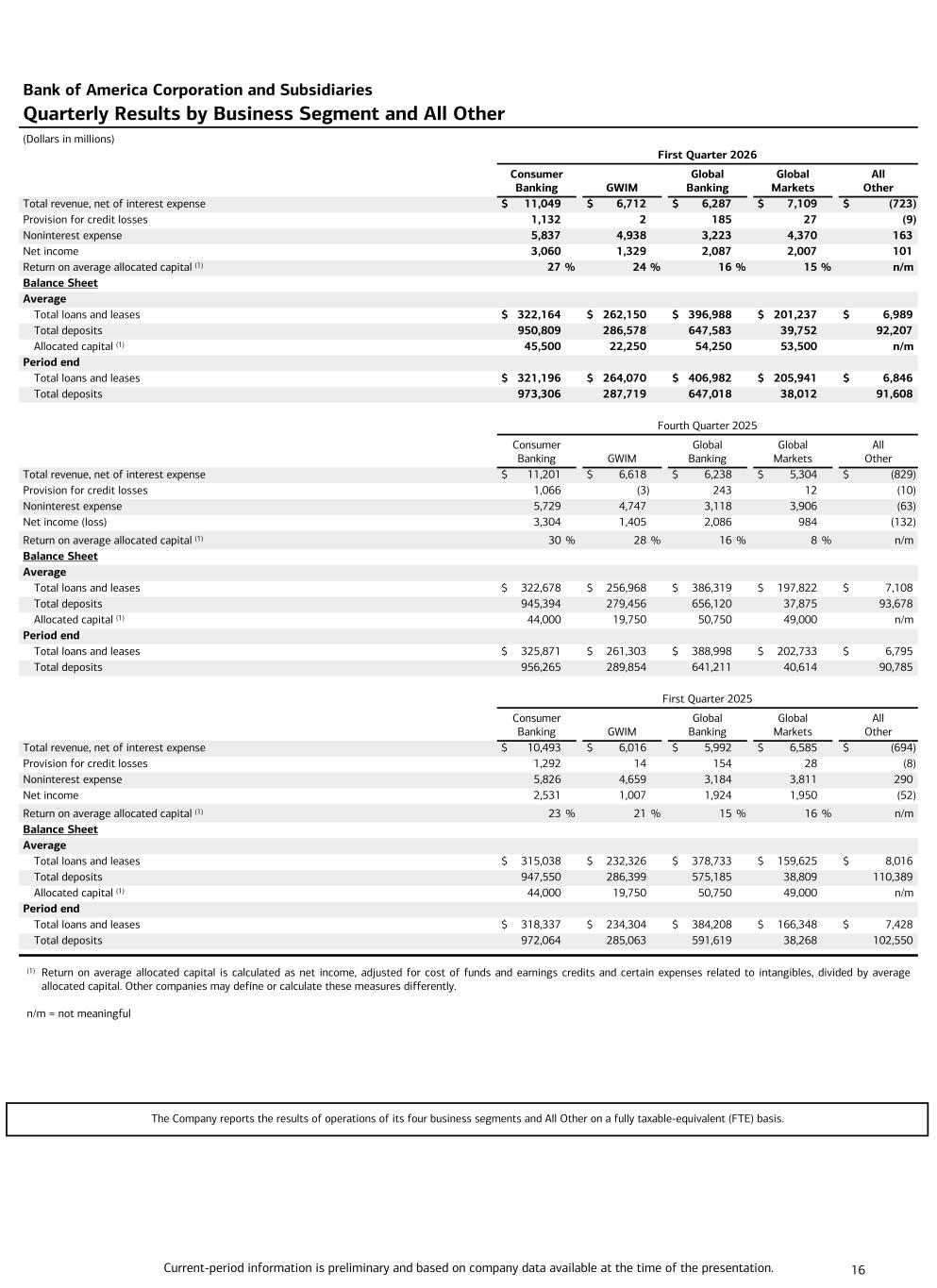 Current-period information is preliminary and based on company data available at the time of the presentation. 16 Bank of America Corporation and Subsidiaries Quarterly Results by Business Segment and All Other (Dollars in millions) First Quarter 2026 Consumer Banking GWIM Global Banking Global Markets All Other Total revenue, net of interest expense $ 11,049 $ 6,712 $ 6,287 $ 7,109 $ (723) Provision for credit losses 1,132 2 185 27 (9) Noninterest expense 5,837 4,938 3,223 4,370 163 Net income 3,060 1,329 2,087 2,007 101 Return on average allocated capital (1) 27 % 24 % 16 % 15 % n/m Balance Sheet Average Total loans and leases $ 322,164 $ 262,150 $ 396,988 $ 201,237 $ 6,989 Total deposits 950,809 286,578 647,583 39,752 92,207 Allocated capital (1) 45,500 22,250 54,250 53,500 n/m Period end Total loans and leases $ 321,196 $ 264,070 $ 406,982 $ 205,941 $ 6,846 Total deposits 973,306 287,719 647,018 38,012 91,608 Fourth Quarter 2025 Consumer Banking GWIM Global Banking Global Markets All Other Total revenue, net of interest expense $ 11,201 $ 6,618 $ 6,238 $ 5,304 $ (829) Provision for credit losses 1,066 (3) 243 12 (10) Noninterest expense 5,729 4,747 3,118 3,906 (63) Net income (loss) 3,304 1,405 2,086 984 (132) Return on average allocated capital (1) 30 % 28 % 16 % 8 % n/m Balance Sheet Average Total loans and leases $ 322,678 $ 256,968 $ 386,319 $ 197,822 $ 7,108 Total deposits 945,394 279,456 656,120 37,875 93,678 Allocated capital (1) 44,000 19,750 50,750 49,000 n/m Period end Total loans and leases $ 325,871 $ 261,303 $ 388,998 $ 202,733 $ 6,795 Total deposits 956,265 289,854 641,211 40,614 90,785 First Quarter 2025 Consumer Banking GWIM Global Banking Global Markets All Other Total revenue, net of interest expense $ 10,493 $ 6,016 $ 5,992 $ 6,585 $ (694) Provision for credit losses 1,292 14 154 28 (8) Noninterest expense 5,826 4,659 3,184 3,811 290 Net income 2,531 1,007 1,924 1,950 (52) Return on average allocated capital (1) 23 % 21 % 15 % 16 % n/m Balance Sheet Average Total loans and leases $ 315,038 $ 232,326 $ 378,733 $ 159,625 $ 8,016 Total deposits 947,550 286,399 575,185 38,809 110,389 Allocated capital (1) 44,000 19,750 50,750 49,000 n/m Period end Total loans and leases $ 318,337 $ 234,304 $ 384,208 $ 166,348 $ 7,428 Total deposits 972,064 285,063 591,619 38,268 102,550 (1) Return on average allocated capital is calculated as net income, adjusted for cost of funds and earnings credits and certain expenses related to intangibles, divided by average allocated capital. Other companies may define or calculate these measures differently. n/m = not meaningful The Company reports the results of operations of its four business segments and All Other on a fully taxable-equivalent (FTE) basis.