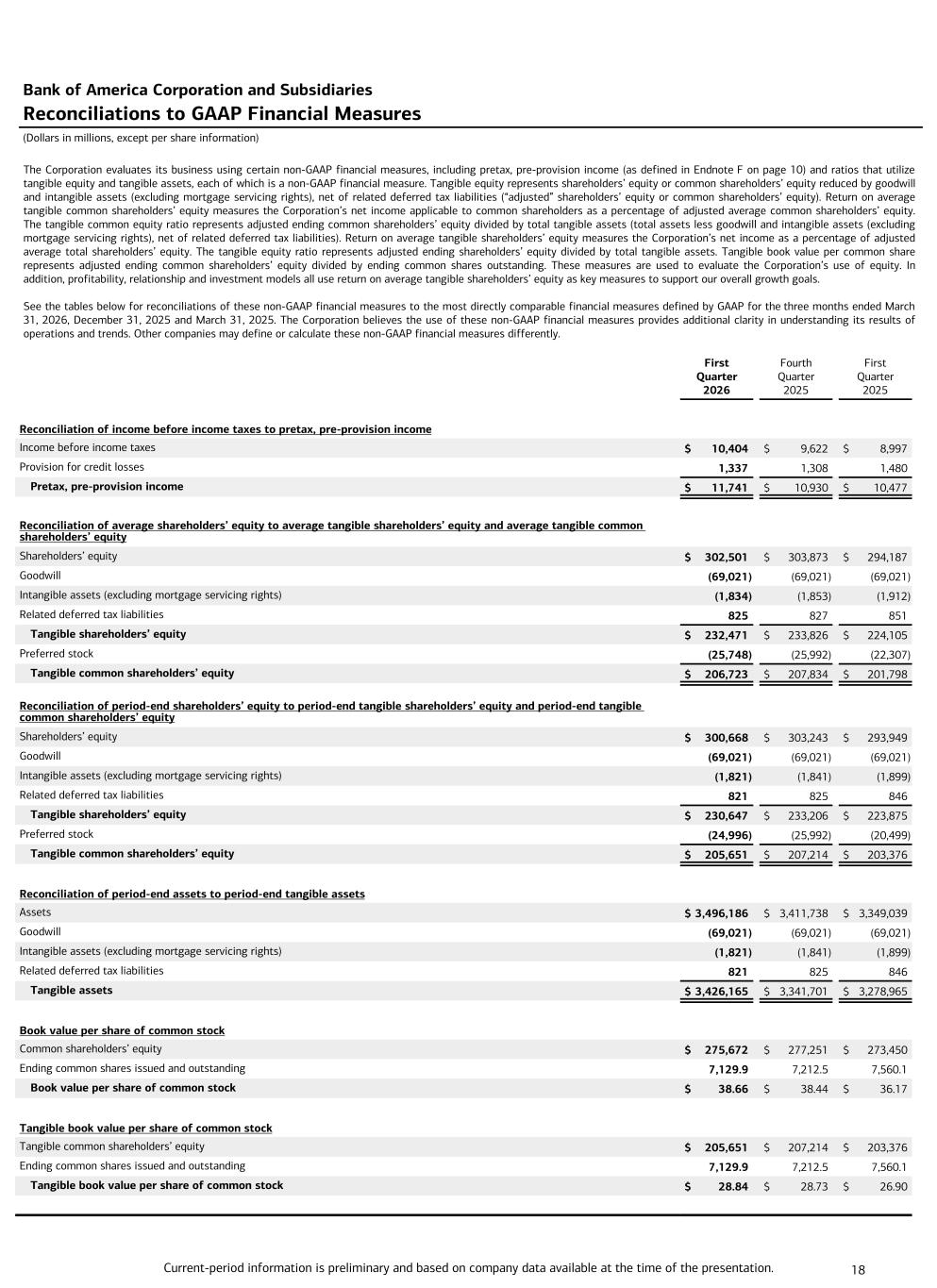 Current-period information is preliminary and based on company data available at the time of the presentation. 18 The Corporation evaluates its business using certain non-GAAP financial measures, including pretax, pre-provision income (as defined in Endnote F on page 10) and ratios that utilize tangible equity and tangible assets, each of which is a non-GAAP financial measure. Tangible equity represents shareholders’ equity or common shareholders’ equity reduced by goodwill and intangible assets (excluding mortgage servicing rights), net of related deferred tax liabilities (“adjusted” shareholders’ equity or common shareholders’ equity). Return on average tangible common shareholders’ equity measures the Corporation’s net income applicable to common shareholders as a percentage of adjusted average common shareholders’ equity. The tangible common equity ratio represents adjusted ending common shareholders’ equity divided by total tangible assets (total assets less goodwill and intangible assets (excluding mortgage servicing rights), net of related deferred tax liabilities). Return on average tangible shareholders’ equity measures the Corporation’s net income as a percentage of adjusted average total shareholders’ equity. The tangible equity ratio represents adjusted ending shareholders’ equity divided by total tangible assets. Tangible book value per common share represents adjusted ending common shareholders’ equity divided by ending common shares outstanding. These measures are used to evaluate the Corporation’s use of equity. In addition, profitability, relationship and investment models all use return on average tangible shareholders’ equity as key measures to support our overall growth goals. See the tables below for reconciliations of these non-GAAP financial measures to the most directly comparable financial measures defined by GAAP for the three months ended March 31, 2026, December 31, 2025 and March 31, 2025. The Corporation believes the use of these non-GAAP financial measures provides additional clarity in understanding its results of operations and trends. Other companies may define or calculate these non-GAAP financial measures differently. Bank of America Corporation and Subsidiaries Reconciliations to GAAP Financial Measures (Dollars in millions, except per share information) First Quarter 2026 Fourth Quarter 2025 First Quarter 2025 Reconciliation of income before income taxes to pretax, pre-provision income Income before income taxes $ 10,404 $ 9,622 $ 8,997 Provision for credit losses 1,337 1,308 1,480 Pretax, pre-provision income $ 11,741 $ 10,930 $ 10,477 Reconciliation of average shareholders’ equity to average tangible shareholders’ equity and average tangible common shareholders’ equity Shareholders’ equity $ 302,501 $ 303,873 $ 294,187 Goodwill (69,021) (69,021) (69,021) Intangible assets (excluding mortgage servicing rights) (1,834) (1,853) (1,912) Related deferred tax liabilities 825 827 851 Tangible shareholders’ equity $ 232,471 $ 233,826 $ 224,105 Preferred stock (25,748) (25,992) (22,307) Tangible common shareholders’ equity $ 206,723 $ 207,834 $ 201,798 Reconciliation of period-end shareholders’ equity to period-end tangible shareholders’ equity and period-end tangible common shareholders’ equity Shareholders’ equity $ 300,668 $ 303,243 $ 293,949 Goodwill (69,021) (69,021) (69,021) Intangible assets (excluding mortgage servicing rights) (1,821) (1,841) (1,899) Related deferred tax liabilities 821 825 846 Tangible shareholders’ equity $ 230,647 $ 233,206 $ 223,875 Preferred stock (24,996) (25,992) (20,499) Tangible common shareholders’ equity $ 205,651 $ 207,214 $ 203,376 Reconciliation of period-end assets to period-end tangible assets Assets $ 3,496,186 $ 3,411,738 $ 3,349,039 Goodwill (69,021) (69,021) (69,021) Intangible assets (excluding mortgage servicing rights) (1,821) (1,841) (1,899) Related deferred tax liabilities 821 825 846 Tangible assets $ 3,426,165 $ 3,341,701 $ 3,278,965 Book value per share of common stock Common shareholders’ equity $ 275,672 $ 277,251 $ 273,450 Ending common shares issued and outstanding 7,129.9 7,212.5 7,560.1 Book value per share of common stock $ 38.66 $ 38.44 $ 36.17 Tangible book value per share of common stock Tangible common shareholders’ equity $ 205,651 $ 207,214 $ 203,376 Ending common shares issued and outstanding 7,129.9 7,212.5 7,560.1 Tangible book value per share of common stock $ 28.84 $ 28.73 $ 26.90