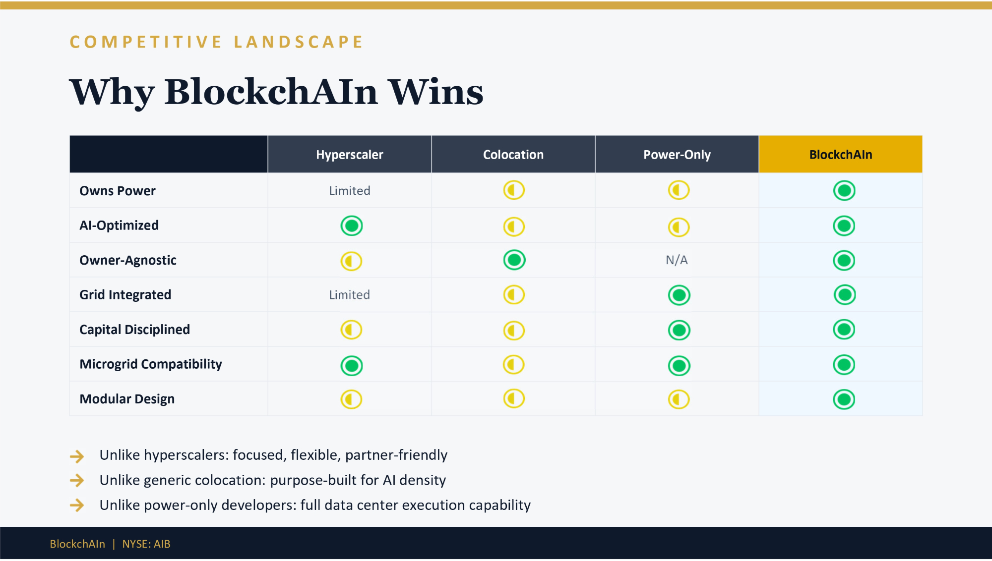 COMPETITIVE LANDSCAPE Why BlockchAIn Wins BlockchAIn Power - Only Colocation Hyperscaler Limited Owns Power AI - Optimized N/A Owner - Agnostic Limited Grid Integrated Capital Disciplined Microgrid Compatibility Modular Design Unlike hyperscalers: focused, flexible, partner - friendly Unlike generic colocation: purpose - built for AI density Unlike power - only developers: full data center execution capability BlockchAIn | NYSE: AIB