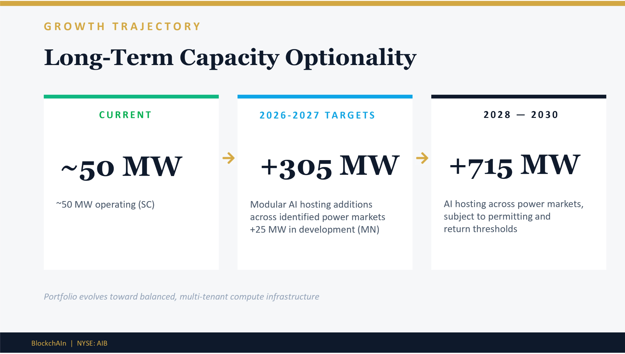GROWTH TRAJECTORY Long - Term Capacity Optionality CURRENT ~50 MW ~50 MW operating (SC) 2026 - 2027 TARGETS +305 MW Modular AI hosting additions across identified power markets +25 MW in development (MN) 2028 — 2 030 +715 MW AI hosting across power markets, subject to permitting and return thresholds Portfolio evolves toward balanced, multi - tenant compute infrastructure BlockchAIn | NYSE: AIB