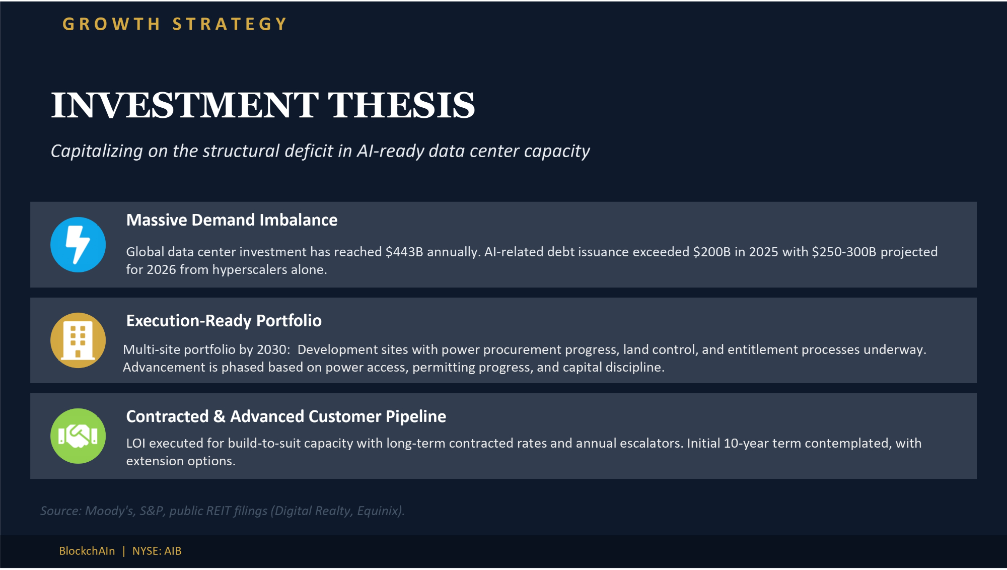 INVESTMENT THESIS Capitalizing on the structural deficit in AI - ready data center capacity Massive Demand Imbalance Global data center investment has reached $443B annually. AI - related debt issuance exceeded $200B in 2025 with $250 - 300B projected for 2026 from hyperscalers alone. Execution - Ready Portfolio Multi - site portfolio by 2030: Development sites with power procurement progress, land control, and entitlement processes underway. Advancement is phased based on power access, permitting progress, and capital discipline. Contracted & Advanced Customer Pipeline LOI executed for build - to - suit capacity with long - term contracted rates and annual escalators. Initial 10 - year term contemplated, with extension options. GROWTH STRATEGY BlockchAIn | NYSE: AIB Source: Moody's, S&P, public REIT filings (Digital Realty, Equinix).