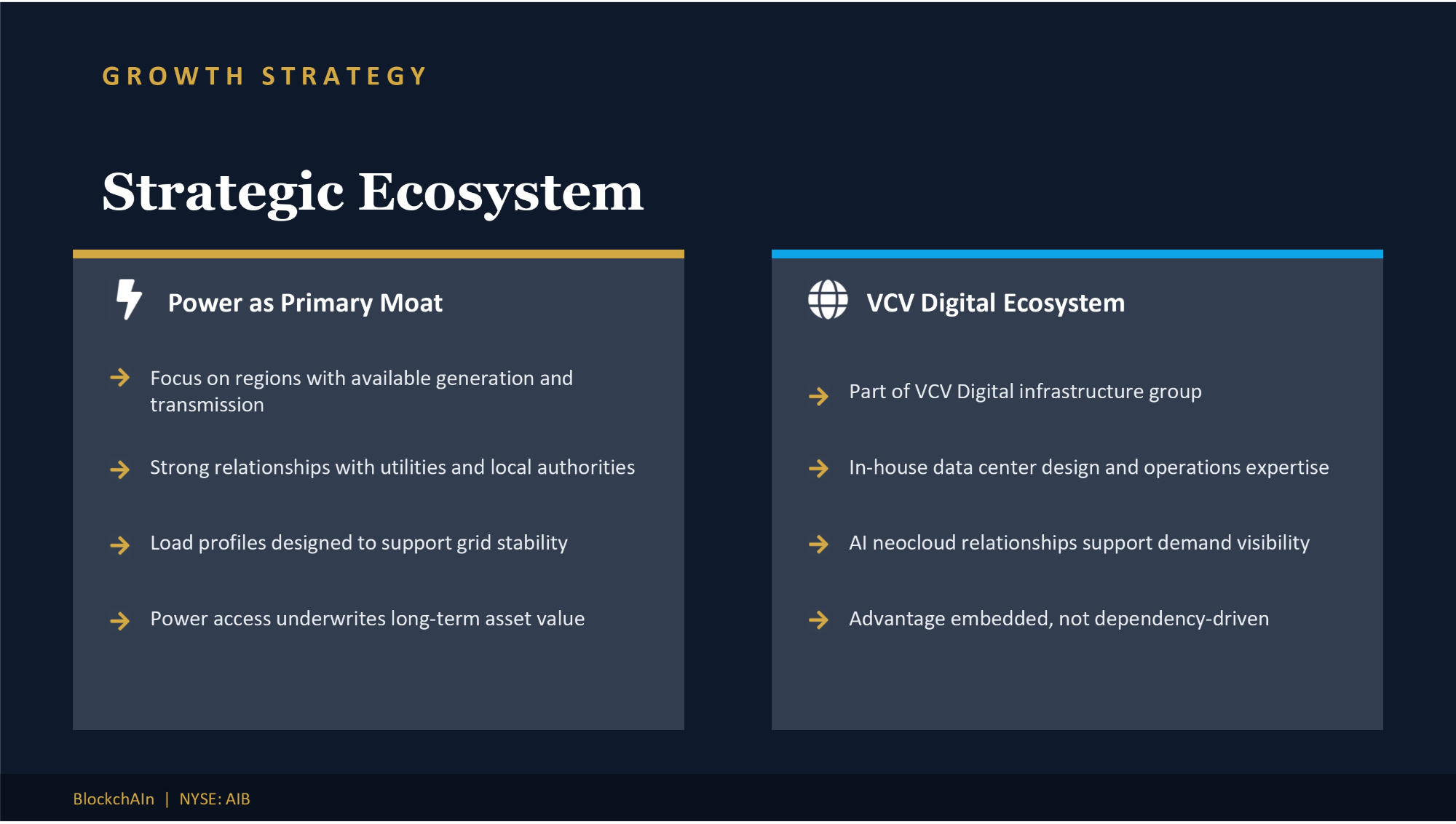 GROWTH STRATEGY Strategic Ecosystem Power as Primary Moat Focus on regions with available generation and transmission Strong relationships with utilities and local authorities Load profiles designed to support grid stability Power access underwrites long - term asset value VCV Digital Ecosystem Part of VCV Digital infrastructure group In - house data center design and operations expertise AI neocloud relationships support demand visibility Advantage embedded, not dependency - driven BlockchAIn | NYSE: AIB