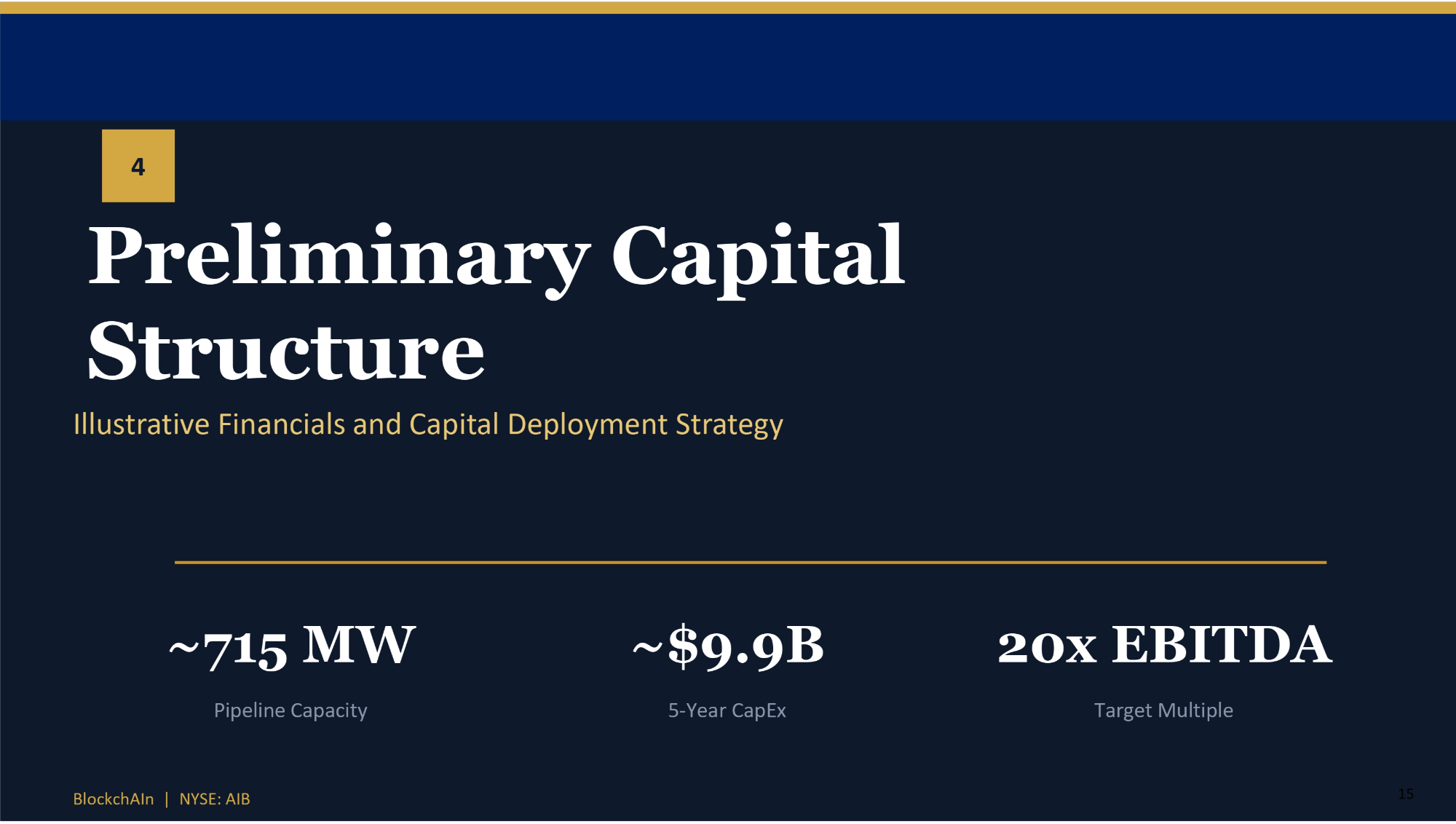 4 Preliminary Capital Structure Illustrative Financials and Capital Deployment Strategy ~715 MW Pipeline Capacity 15 BlockchAIn | NYSE: AIB ~$9.9B 5 - Year CapEx 20x EBITDA Target Multiple