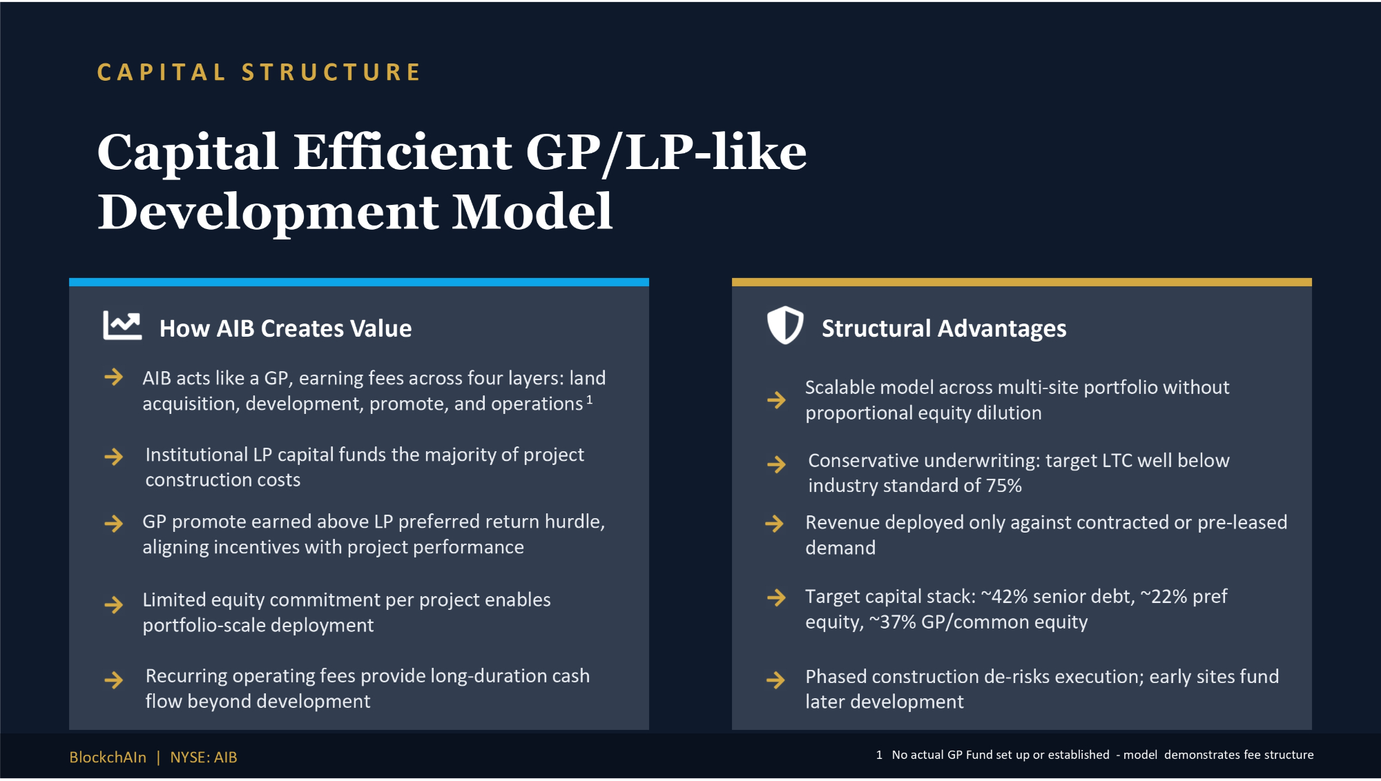CAPITAL STRUCTURE Capital Efficient GP/LP - like Development Model Structural Advantages Scalable model across multi - site portfolio without proportional equity dilution Conservative underwriting: target LTC well below industry standard of 75% Revenue deployed only against contracted or pre - leased demand Target capital stack: ~42% senior debt, ~22% pref equity, ~37% GP/common equity Phased construction de - risks execution; early sites fund later development How AIB Creates Value AIB acts like a GP, earning fees across four layers: land acquisition, development, promote, and operations 1 Institutional LP capital funds the majority of project construction costs GP promote earned above LP preferred return hurdle, aligning incentives with project performance Limited equity commitment per project enables portfolio - scale deployment Recurring operating fees provide long - duration cash flow beyond development BlockchAIn | NYSE: AIB 1 No actual GP Fund set up or established - model demonstrates fee structure