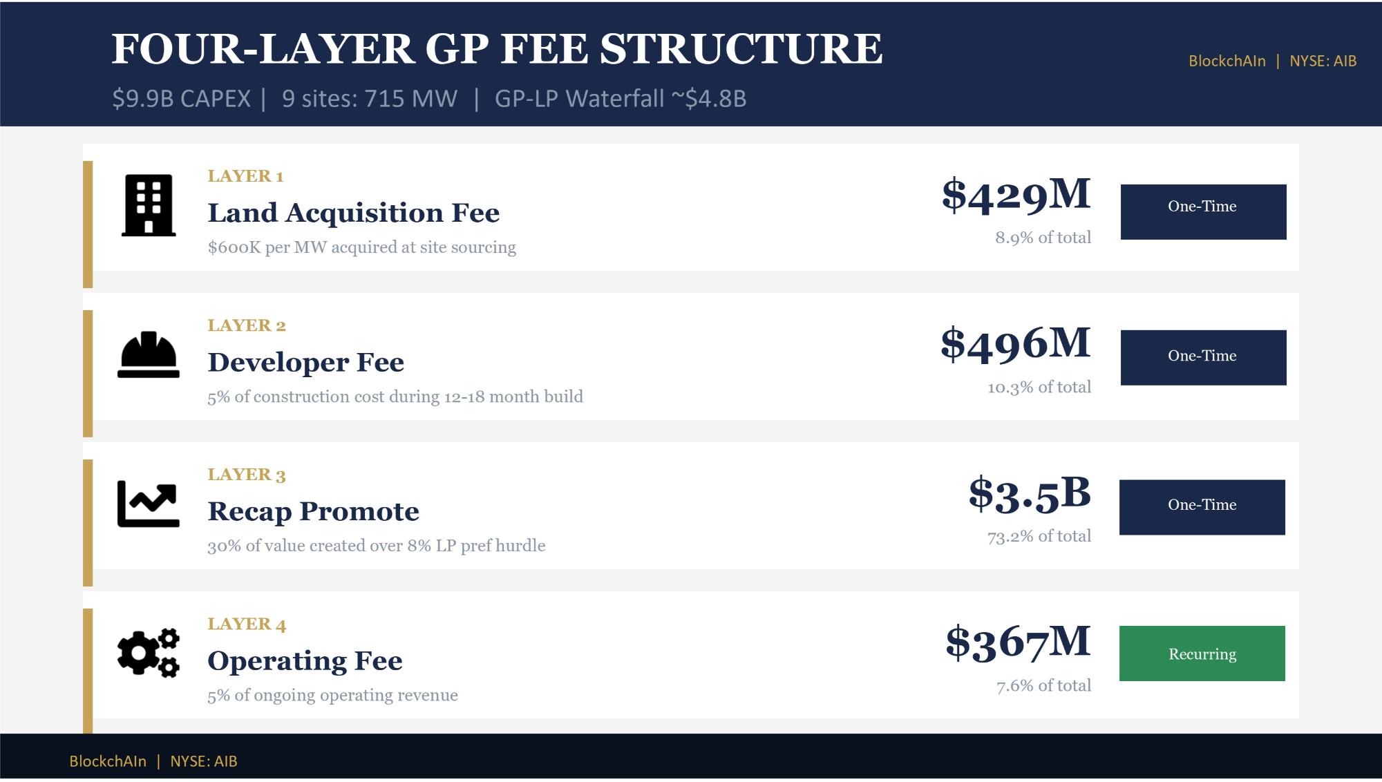 LAYER 1 Land Acquisition Fee $600K per MW acquired at site sourcing $429M 8.9% of total One - Time LAYER 2 Developer Fee 5% of construction cost during 12 - 18 month build $496M 10.3% of total One - Time LAYER 3 Recap Promote 30% of value created over 8% LP pref hurdle $3.5B 73.2% of total One - Time LAYER 4 Operating Fee 5% of ongoing operating revenue $367M 7.6% of total Recurring BlockchAIn | NYSE: AIB FOUR - LAYER GP FEE STRUCTURE $9.9B CAPEX | 9 sites: 715 MW | GP - LP Waterfall ~$4.8B BlockchAIn | NYSE: AIB BlockchAIn | NYSE: AIB