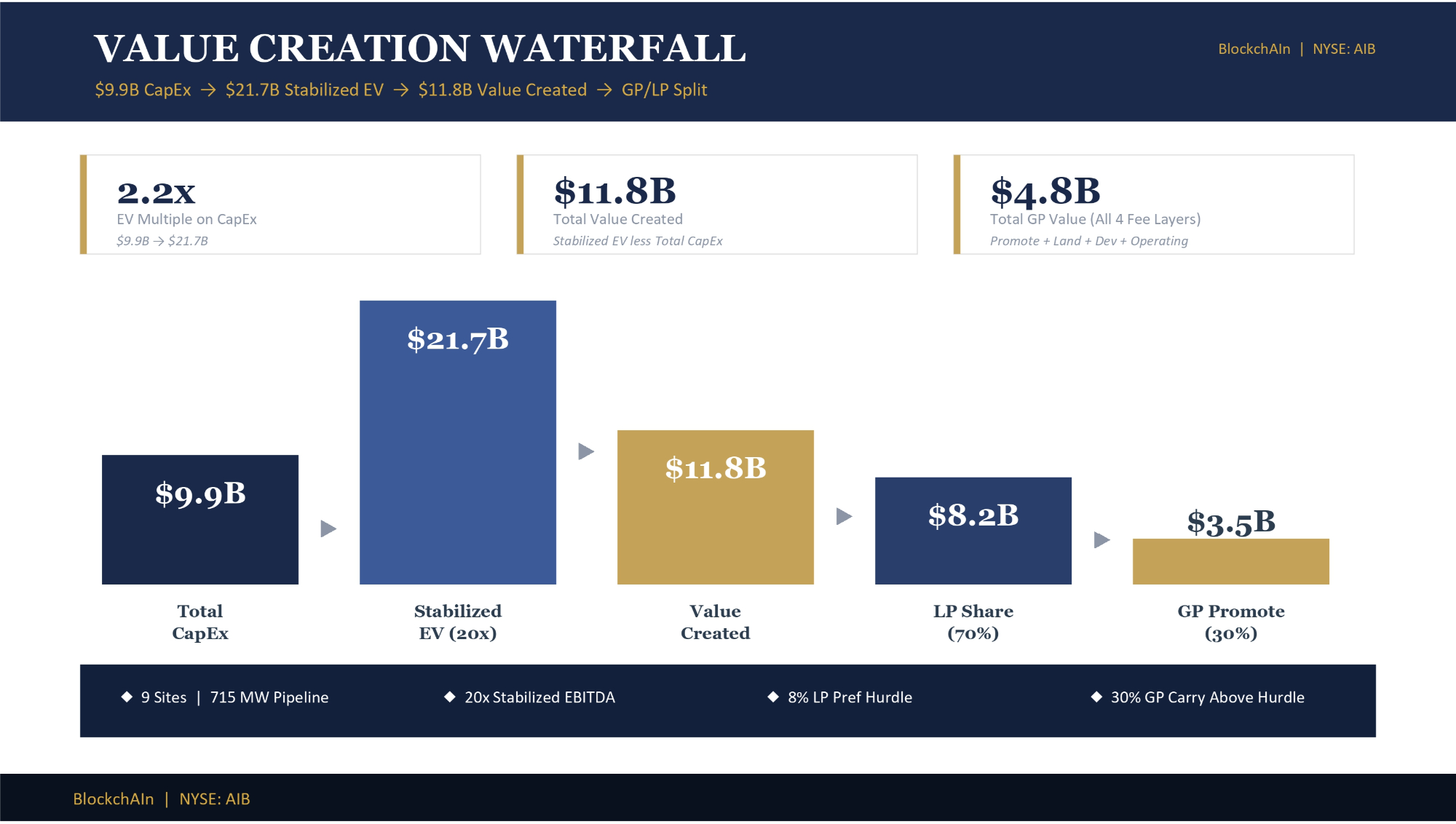VALUE CREATION WATERFALL $9.9B CapEx → $21.7B Stabilized EV → $11.8B Value Created → GP/LP Split BlockchAIn | NYSE: AIB 2.2x EV Multiple on CapEx $9.9B → $21.7B $11.8B Total Value Created Stabilized EV less Total CapEx $4.8B Total GP Value (All 4 Fee Layers) Promote + Land + Dev + Operating $9.9B Total CapEx $21.7B Stabilized EV (20x) $11.8B Value Created $8.2B LP Share (70%) $3.5B GP Promote (30%) ◆ 9 Sites | 715 MW Pipeline ᶺ 20x Stabilized EBITDA ᶺ 8% LP Pref Hurdle ᶺ 30% GP Carry Above Hurdle BlockchAIn | NYSE: AIB