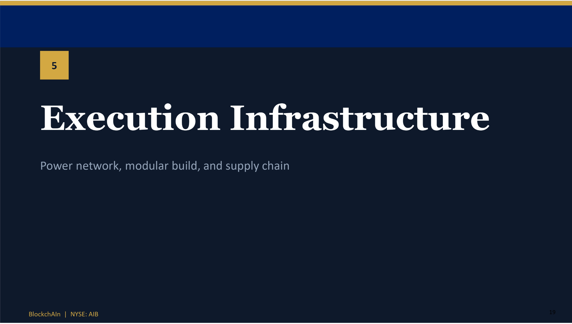5 19 BlockchAIn | NYSE: AIB Execution Infrastructure Power network, modular build, and supply chain