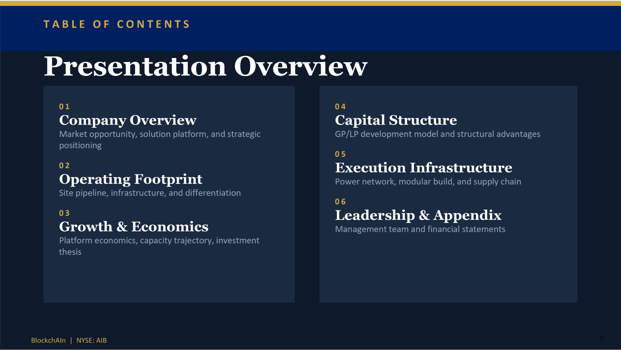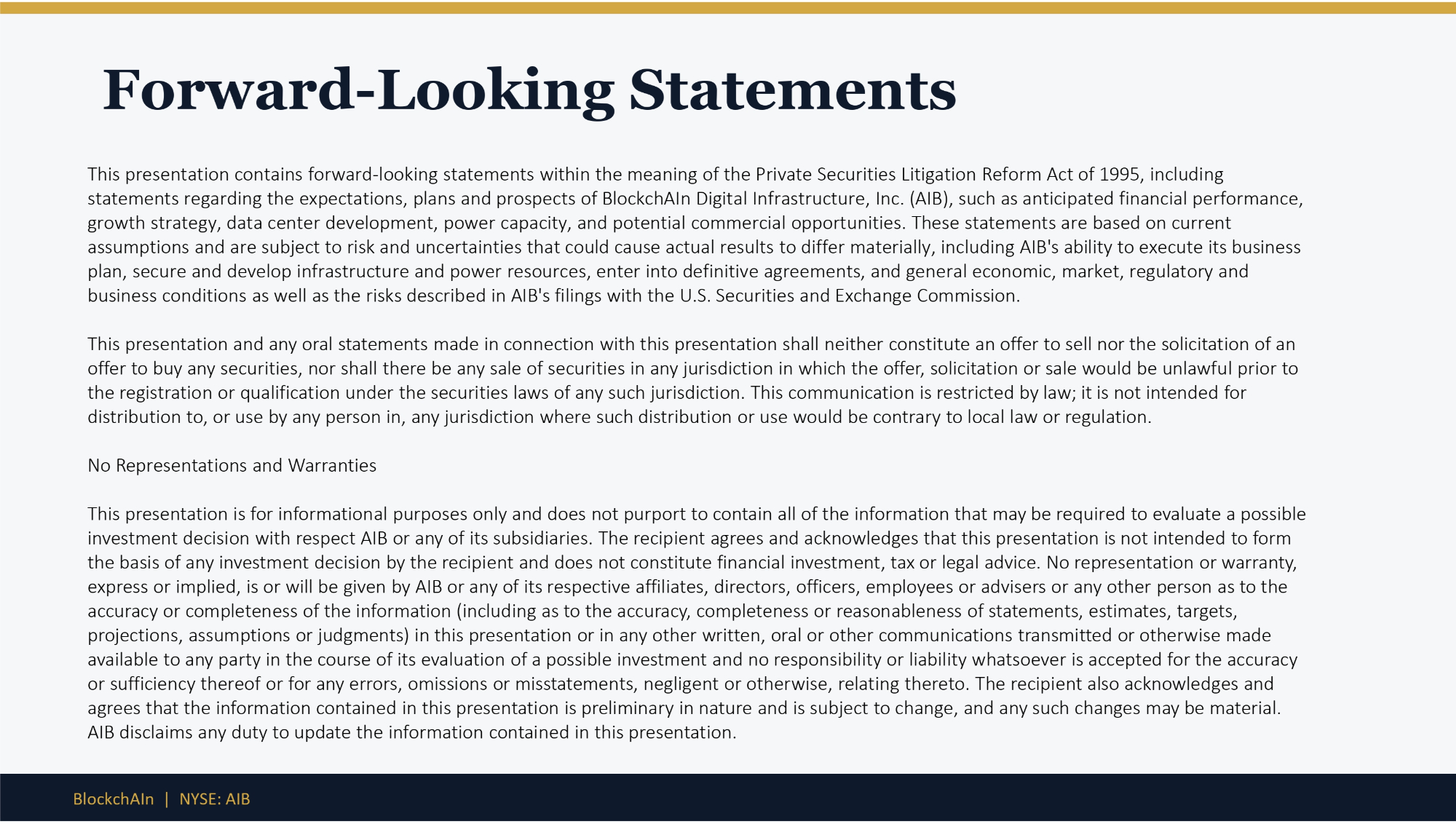 Forward - Looking Statements This presentation contains forward - looking statements within the meaning of the Private Securities Litigation Reform Act of 1995, including statements regarding the expectations, plans and prospects of BlockchAIn Digital Infrastructure, Inc. (AIB), such as anticipated financial performance, growth strategy, data center development, power capacity, and potential commercial opportunities. These statements are based on current assumptions and are subject to risk and uncertainties that could cause actual results to differ materially, including AIB's ability to execute its business plan, secure and develop infrastructure and power resources, enter into definitive agreements, and general economic, market, regulatory and business conditions as well as the risks described in AIB's filings with the U.S. Securities and Exchange Commission. This presentation and any oral statements made in connection with this presentation shall neither constitute an offer to sell nor the solicitation of an offer to buy any securities, nor shall there be any sale of securities in any jurisdiction in which the offer, solicitation or sale would be unlawful prior to the registration or qualification under the securities laws of any such jurisdiction. This communication is restricted by law; it is not intended for distribution to, or use by any person in, any jurisdiction where such distribution or use would be contrary to local law or regulation. No Representations and Warranties This presentation is for informational purposes only and does not purport to contain all of the information that may be required to evaluate a possible investment decision with respect AIB or any of its subsidiaries. The recipient agrees and acknowledges that this presentation is not intended to form the basis of any investment decision by the recipient and does not constitute financial investment, tax or legal advice. No representation or warranty, express or implied, is or will be given by AIB or any of its respective affiliates, directors, officers, employees or advisers or any other person as to the accuracy or completeness of the information (including as to the accuracy, completeness or reasonableness of statements, estimates, targets, projections, assumptions or judgments) in this presentation or in any other written, oral or other communications transmitted or otherwise made available to any party in the course of its evaluation of a possible investment and no responsibility or liability whatsoever is accepted for the accuracy or sufficiency thereof or for any errors, omissions or misstatements, negligent or otherwise, relating thereto. The recipient also acknowledges and agrees that the information contained in this presentation is preliminary in nature and is subject to change, and any such changes may be material. AIB disclaims any duty to update the information contained in this presentation. BlockchAIn | NYSE: AIB