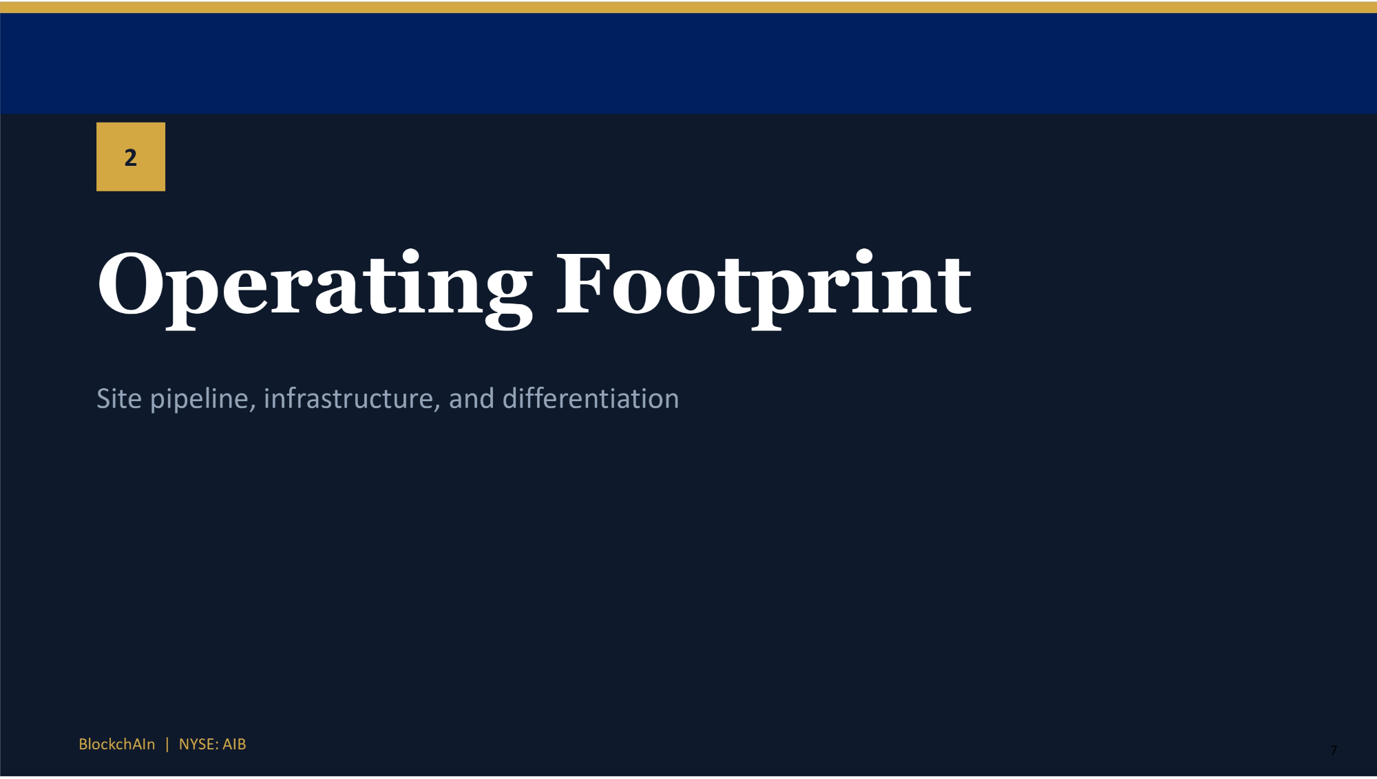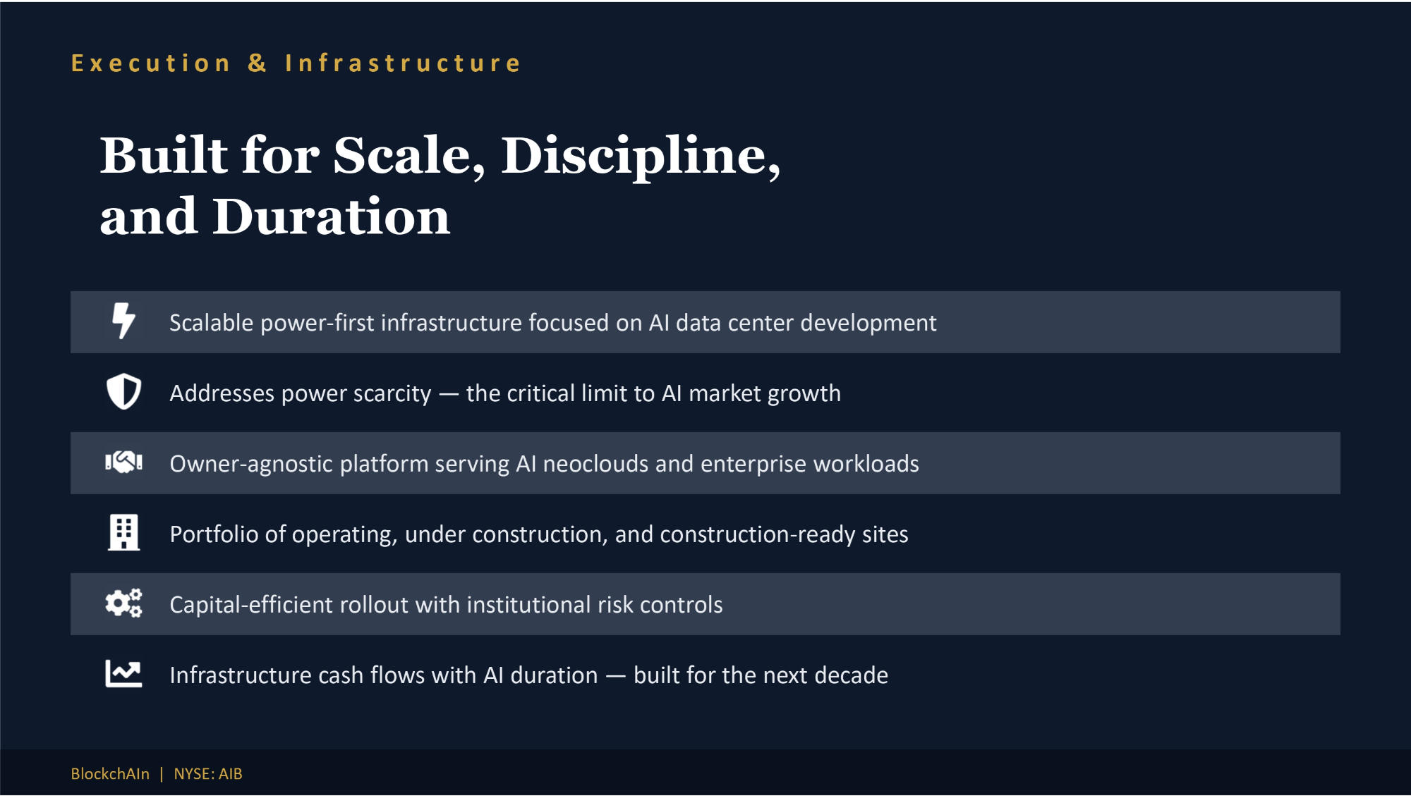 Built for Scale, Discipline, and Duration Scalable power - first infrastructure focused on AI data center development Addresses power scarcity — the critical limit to AI market growth Owner - agnostic platform serving AI neoclouds and enterprise workloads Portfolio of operating, under construction, and construction - ready sites Capital - efficient rollout with institutional risk controls Infrastructure cash flows with AI duration — built for the next decade BlockchAIn | NYSE: AIB Execution & Infrastructure