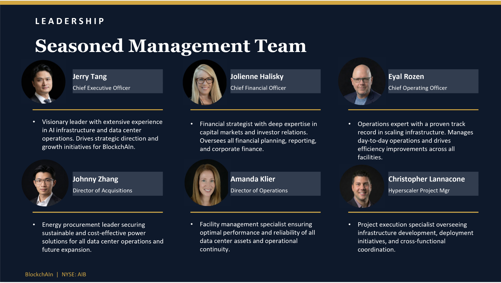 LEADERSHIP Seasoned Management Team Jerry Tang Chief Executive Officer • Visionary leader with extensive experience in AI infrastructure and data center operations. Drives strategic direction and growth initiatives for BlockchAIn. Jolienne Halisky Chief Financial Officer • Financial strategist with deep expertise in capital markets and investor relations. Oversees all financial planning, reporting, and corporate finance. Eyal Rozen Chief Operating Officer • Operations expert with a proven track record in scaling infrastructure. Manages day - to - day operations and drives efficiency improvements across all facilities. Johnny Zhang Director of Acquisitions • Energy procurement leader securing sustainable and cost - effective power solutions for all data center operations and future expansion. Amanda Klier Director of Operations • Facility management specialist ensuring optimal performance and reliability of all data center assets and operational continuity. BlockchAIn | NYSE: AIB Christopher Lannacone Hyperscaler Project Mgr • Project execution specialist overseeing infrastructure development, deployment initiatives, and cross - functional coordination.