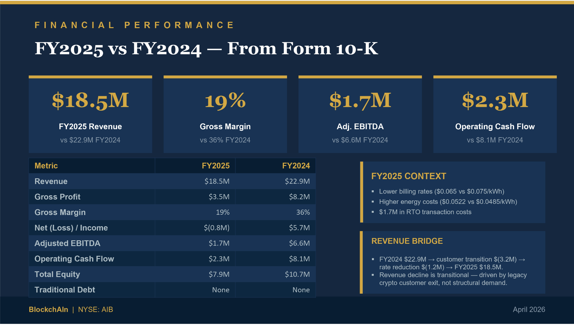 F I N A N C I A L P E R F O R M A N C E FY2025 vs FY2024 — From Form 10 - K $18.5M FY2025 Revenue vs $22.9M FY2024 19% Gross Margin vs 36% FY2024 $1.7M Adj. EBITDA vs $6.6M FY2024 $2.3M Operating Cash Flow vs $8.1M FY2024 FY2024 FY2025 Metric $22.9M $18.5M Revenue $8.2M $3.5M Gross Profit 36% 19% Gross Margin $5.7M $(0.8M) Net (Loss) / Income $6.6M $1.7M Adjusted EBITDA $8.1M $2.3M Operating Cash Flow $10.7M $7.9M Total Equity None None Traditional Debt FY2025 CONTEXT ▪ Lower billing rates ($0.065 vs $0.075/kWh) ▪ Higher energy costs ($0.0522 vs $0.0485/kWh) ▪ $1.7M in RTO transaction costs REVENUE BRIDGE ▪ FY2024 $22.9M → customer transition $(3.2M) → rate reduction $(1.2M) → FY2025 $18.5M. ▪ Revenue decline is transitional — driven by legacy crypto customer exit, not structural demand. BlockchAIn | NYSE: AIB April 2026