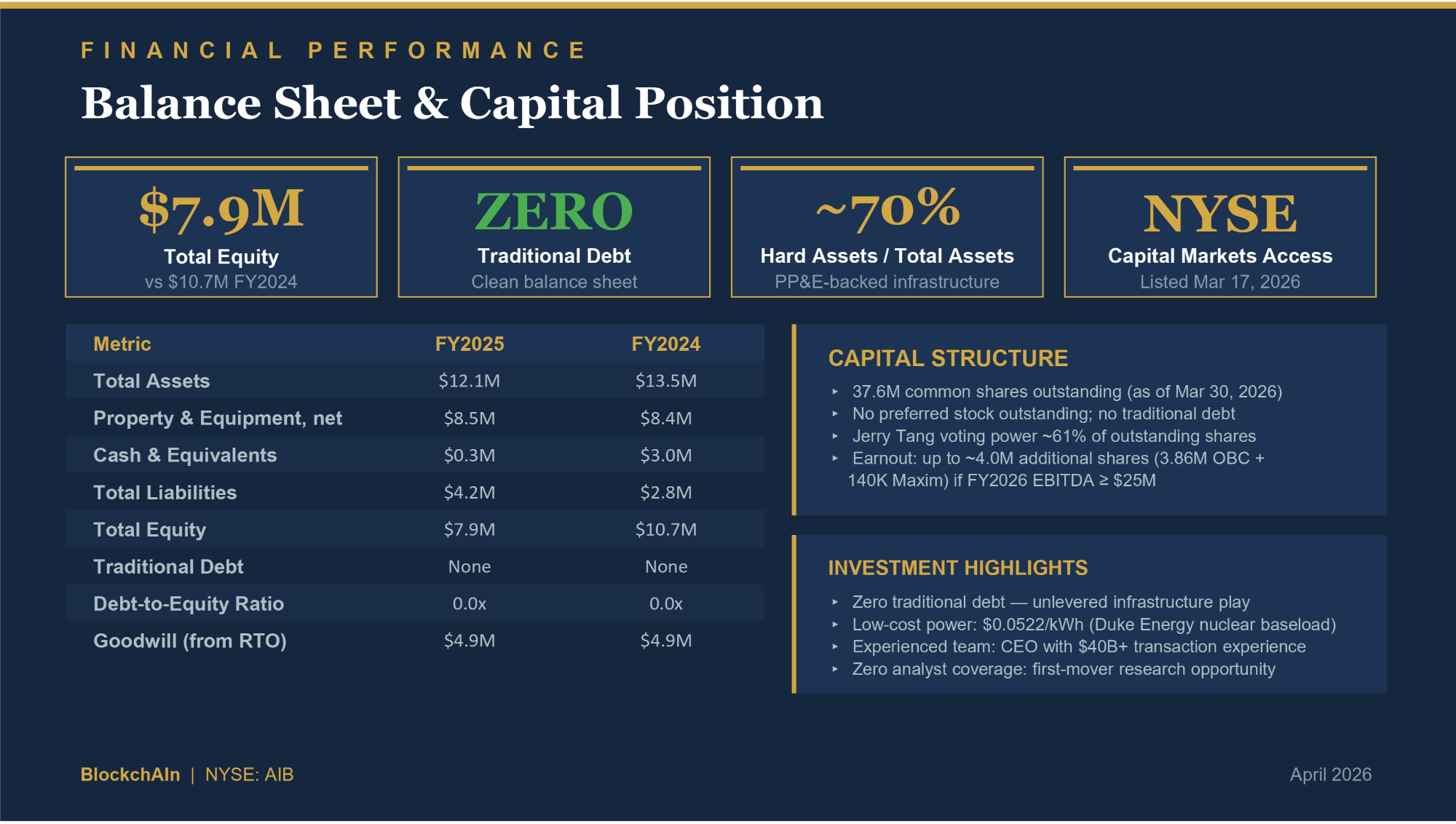 F I N A N C I A L P E R F O R M A N C E Balance Sheet & Capital Position $7.9M Total Equity vs $10.7M FY2024 ZERO Traditional Debt Clean balance sheet ~70% Hard Assets / Total Assets PP&E - backed infrastructure NYSE Capital Markets Access Listed Mar 17, 2026 Metric Total Assets Property & Equipment, net FY2025 FY2024 $12.1M $13.5M $8.5M $8.4M Cash & Equivalents $0.3M $3.0M Total Liabilities $4.2M $2.8M Total Equity $7.9M $10.7M Traditional Debt None None Debt - to - Equity Ratio 0.0x 0.0x Goodwill (from RTO) $4.9M $4.9M CAPITAL STRUCTURE ᶡ 37.6M common shares outstanding (as of Mar 30, 2026) ᶡ No preferred stock outstanding; no traditional debt ᶡ Jerry Tang voting power ~61% of outstanding shares ᶡ Earnout: up to ~4.0M additional shares (3.86M OBC + 140K Maxim) if FY2026 EBITDA ≥ $25M INVESTMENT HIGHLIGHTS ᶡ Zero traditional debt — unlevered infrastructure play ᶡ Low - cost power: $0.0522/kWh (Duke Energy nuclear baseload) ᶡ Experienced team: CEO with $40B+ transaction experience ᶡ Zero analyst coverage: first - mover research opportunity BlockchAIn | NYSE: AIB April 2026