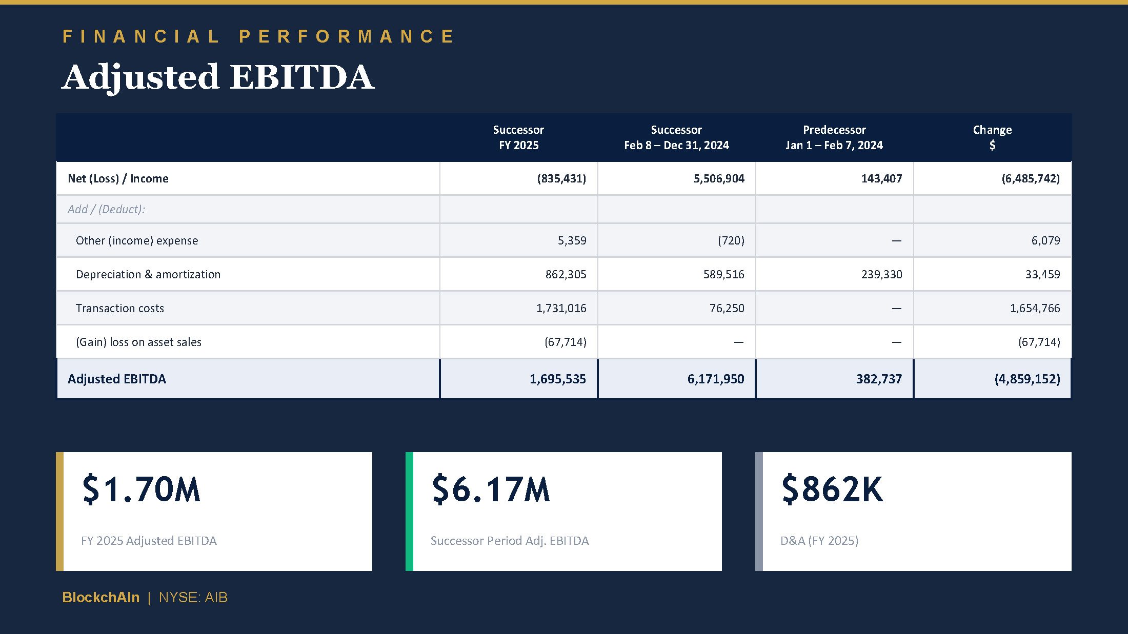 F I N A N C I A L P E R F O R M A N C E Adjusted EBITDA Reconciliation of GAAP Net Loss to Adjusted EBITDA Change Predecessor Successor $ Period from January 1, 2024 to February 7, 2024 Year ended Period from February 8, December 31, 2024 to 2025 December 31, 2024 (6,485,742) 143,407 (835,431) 5,506,904 NET (LOSS)/INCOME Add/(Deduct): 6,079 - 5,359 (720) Other (income) expense 33,459 239,330 862,305 589,516 Depreciation and amortization 1,654,766 - 1,731,016 76,250 Transaction costs (67,714) - (67,714) - (Gain) loss on asset sales (4,859,152) 382,737 1,695,535 6,171,950 ADJUSTED EBITDA BlockchAIn | NYSE: AIB April 2026