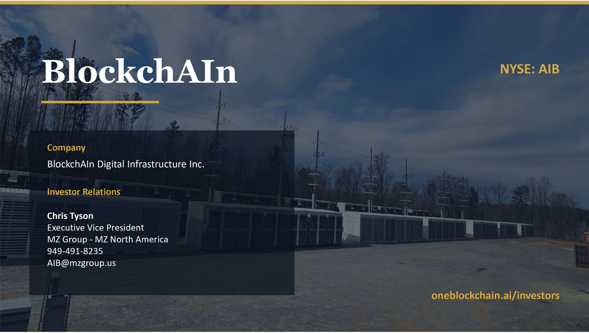 BlockchAIn Company BlockchAIn Digital Infrastructure Inc. Investor Relations Chris Tyson Executive Vice President MZ Group - MZ North America 949 - 491 - 8235 AIB@mzgroup.us oneblockchain.ai/investors NYSE: AIB