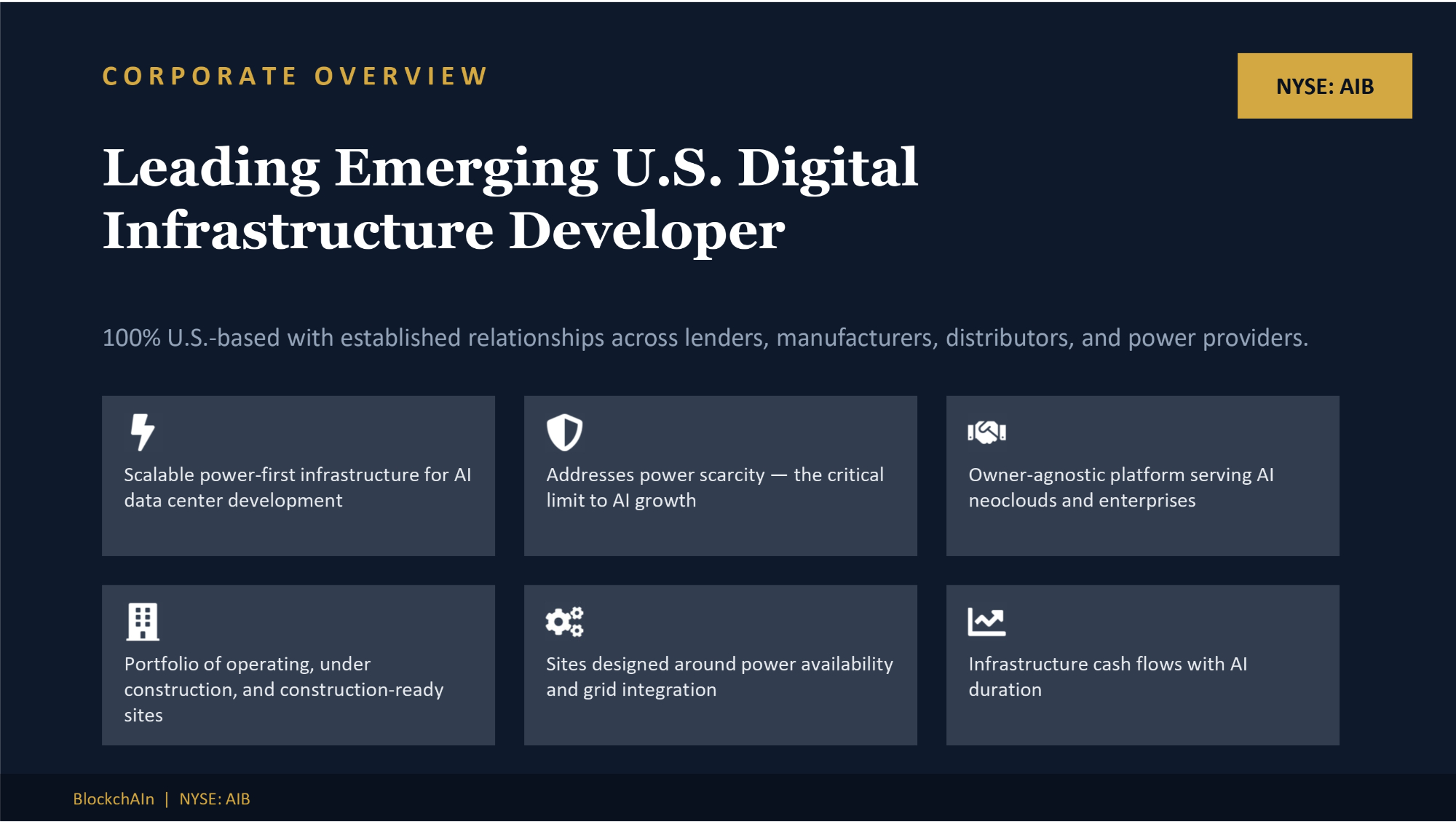 CORPORATE OVERVIEW Leading Emerging U.S. Digital Infrastructure Developer 100% U.S. - based with established relationships across lenders, manufacturers, distributors, and power providers. Scalable power - first infrastructure for AI data center development Addresses power scarcity — the critical limit to AI growth Owner - agnostic platform serving AI neoclouds and enterprises Portfolio of operating, under construction, and construction - ready sites Sites designed around power availability and grid integration Infrastructure cash flows with AI duration NYSE: AIB BlockchAIn | NYSE: AIB