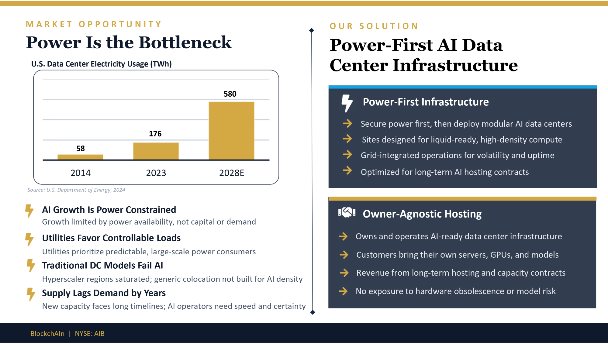 M A R K E T O P P O R T U N I T Y Power Is the Bottleneck U.S. Data Center Electricity Usage (TWh) 58 176 580 2023 2028E 2014 Source: U.S. Department of Energy, 2024 AI Growth Is Power Constrained Growth limited by power availability, not capital or demand Utilities Favor Controllable Loads Utilities prioritize predictable, large - scale power consumers Traditional DC Models Fail AI Hyperscaler regions saturated; generic colocation not built for AI density Supply Lags Demand by Years New capacity faces long timelines; AI operators need speed and certainty O U R S O L U T I O N Power - First AI Data Center Infrastructure Power - First Infrastructure Secure power first, then deploy modular AI data centers Sites designed for liquid - ready, high - density compute Grid - integrated operations for volatility and uptime Optimized for long - term AI hosting contracts Owner - Agnostic Hosting Owns and operates AI - ready data center infrastructure Customers bring their own servers, GPUs, and models Revenue from long - term hosting and capacity contracts No exposure to hardware obsolescence or model risk BlockchAIn | NYSE: AIB