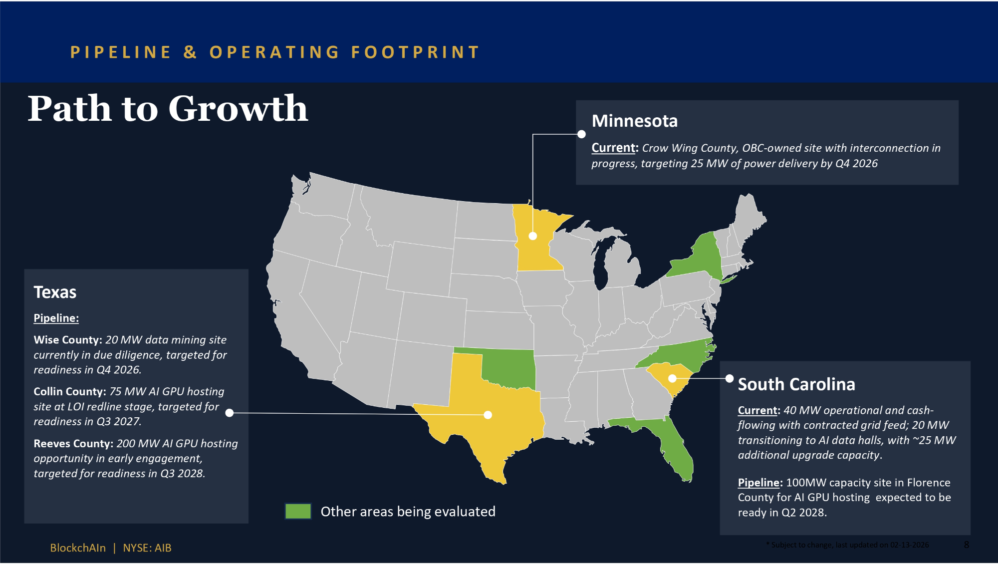 Path to Growth Minnesota Current : Crow Wing County, OBC - owned site with interconnection in progress, targeting 25 MW of power delivery by Q4 2026 South Carolina Current: 40 MW operational and cash - flowing with contracted grid feed; 20 MW transitioning to AI data halls, with ~25 MW additional upgrade capacity . Pipeline : 100 MW capacity site in Florence County for AI GPU hosting expected to be ready in Q 2 2028 . PIPELINE & OPERATING FOOTPRINT Texas Pipeline: Wise County : 20 MW data mining site currently in due diligence, targeted for readiness in Q 4 2026 . Collin County: 75 MW AI GPU hosting site at LOI redline stage, targeted for readiness in Q3 2027. Reeves County: 200 MW AI GPU hosting opportunity in early engagement, targeted for readiness in Q3 2028. Other areas being evaluated 8 BlockchAIn | NYSE: AIB * Subject to change, last updated on 02 - 13 - 2026