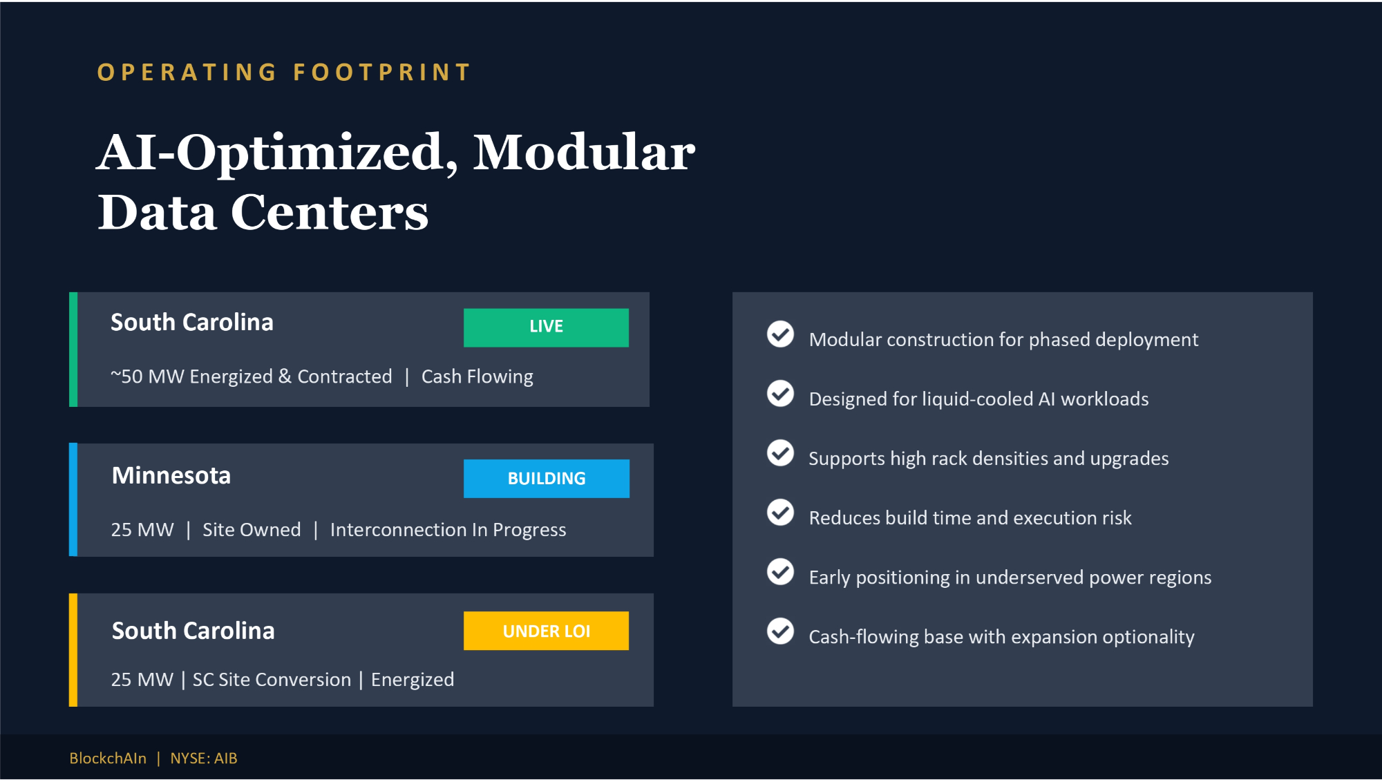 OPERATING FOOTPRINT AI - Optimized, Modular Data Centers South Carolina ~50 MW Energized & Contracted | Cash Flowing Minnesota 25 MW | Site Owned | Interconnection In Progress BUILDING Modular construction for phased deployment Designed for liquid - cooled AI workloads Supports high rack densities and upgrades Reduces build time and execution risk Early positioning in underserved power regions Cash - flowing base with expansion optionality LIVE BlockchAIn | NYSE: AIB UNDER LOI South Carolina 25 MW | SC Site Conversion | Energized