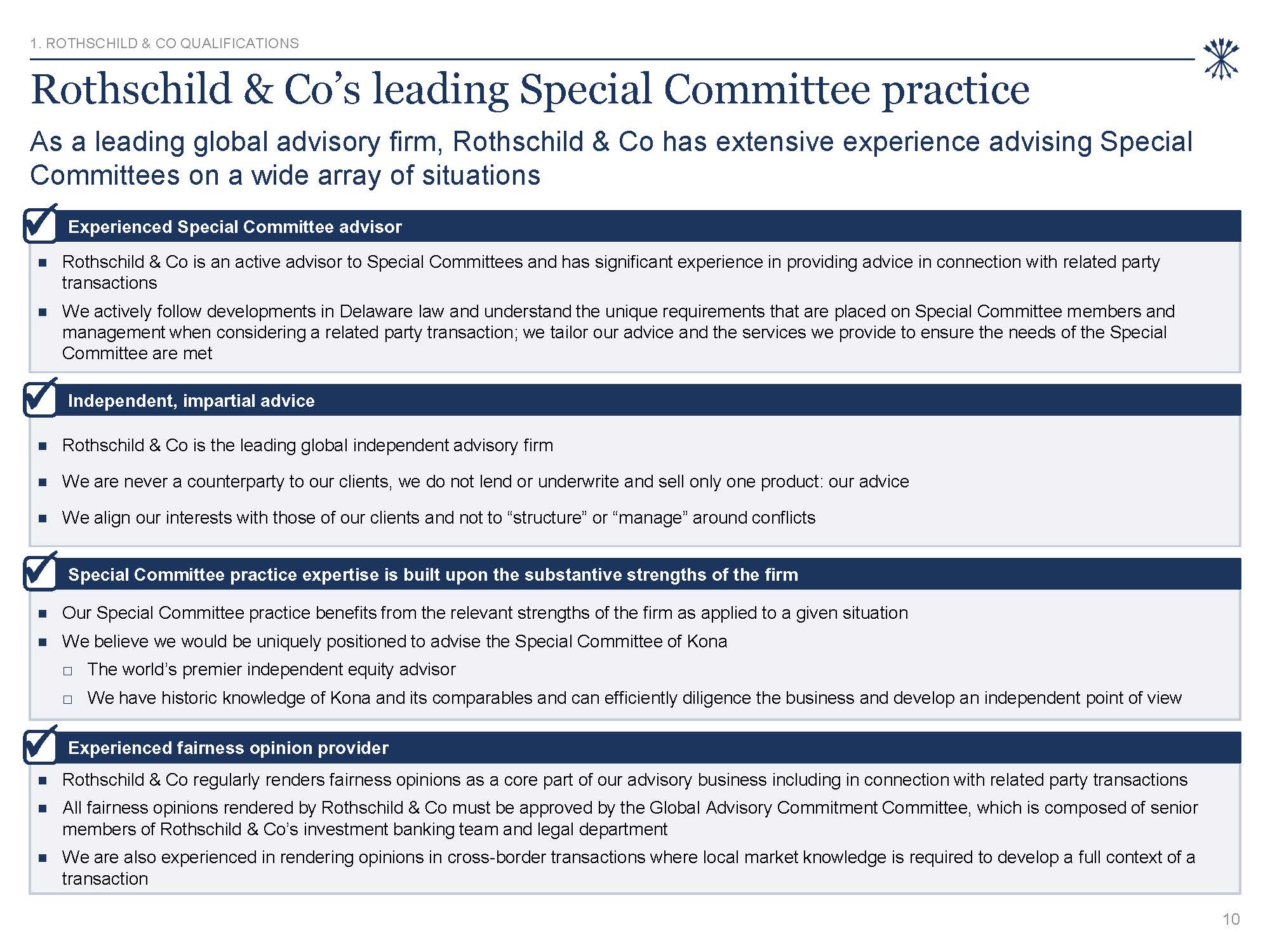 Rothschild & Co’s leading Special Committee practice  Rothschild & Co is an active advisor to Special Committees and has significant experience in providing advice in connection with related party transactions  We actively follow developments in Delaware law and understand the unique requirements that are placed on Special Committee members and management when considering a related party transaction; we tailor our advice and the services we provide to ensure the needs of the Special Committee are met  Rothschild & Co is the leading global independent advisory firm  We are never a counterparty to our clients, we do not lend or underwrite and sell only one product: our advice  We align our interests with those of our clients and not to “structure” or “manage” around conflicts  Our Special Committee practice benefits from the relevant strengths of the firm as applied to a given situation  We believe we would be uniquely positioned to advise the Special Committee of Kona  The world’s premier independent equity advisor  We have historic knowledge of Kona and its comparables and can efficiently diligence the business and develop an independent point of view  Rothschild & Co regularly renders fairness opinions as a core part of our advisory business including in connection with related party transactions  All fairness opinions rendered by Rothschild & Co must be approved by the Global Advisory Commitment Committee, which is composed of senior members of Rothschild & Co’s investment banking team and legal department  We are also experienced in rendering opinions in cross-border transactions where local market knowledge is required to develop a full context of a  transaction  Long established global presence – 200+ year history  As a leading global advisory firm, Rothschild & Co has extensive experience advising Special  Committees on a wide array of situations  Experienced Special Committee advisor  Experienced fairness opinion provider  Special Committee practice expertise is built upon the substantive strengths of the firm  Independent, impartial advice  1. ROTHSCHILD & CO QUALIFICATIONS  10