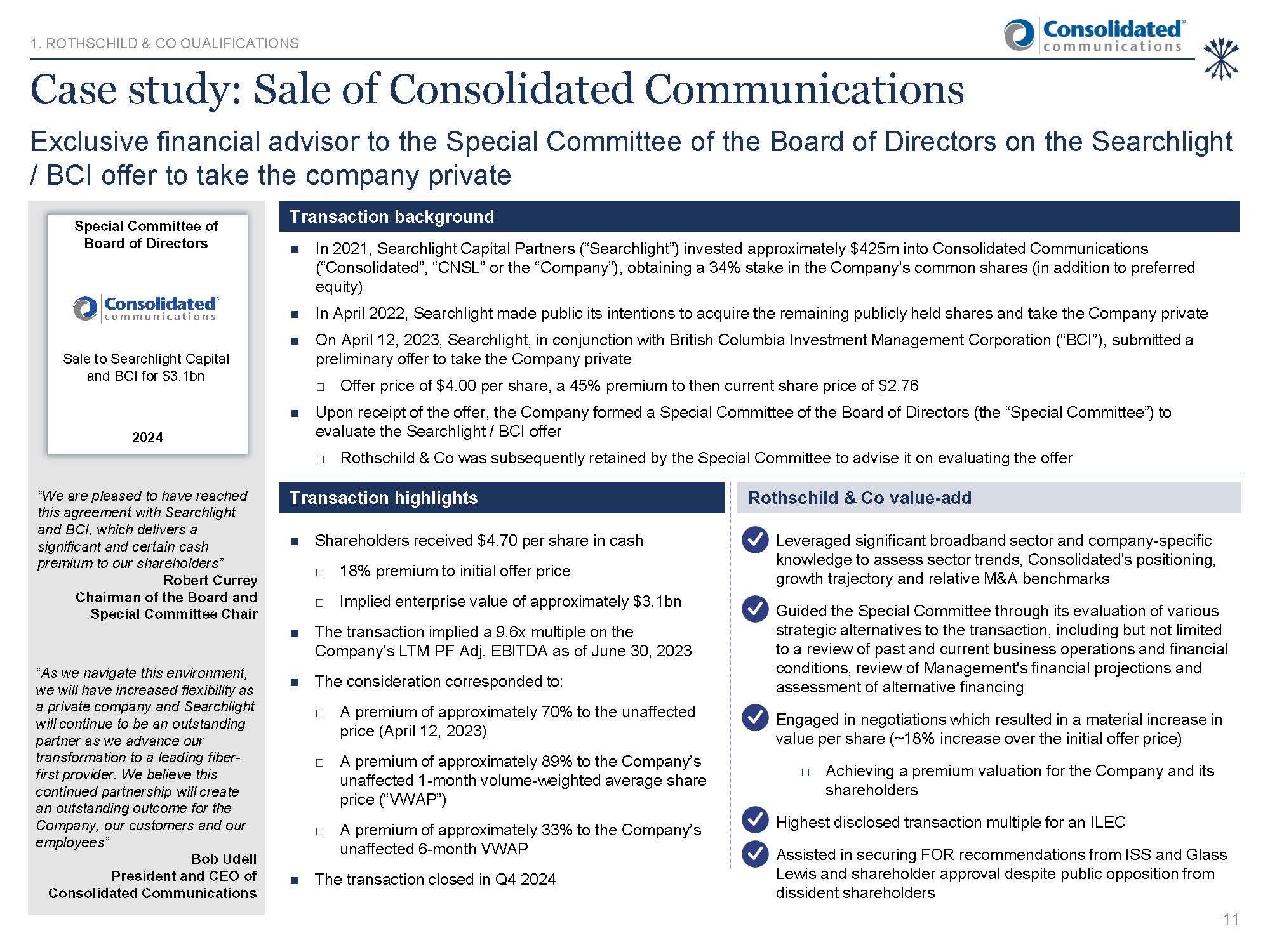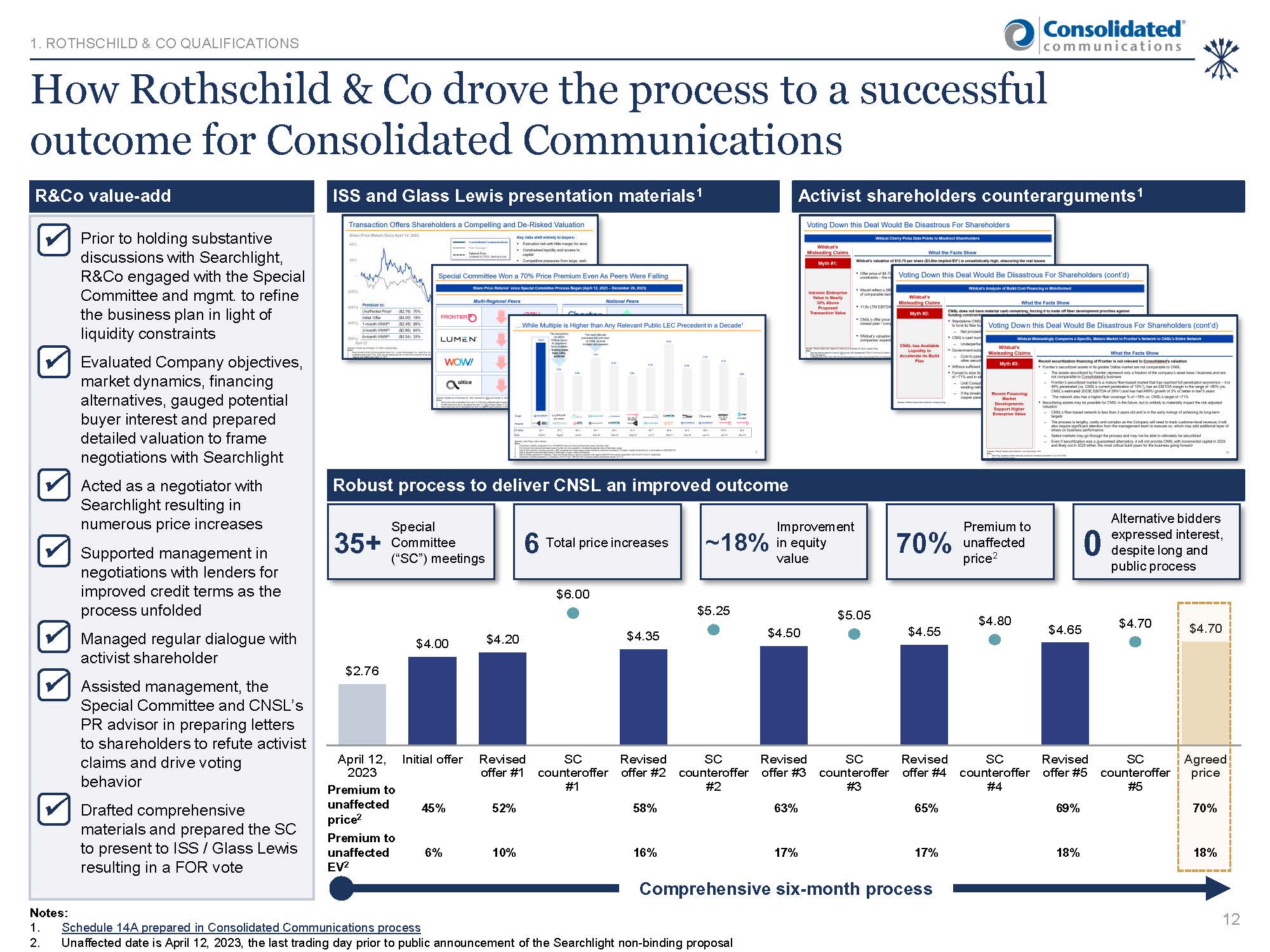Case study: Sale of Consolidated Communications  Exclusive financial advisor to the Special Committee of the Board of Directors on the Searchlight  / BCI offer to take the company private  Transaction background  Transaction highlights  Shareholders received $4.70 per share in cash  18% premium to initial offer price  Implied enterprise value of approximately $3.1bn  The transaction implied a 9.6x multiple on the  Company’s LTM PF Adj. EBITDA as of June 30, 2023  The consideration corresponded to:  A premium of approximately 70% to the unaffected price (April 12, 2023)  A premium of approximately 89% to the Company’s unaffected 1-month volume-weighted average share price (“VWAP”)  A premium of approximately 33% to the Company’s  unaffected 6-month VWAP  The transaction closed in Q4 2024  In 2021, Searchlight Capital Partners (“Searchlight”) invested approximately $425m into Consolidated Communications (“Consolidated”, “CNSL” or the “Company”), obtaining a 34% stake in the Company’s common shares (in addition to preferred equity)  In April 2022, Searchlight made public its intentions to acquire the remaining publicly held shares and take the Company private  On April 12, 2023, Searchlight, in conjunction with British Columbia Investment Management Corporation (“BCI”), submitted a preliminary offer to take the Company private  Offer price of $4.00 per share, a 45% premium to then current share price of $2.76  Upon receipt of the offer, the Company formed a Special Committee of the Board of Directors (the “Special Committee”) to evaluate the Searchlight / BCI offer  Rothschild & Co was subsequently retained by the Special Committee to advise it on evaluating the offer  Rothschild & Co value-add  Special Committee of Board of Directors  Sale to Searchlight Capital and BCI for $3.1bn  2024  “We are pleased to have reached this agreement with Searchlight and BCI, which delivers a significant and certain cash premium to our shareholders”  Robert Currey Chairman of the Board and Special Committee Chair  “As we navigate this environment, we will have increased flexibility as a private company and Searchlight will continue to be an outstanding partner as we advance our transformation to a leading fiber-first provider. We believe this continued partnership will create an outstanding outcome for the Company, our customers and our employees”  Bob Udell President and CEO of Consolidated Communications  Leveraged significant broadband sector and company-specific knowledge to assess sector trends, Consolidated's positioning, growth trajectory and relative M&A benchmarks  Guided the Special Committee through its evaluation of various strategic alternatives to the transaction, including but not limited to a review of past and current business operations and financial conditions, review of Management's financial projections and assessment of alternative financing  Engaged in negotiations which resulted in a material increase in value per share (~18% increase over the initial offer price)  Achieving a premium valuation for the Company and its shareholders  Highest disclosed transaction multiple for an ILEC  Assisted in securing FOR recommendations from ISS and Glass Lewis and shareholder approval despite public opposition from dissident shareholders  11  1. ROTHSCHILD & CO QUALIFICATIONS