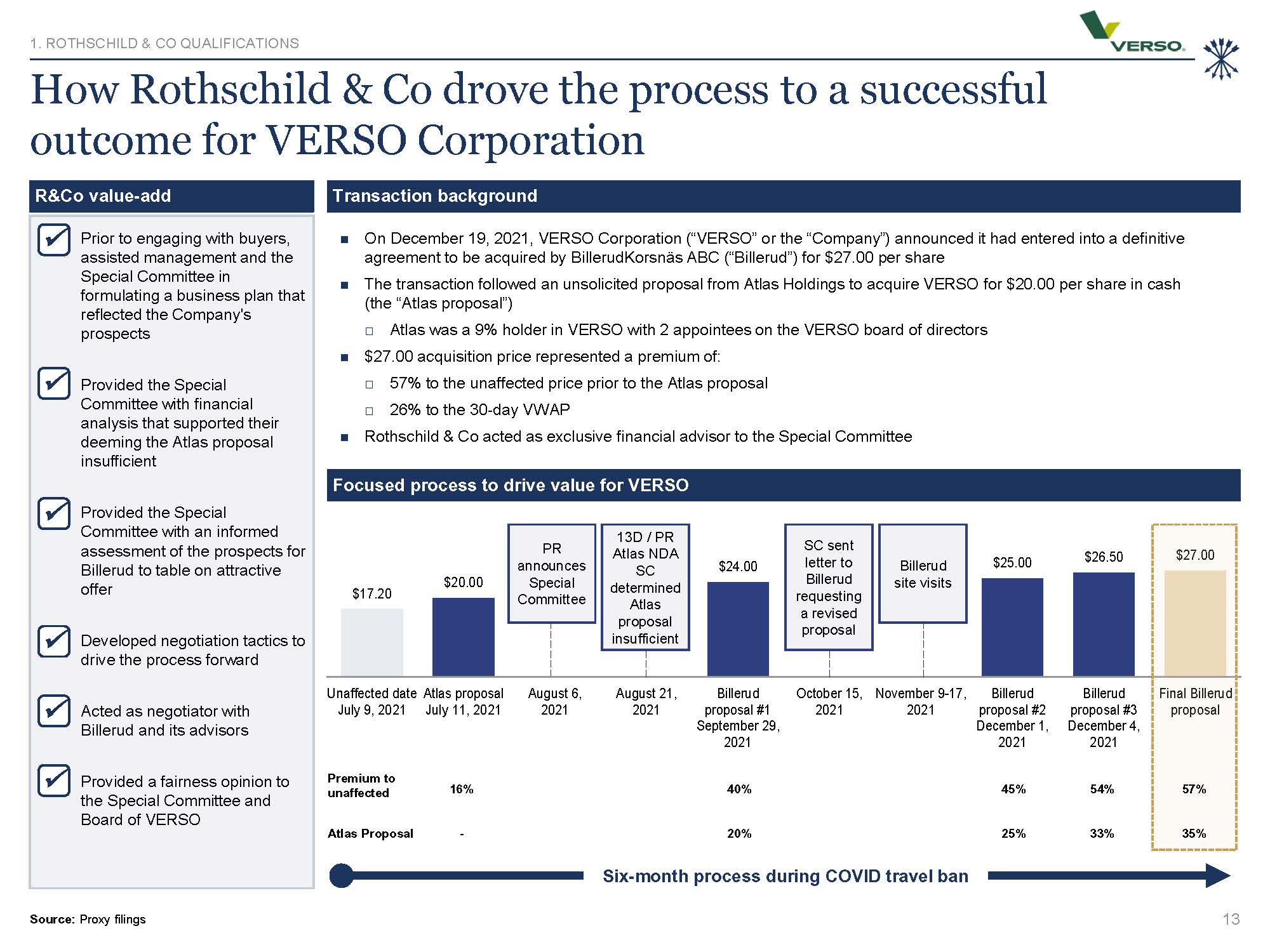$17.20  $20.00  $24.00  $25.00  $26.50  $27.00  Unaffected date Atlas proposal July 9, 2021 July 11, 2021  August 6, August 21,  2021 2021  September 29,  2021  Billerud October 15, November 9-17,  proposal #1 2021 2021  Billerud proposal #2  December 1,  2021  Billerud proposal #3  December 4,  2021  Final Billerud proposal  PR  announces Special Committee  On December 19, 2021, VERSO Corporation (“VERSO” or the “Company”) announced it had entered into a definitive agreement to be acquired by BillerudKorsnäs ABC (“Billerud”) for $27.00 per share  The transaction followed an unsolicited proposal from Atlas Holdings to acquire VERSO for $20.00 per share in cash (the “Atlas proposal”)  Atlas was a 9% holder in VERSO with 2 appointees on the VERSO board of directors  $27.00 acquisition price represented a premium of:  57% to the unaffected price prior to the Atlas proposal  26% to the 30-day VWAP  Rothschild & Co acted as exclusive financial advisor to the Special Committee  13D / PR  Atlas NDA SC  determined Atlas proposal insufficient  How Rothschild & Co drove the process to a successful outcome for VERSO Corporation  Source: Proxy filings  R&Co value-add  Prior to engaging with buyers, assisted management and the Special Committee in formulating a business plan that reflected the Company's prospects  Provided the Special Committee with financial analysis that supported their deeming the Atlas proposal insufficient  Provided the Special Committee with an informed assessment of the prospects for Billerud to table on attractive offer  Developed negotiation tactics to drive the process forward  Acted as negotiator with Billerud and its advisors  Provided a fairness opinion to the Special Committee and Board of VERSO  Transaction background  Focused process to drive value for VERSO  Six-month process during COVID travel ban  Premium to  unaffected  16%  40%  45%  54%  57%  Atlas Proposal  -  20%  25%  33%  35%  SC sent letter to Billerud requesting a revised proposal  Billerud site visits  1. ROTHSCHILD & CO QUALIFICATIONS  13