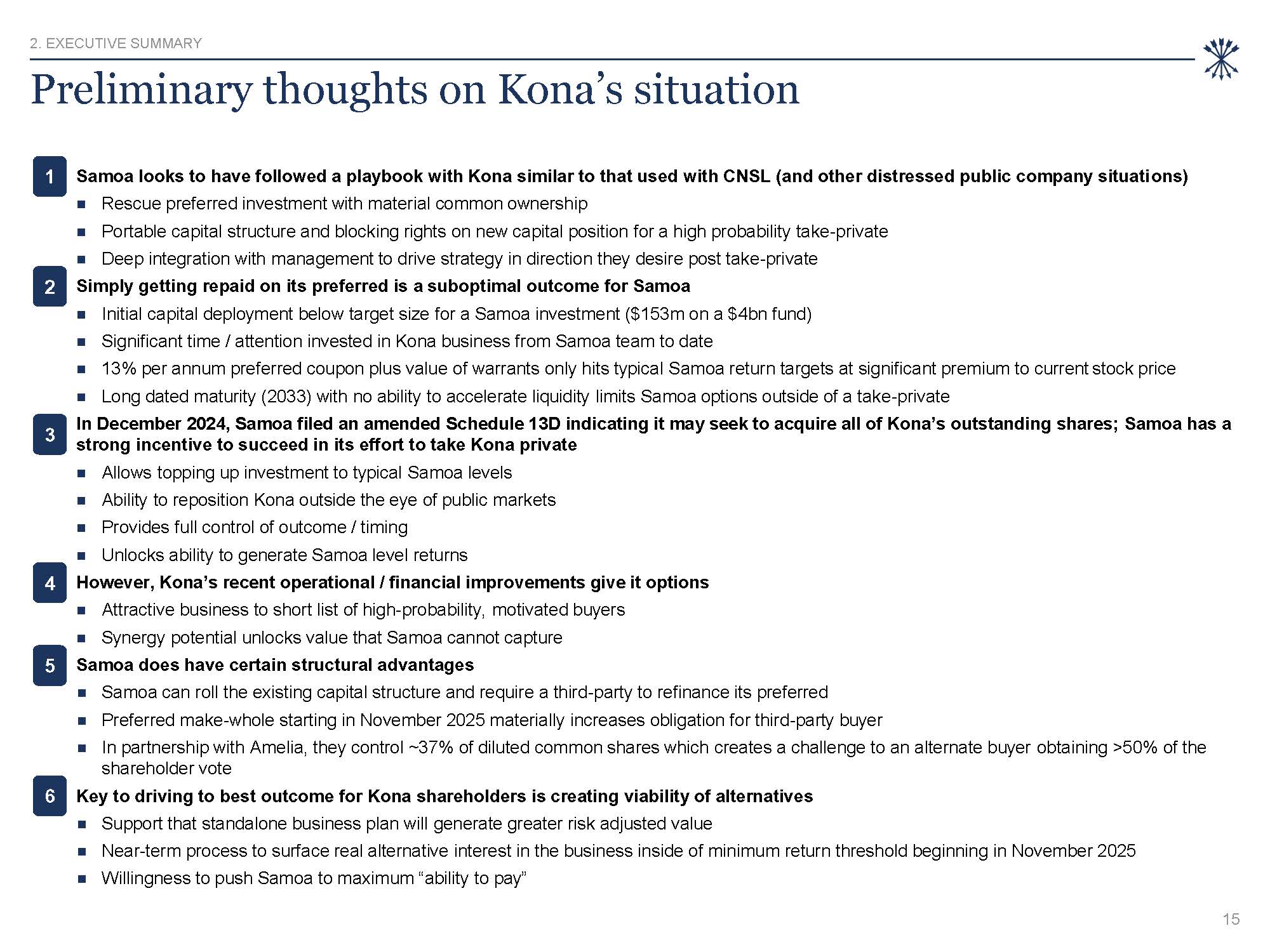 Preliminary thoughts on Kona’s situation  Samoa looks to have followed a playbook with Kona similar to that used with CNSL (and other distressed public company situations)  Rescue preferred investment with material common ownership  Portable capital structure and blocking rights on new capital position for a high probability take-private  Deep integration with management to drive strategy in direction they desire post take-private  Simply getting repaid on its preferred is a suboptimal outcome for Samoa  Initial capital deployment below target size for a Samoa investment ($153m on a $4bn fund)  Significant time / attention invested in Kona business from Samoa team to date  13% per annum preferred coupon plus value of warrants only hits typical Samoa return targets at significant premium to current stock price  Long dated maturity (2033) with no ability to accelerate liquidity limits Samoa options outside of a take-private  In December 2024, Samoa filed an amended Schedule 13D indicating it may seek to acquire all of Kona’s outstanding shares; Samoa has a strong incentive to succeed in its effort to take Kona private  Allows topping up investment to typical Samoa levels  Ability to reposition Kona outside the eye of public markets  Provides full control of outcome / timing  Unlocks ability to generate Samoa level returns  However, Kona’s recent operational / financial improvements give it options  Attractive business to short list of high-probability, motivated buyers  Synergy potential unlocks value that Samoa cannot capture  Samoa does have certain structural advantages  Samoa can roll the existing capital structure and require a third-party to refinance its preferred  Preferred make-whole starting in November 2025 materially increases obligation for third-party buyer  In partnership with Amelia, they control ~37% of diluted common shares which creates a challenge to an alternate buyer obtaining >50% of the shareholder vote  Key to driving to best outcome for Kona shareholders is creating viability of alternatives  Support that standalone business plan will generate greater risk adjusted value  Near-term process to surface real alternative interest in the business inside of minimum return threshold beginning in November 2025  Willingness to push Samoa to maximum “ability to pay”  3  2  1  4  5  6  2. EXECUTIVE SUMMARY  15