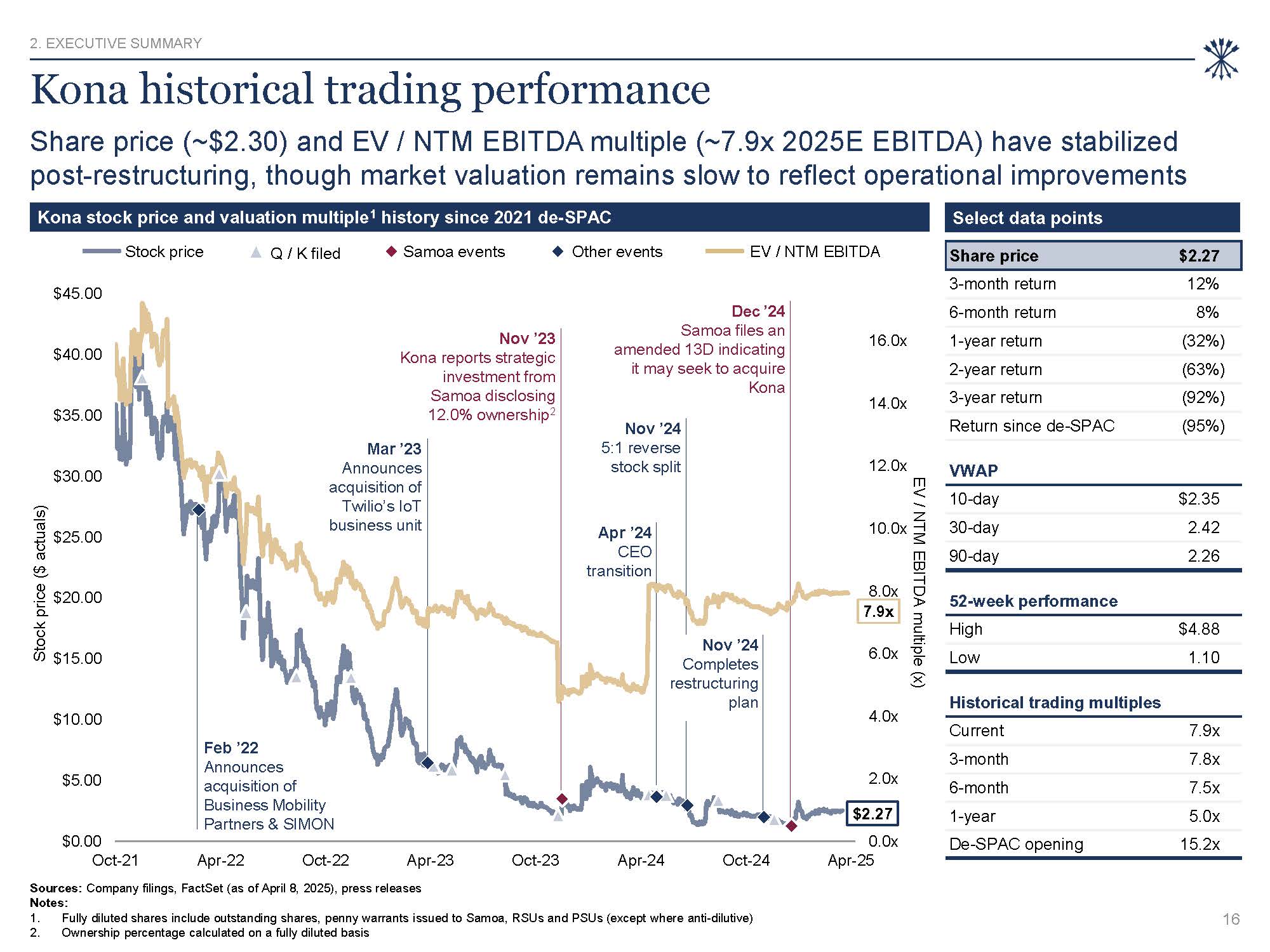 Nov ’24  5:1 reverse stock split  Nov ’24 Completes restructuring  plan  Kona historical trading performance  Share price (~$2.30) and EV / NTM EBITDA multiple (~7.9x 2025E EBITDA) have stabilized  post-restructuring, though market valuation remains slow to reflect operational improvements  Sources: Company filings, FactSet (as of April 8, 2025), press releases  Notes:  Fully diluted shares include outstanding shares, penny warrants issued to Samoa, RSUs and PSUs (except where anti-dilutive)  Ownership percentage calculated on a fully diluted basis  Kona stock price and valuation multiple1 history since 2021 de-SPAC  Stock price ($ actuals)  EV / NTM EBITDA multiple (x)  Select data points  Nov ’23 Kona reports strategic investment from Samoa disclosing 12.0% ownership2  Dec ’24 Samoa files an amended 13D indicating it may seek to acquire  Kona  Apr ’24  CEO  transition  Feb ’22 Announces acquisition of Business Mobility Partners & SIMON  Mar ’23 Announces acquisition of Twilio’s IoT business unit  Stock price  Q / K filed  Samoa events  Other events  EV / NTM EBITDA  Share price  $2.27  3-month return  12%  3-year return  (92%)  Return since de-SPAC  (95%)  VWAP  10-day  $2.35  30-day  2.42  90-day  2.26  52-week performance  High  $4.88  Low  1.10  Historical trading multiples  Current  7.9x  3-month  7.8x  6-month  7.5x  1-year  5.0x  De-SPAC opening  15.2x  $2.27  0.0x  2.0x  4.0x  6.0x  8.0x  7.9x  10.0x  12.0x  14.0x  6-month return  8%  16.0x  1-year return  (32%)  2-year return  (63%)  $0.00  $5.00  $10.00  $15.00  $20.00  $25.00  $30.00  $35.00  $40.00  $45.00  Oct-21 Apr-22 Oct-22 Apr-23  Oct-23  Apr-24  Oct-24  Apr-25  2. EXECUTIVE SUMMARY  16
