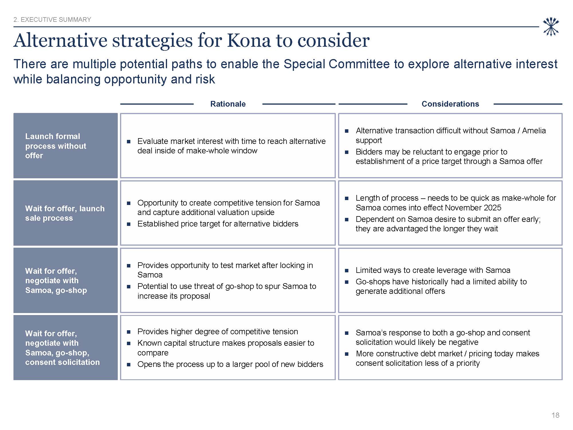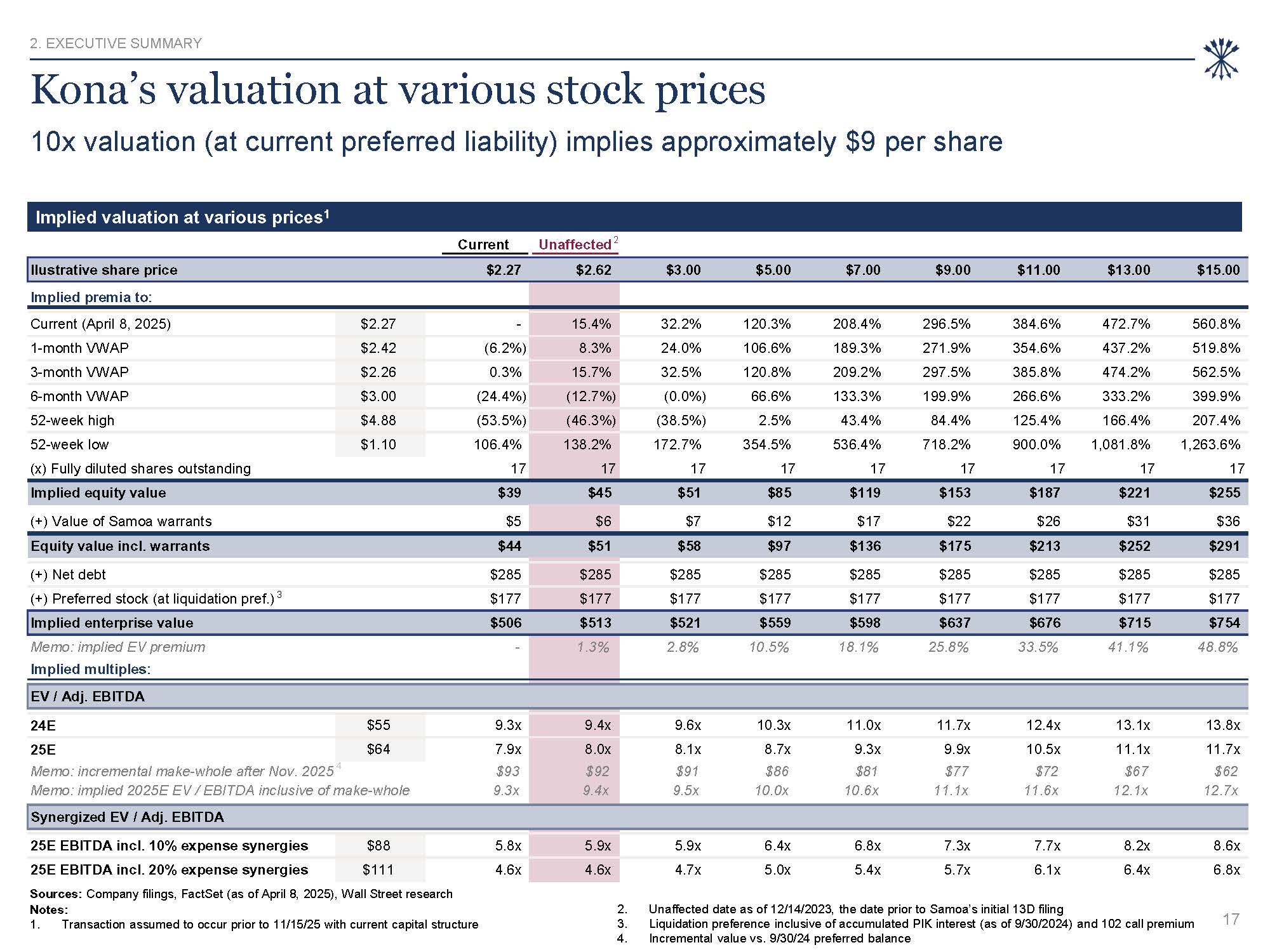 Ilustrative share price  $2.27  $2.62  $3.00  $5.00  $7.00  $9.00  $11.00  $13.00  $15.00  Implied premia to:  Current (April 8, 2025)  $2.27  -  15.4%  32.2%  120.3%  208.4%  296.5%  384.6%  472.7%  560.8%  1-month VWAP  $2.42  (6.2%)  8.3%  24.0%  106.6%  189.3%  271.9%  354.6%  437.2%  519.8%  3-month VWAP  $2.26  0.3%  15.7%  32.5%  120.8%  209.2%  297.5%  385.8%  474.2%  562.5%  6-month VWAP  $3.00  (24.4%)  (12.7%)  (0.0%)  66.6%  133.3%  199.9%  266.6%  333.2%  399.9%  52-week high  $4.88  (53.5%)  (46.3%)  (38.5%)  2.5%  43.4%  84.4%  125.4%  166.4%  207.4%  52-week low  $1.10  106.4%  138.2%  172.7%  354.5%  536.4%  718.2%  900.0%  1,081.8%  1,263.6%  (x) Fully diluted shares outstanding  17  17  17  17  17  17  17  17  17  Implied equity value  $39  $45  $51  $85  $119  $153  $187  $221  $255  (+) Value of Samoa warrants  $5  $6  $7  $12  $17  $22  $26  $31  $36  Equity value incl. warrants  $44  $51  $58  $97  $136  $175  $213  $252  $291  25E EBITDA incl. 10% expense synergies  $88  5.8x  5.9x  5.9x  6.4x  6.8x  7.3x  7.7x  8.2x  8.6x  25E EBITDA incl. 20% expense synergies  $111  4.6x  4.6x  4.7x  5.0x  5.4x  5.7x  6.1x  6.4x  6.8x  (+) Net debt  $285  $285  $285  $285  $285  $285  $285  $285  $285  (+) Preferred stock (at liquidation pref.) 3  $177  $177  $177  $177  $177  $177  $177  $177  $177  Implied enterprise value  $506  $513  $521  $559  $598  $637  $676  $715  $754  Memo: implied EV premium  Implied multiples:  -  1.3%  2.8%  10.5%  18.1%  25.8%  33.5%  41.1%  48.8%  EV / Adj. EBITDA  24E $55  9.3x  9.4x  9.6x  10.3x  11.0x  11.7x  12.4x  13.1x  13.8x  25E $64  7.9x  8.0x  8.1x  8.7x  9.3x  9.9x  10.5x  11.1x  11.7x  Memo: incremental make-whole after Nov. 2025 4  Memo: implied 2025E EV / EBITDA inclusive of make-whole  $93 9.3x  $92 9.4x  $91 9.5x  $86 10.0x  $81 10.6x  $77 11.1x  $72 11.6x  $67 12.1x  $62 12.7x  Synergized EV / Adj. EBITDA   Current Unaffected 2  Kona’s valuation at various stock prices  10x valuation (at current preferred liability) implies approximately $9 per share  Sources: Company filings, FactSet (as of April 8, 2025), Wall Street research  Notes:  1. Transaction assumed to occur prior to 11/15/25 with current capital structure  Unaffected date as of 12/14/2023, the date prior to Samoa’s initial 13D filing  Liquidation preference inclusive of accumulated PIK interest (as of 9/30/2024) and 102 call premium  Incremental value vs. 9/30/24 preferred balance  Implied valuation at various prices1  2. EXECUTIVE SUMMARY  17