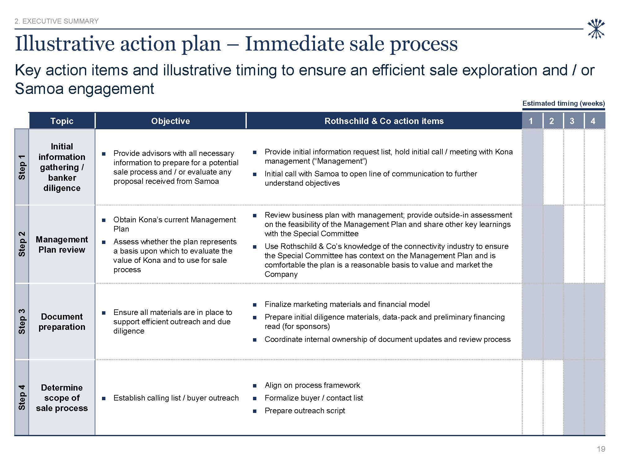 Illustrative action plan – Immediate sale process  Key action items and illustrative timing to ensure an efficient sale exploration and / or Samoa engagement  Estimated timing (weeks)  Topic  Objective  Rothschild & Co action items  1  2  3  4  Step 1  Initial information gathering / banker diligence  Provide advisors with all necessary information to prepare for a potential sale process and / or evaluate any proposal received from Samoa  Provide initial information request list, hold initial call / meeting with Kona management (“Management”)  Initial call with Samoa to open line of communication to further understand objectives  Step 2  Management Plan review  Obtain Kona’s current Management Plan  Assess whether the plan represents a basis upon which to evaluate the value of Kona and to use for sale process  Review business plan with management; provide outside-in assessment on the feasibility of the Management Plan and share other key learnings with the Special Committee  Use Rothschild & Co’s knowledge of the connectivity industry to ensure the Special Committee has context on the Management Plan and is comfortable the plan is a reasonable basis to value and market the Company  Step 3  Document preparation  Ensure all materials are in place to support efficient outreach and due diligence  Finalize marketing materials and financial model  Prepare initial diligence materials, data-pack and preliminary financing read (for sponsors)  Coordinate internal ownership of document updates and review process  Step 4  Determine scope of sale process  Establish calling list / buyer outreach  Align on process framework  Formalize buyer / contact list  Prepare outreach script  2. EXECUTIVE SUMMARY  19