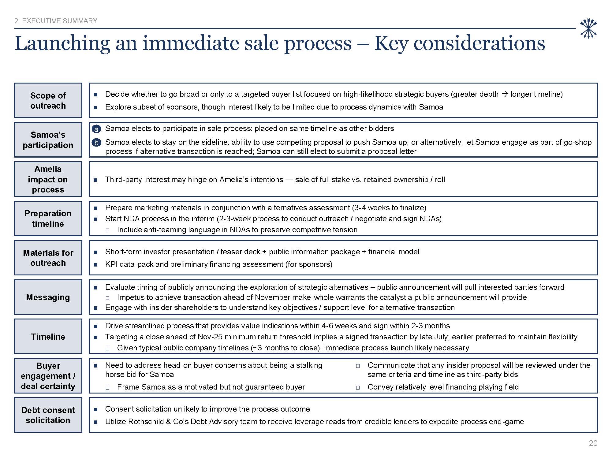 Launching an immediate sale process – Key considerations  Decide whether to go broad or only to a targeted buyer list focused on high-likelihood strategic buyers (greater depth → longer timeline)  Explore subset of sponsors, though interest likely to be limited due to process dynamics with Samoa  Scope of  outreach  Short-form investor presentation / teaser deck + public information package + financial model  KPI data-pack and preliminary financing assessment (for sponsors)  Preparation timeline  Drive streamlined process that provides value indications within 4-6 weeks and sign within 2-3 months  Targeting a close ahead of Nov-25 minimum return threshold implies a signed transaction by late July; earlier preferred to maintain flexibility  □ Given typical public company timelines (~3 months to close), immediate process launch likely necessary  Buyer engagement / deal certainty  Consent solicitation unlikely to improve the process outcome  Utilize Rothschild & Co’s Debt Advisory team to receive leverage reads from credible lenders to expedite process end-game  Debt consent solicitation  Samoa’s participation  a Samoa elects to participate in sale process: placed on same timeline as other bidders  b Samoa elects to stay on the sideline: ability to use competing proposal to push Samoa up, or alternatively, let Samoa engage as part of go-shop process if alternative transaction is reached; Samoa can still elect to submit a proposal letter  Evaluate timing of publicly announcing the exploration of strategic alternatives – public announcement will pull interested parties forward  □ Impetus to achieve transaction ahead of November make-whole warrants the catalyst a public announcement will provide  Engage with insider shareholders to understand key objectives / support level for alternative transaction  Messaging  Materials for outreach  Timeline  Prepare marketing materials in conjunction with alternatives assessment (3-4 weeks to finalize)  Start NDA process in the interim (2-3-week process to conduct outreach / negotiate and sign NDAs)  □ Include anti-teaming language in NDAs to preserve competitive tension  Need to address head-on buyer concerns about being a stalking horse bid for Samoa  □ Frame Samoa as a motivated but not guaranteed buyer  Communicate that any insider proposal will be reviewed under the same criteria and timeline as third-party bids  Convey relatively level financing playing field  Amelia impact on process  Third-party interest may hinge on Amelia’s intentions — sale of full stake vs. retained ownership / roll  2. EXECUTIVE SUMMARY  20
