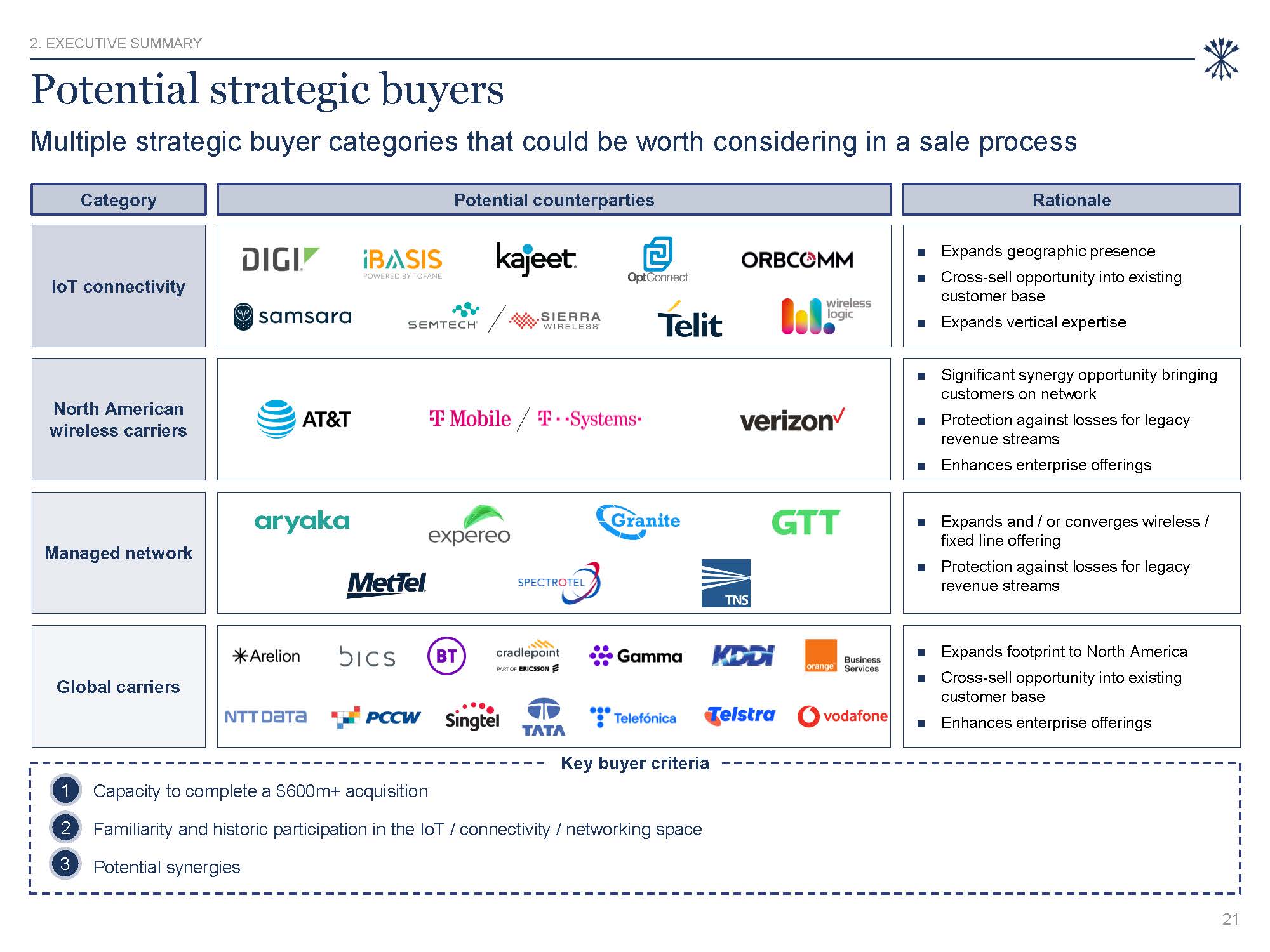 Potential strategic buyers  Rationale  Potential counterparties  Expands footprint to North America  Cross-sell opportunity into existing customer base  Enhances enterprise offerings  Global carriers  IoT connectivity  Expands geographic presence  Cross-sell opportunity into existing customer base  Expands vertical expertise  Significant synergy opportunity bringing customers on network  Protection against losses for legacy revenue streams  Enhances enterprise offerings  North American wireless carriers  Expands and / or converges wireless / fixed line offering  Protection against losses for legacy revenue streams  Managed network  Multiple strategic buyer categories that could be worth considering in a sale process  Category  Key buyer criteria  1 Capacity to complete a $600m+ acquisition  2 Familiarity and historic participation in the IoT / connectivity / networking space  3 Potential synergies  2. EXECUTIVE SUMMARY  21