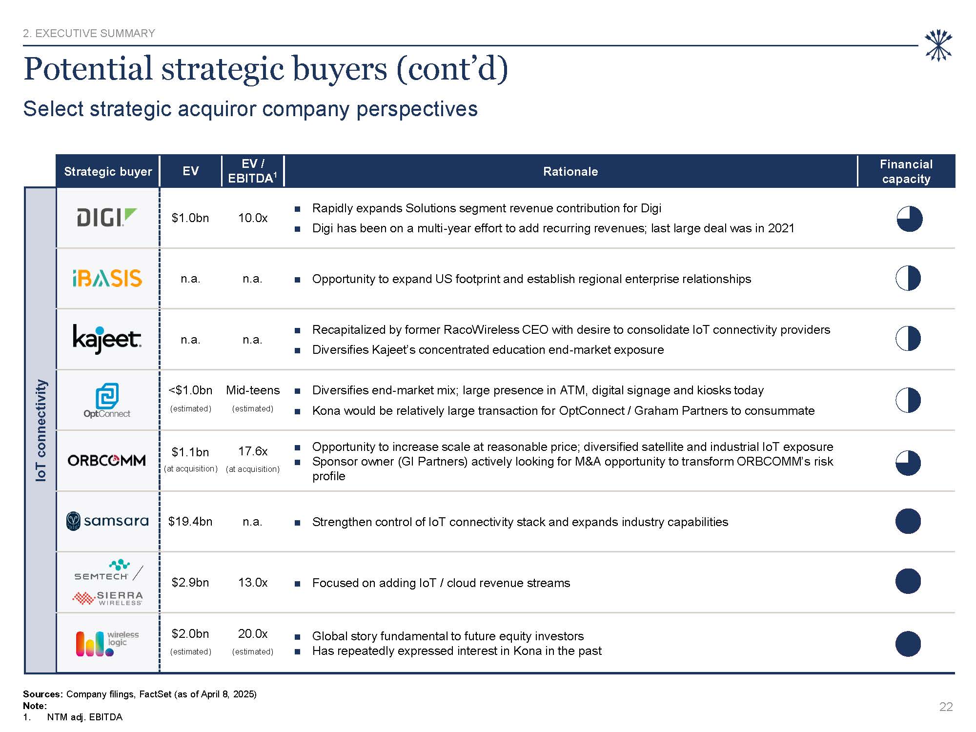 Potential strategic buyers (cont’d)  Select strategic acquiror company perspectives  Strategic buyer  EV  EV / EBITDA1  Rationale  Financial capacity  IoT connectivity  $1.0bn 10.0x  Rapidly expands Solutions segment revenue contribution for Digi  Digi has been on a multi-year effort to add recurring revenues; last large deal was in 2021  n.a. n.a.  Opportunity to expand US footprint and establish regional enterprise relationships  n.a. n.a.  Recapitalized by former RacoWireless CEO with desire to consolidate IoT connectivity providers  Diversifies Kajeet’s concentrated education end-market exposure  <$1.0bn Mid-teens  (estimated) (estimated)  Diversifies end-market mix; large presence in ATM, digital signage and kiosks today  Kona would be relatively large transaction for OptConnect / Graham Partners to consummate  $1.1bn 17.6x  (at acquisition) (at acquisition)  Opportunity to increase scale at reasonable price; diversified satellite and industrial IoT exposure  Sponsor owner (GI Partners) actively looking for M&A opportunity to transform ORBCOMM’s risk profile  $19.4bn n.a.  Strengthen control of IoT connectivity stack and expands industry capabilities  $2.9bn 13.0x  Focused on adding IoT / cloud revenue streams  $2.0bn 20.0x  (estimated) (estimated)  Global story fundamental to future equity investors  Has repeatedly expressed interest in Kona in the past  Sources: Company filings, FactSet (as of April 8, 2025)  Note:  1. NTM adj. EBITDA  2. EXECUTIVE SUMMARY  22